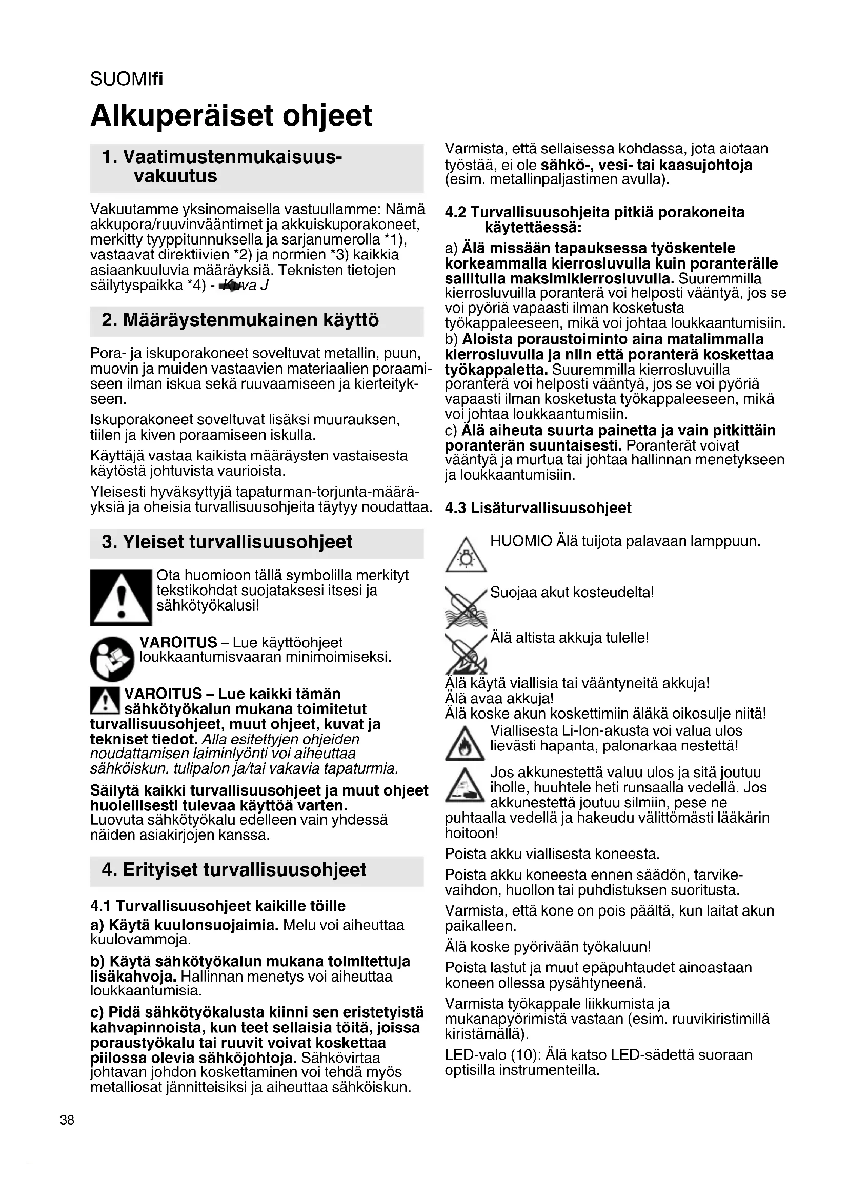 Vakuutamme yksinomaisella vastuullamme: Nämä akkupora/ruuvinvääntimet ja akkuiskuporakoneet, merkitty tyyppitunnuksella ja sarjanumerolla *1), vastaavat direktiivien *2) ja normien *3) kaikkia asiaankuuluvia määräyksiä. Teknisten tietojen säilytyspaikka *4) - Kuva J Pora- ja iskuporakoneet soveltuvat metallin, puun, muovin ja muiden vastaavien materiaalien poraami- seen ilman iskua sekä ruuvaamiseen ja kierteityk- seen. Iskuporakoneet soveltuvat lisäksi muurauksen, tiilen ja kiven poraamiseen iskulla. Käyttäjä vastaa kaikista määräysten vastaisesta käytöstä johtuvista vaurioista. Yleisesti hyväksyttyjä tapaturman-torjunta-määrä- yksiä ja oheisia turvallisuusohjeita täytyy noudattaa. Ota huomioon tällä symbolilla merkityt tekstikohdat suojataksesi itsesi ja sähkötyökalusi! VAROITUS – Lue käyttöohjeet loukkaantumisvaaran minimoimiseksi. VAROITUS – Lue kaikki tämän sähkötyökalun mukana toimitetut turvallisuusohjeet, muut ohjeet, kuvat ja tekniset tiedot. Alla esitettyjen ohjeiden noudattamisen laiminlyönti voi aiheuttaa sähköiskun, tulipalon ja/tai vakavia tapaturmia. Säilytä kaikki turvallisuusohjeet ja muut ohjeet huolellisesti tulevaa käyttöä varten. Luovuta sähkötyökalu edelleen vain yhdessä näiden asiakirjojen kanssa.