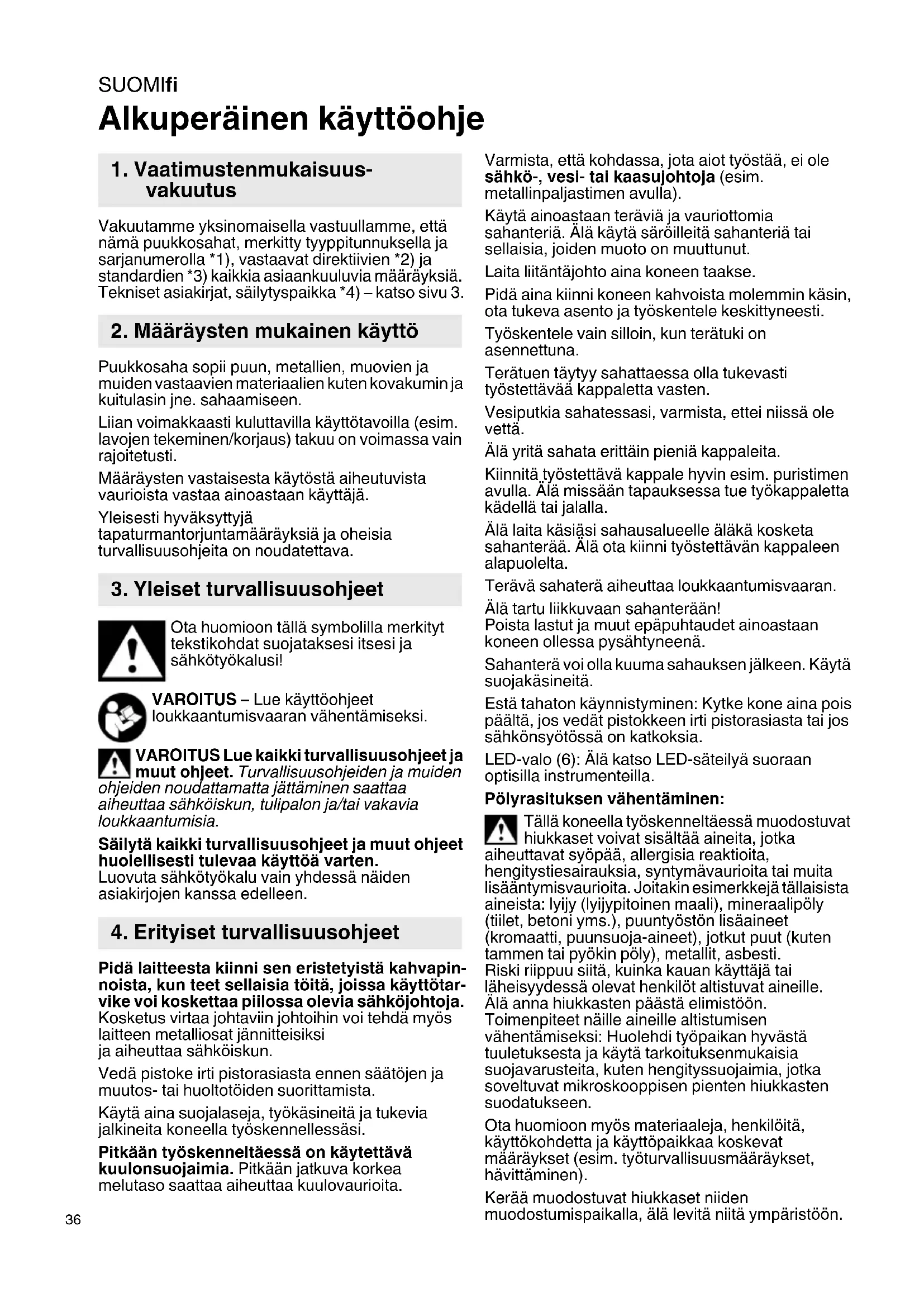 Alkuperäinen käyttöohje Vakuutamme yksinomaisella vastuullamme, että nämä puukkosahat, merkitty tyyppitunnuksella ja sarjanumerolla *1), vastaavat direktiivien *2) ja standardien *3) kaikkia asiaankuuluvia määräyksiä. Tekniset asiakirjat, säilytyspaikka *4) – katso sivu 3. Puukkosaha sopii puun, metallien, muovien ja muiden vastaavien materiaalien kuten kovakumin ja kuitulasin jne. sahaamiseen. Liian voimakkaasti kuluttavilla käyttötavoilla (esim. lavojen tekeminen/korjaus) takuu on voimassa vain rajoitetusti. Määräysten vastaisesta käytöstä aiheutuvista vaurioista vastaa ainoastaan käyttäjä. Yleisesti hyväksyttyjä tapaturmantorjuntamääräyksiä ja oheisia turvallisuusohjeita on noudatettava. Ota huomioon tällä symbolilla merkityt tekstikohdat suojataksesi itsesi ja sähkötyökalusi! VAROITUS – Lue käyttöohjeet loukkaantumisvaaran vähentämiseksi. VAROITUS Lue kaikki turvallisuusohjeet ja muut ohjeet. Turvallisuusohjeiden ja muiden ohjeiden noudattamatta jättäminen saattaa aiheuttaa sähköiskun, tulipalon ja/tai vakavia loukkaantumisia. Säilytä kaikki turvallisuusohjeet ja muut ohjeet huolellisesti tulevaa käyttöä varten. Luovuta sähkötyökalu vain yhdessä näiden asiakirjojen kanssa edelleen. Pidä laitteesta kiinni sen eristetyistä kahvapin- noista, kun teet sellaisia töitä, joissa käyttötar- vike voi koskettaa piilossa olevia sähköjohtoja. Kosketus virtaa johtaviin johtoihin voi tehdä myös laitteen metalliosat jännitteisiksi ja aiheuttaa sähköiskun. Vedä pistoke irti pistorasiasta ennen säätöjen ja muutos- tai huoltotöiden suorittamista. Käytä aina suojalaseja, työkäsineitä ja tukevia jalkineita koneella työskennellessäsi. Pitkään työskenneltäessä on käytettävä kuulonsuojaimia. Pitkään jatkuva korkea melutaso saattaa aiheuttaa kuulovaurioita. Varmista, että kohdassa, jota aiot työstää, ei ole sähkö-, vesi- tai kaasujohtoja (esim. metallinpaljastimen avulla). Käytä ainoastaan teräviä ja vauriottomia sahanteriä. Älä käytä säröilleitä sahanteriä tai sellaisia, joiden muoto on muuttunut. Laita liitäntäjohto aina koneen taakse. Pidä aina kiinni koneen kahvoista molemmin käsin, ota tukeva asento ja työskentele keskittyneesti. Työskentele vain silloin, kun terätuki on asennettuna. Terätuen täytyy sahattaessa olla tukevasti työstettävää kappaletta vasten. Vesiputkia sahatessasi, varmista, ettei niissä ole vettä. Älä yritä sahata erittäin pieniä kappaleita. Kiinnitä työstettävä kappale hyvin esim. puristimen avulla. Älä missään tapauksessa tue työkappaletta kädellä tai jalalla. Älä laita käsiäsi sahausalueelle äläkä kosketa sahanterää. Älä ota kiinni työstettävän kappaleen alapuolelta. Terävä sahaterä aiheuttaa loukkaantumisvaaran. Älä tartu liikkuvaan sahanterään! Poista lastut ja muut epäpuhtaudet ainoastaan koneen ollessa pysähtyneenä. Sahanterä voi olla kuuma sahauksen jälkeen. Käytä suojakäsineitä. Estä tahaton käynnistyminen: Kytke kone aina pois päältä, jos vedät pistokkeen irti pistorasiasta tai jos sähkönsyötössä on katkoksia. LED-valo (6): Älä katso LED-säteilyä suoraan optisilla instrumenteilla. Pölyrasituksen vähentäminen: Tällä koneella työskenneltäessä muodostuvat hiukkaset voivat sisältää aineita, jotka aiheuttavat syöpää, allergisia reaktioita, hengitystiesairauksia, syntymävaurioita tai muita lisääntymisvaurioita. Joitakin esimerkkejä tällaisista aineista: lyijy (lyijypitoinen maali), mineraalipöly (tiilet, betoni yms.), puuntyöstön lisäaineet (kromaatti, puunsuoja-aineet), jotkut puut (kuten tammen tai pyökin pöly), metallit, asbesti. Riski riippuu siitä, kuinka kauan käyttäjä tai läheisyydessä olevat henkilöt altistuvat aineille. Älä anna hiukkasten päästä elimistöön. Toimenpiteet näille aineille altistumisen vähentämiseksi: Huolehdi työpaikan hyvästä tuuletuksesta ja käytä tarkoituksenmukaisia suojavarusteita, kuten hengityssuojaimia, jotka soveltuvat mikroskooppisen pienten hiukkasten suodatukseen. Ota huomioon myös materiaaleja, henkilöitä, käyttökohdetta ja käyttöpaikkaa koskevat määräykset (esim. työturvallisuusmääräykset, hävittäminen). Kerää muodostuvat hiukkaset niiden muodostumispaikalla, älä levitä niitä ympäristöön.
