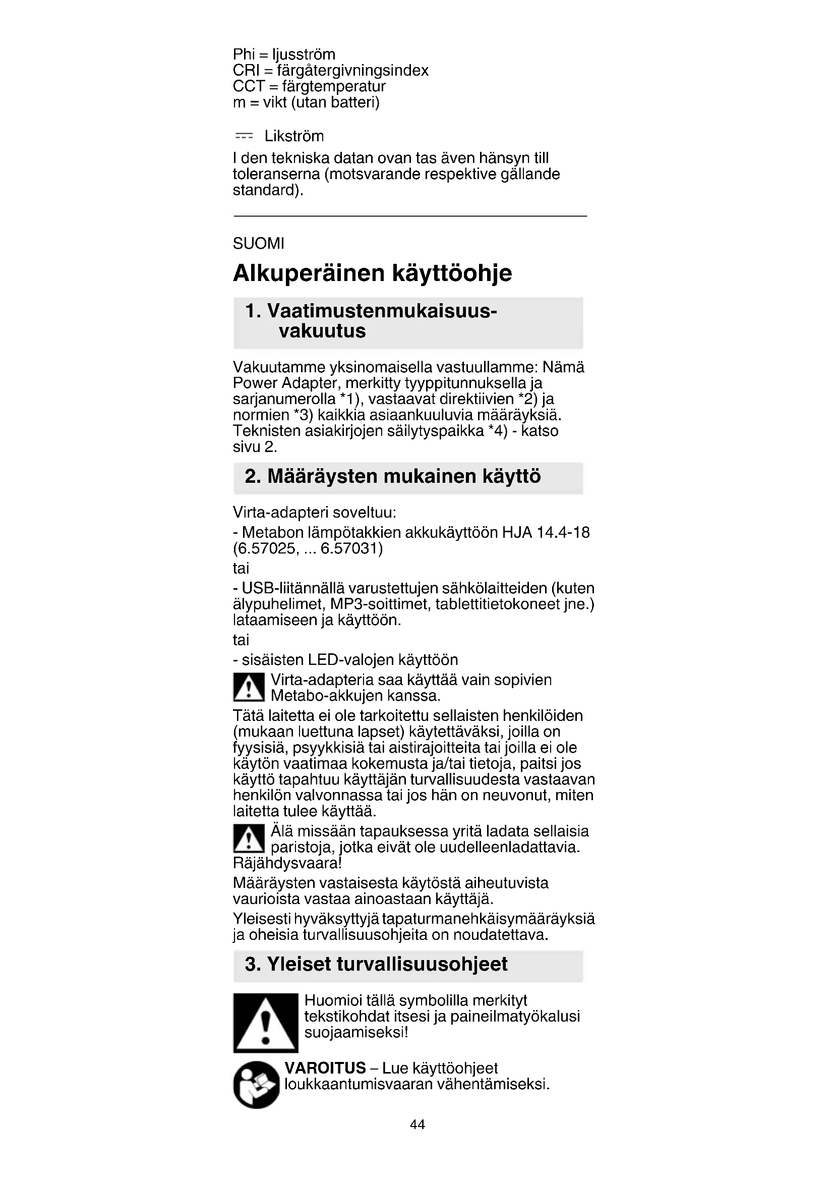 Phi = ljusström CRI = färgåtergivningsindex CCT = färgtemperatur m = vikt (utan batteri) D = spännhalsdiameter Likström I den tekniska datan ovan tas även hänsyn till toleranserna (motsvarande respektive gällande standard). SUOMI Alkuperäinen käyttöohje Vakuutamme yksinomaisella vastuullamme: Nämä Power Adapter, merkitty tyyppitunnuksella ja sarjanumerolla *1), vastaavat direktiivien *2) ja normien *3) kaikkia asiaankuuluvia määräyksiä. Teknisten asiakirjojen säilytyspaikka *4) - katso sivu 2. Virta-adapteri soveltuu: - Metabon lämpötakkien akkukäyttöön HJA 14.4-18 (6.57025, ... 6.57031) tai - USB-liitännällä varustettujen sähkölaitteiden (kuten älypuhelimet, MP3-soittimet, tablettitietokoneet jne.) lataamiseen ja käyttöön. tai - sisäisten LED-valojen käyttöön Virta-adapteria saa käyttää vain sopivien Metabo-akkujen kanssa. Tätä laitetta ei ole tarkoitettu sellaisten henkilöiden (mukaan luettuna lapset) käytettäväksi, joilla on fyysisiä, psyykkisiä tai aistirajoitteita tai joilla ei ole käytön vaatimaa kokemusta ja/tai tietoja, paitsi jos käyttö tapahtuu käyttäjän turvallisuudesta vastaavan henkilön valvonnassa tai jos hän on neuvonut, miten laitetta tulee käyttää. Älä missään tapauksessa yritä ladata sellaisia paristoja, jotka eivät ole uudelleenladattavia. Räjähdysvaara! Määräysten vastaisesta käytöstä aiheutuvista vaurioista vastaa ainoastaan käyttäjä. Yleisesti hyväksyttyjä tapaturmanehkäisymääräyksiä ja oheisia turvallisuusohjeita on noudatettava. Huomioi tällä symbolilla merkityt tekstikohdat itsesi ja paineilmatyökalusi suojaamiseksi! VAROITUS – Lue käyttöohjeet loukkaantumisvaaran vähentämiseksi.