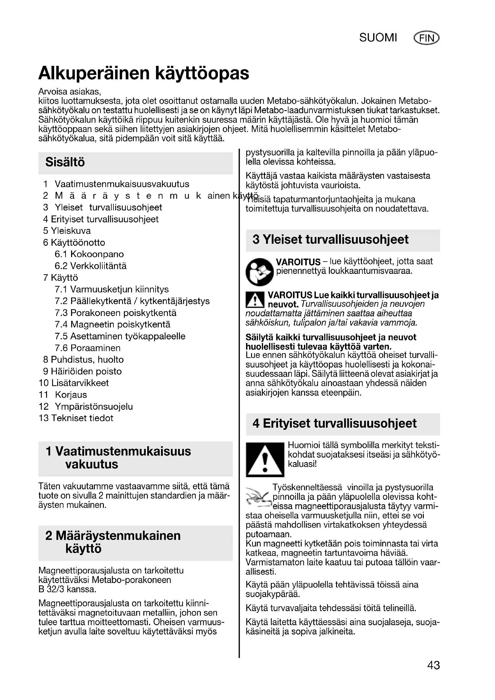8 Puhdistus, huolto 9 Häiriöiden poisto 10 Lisätarvikkeet 11 Korjaus 12 Ympäristönsuojelu 13 Tekniset tiedot Täten vakuutamme vastaavamme siitä, että tämä tuote on sivulla 2 mainittujen standardien ja määr- äysten mukainen. Magneettiporausjalusta on tarkoitettu käytettäväksi Metabo-porakoneen B 32/3 kanssa. Magneettiporausjalusta on tarkoitettu kiinni- tettäväksi magnetoituvaan metalliin, johon sen tulee tarttua moitteettomasti. Oheisen varmuus- ketjun avulla laite soveltuu käytettäväksi myös pystysuorilla ja kaltevilla pinnoilla ja pään yläpuo- lella olevissa kohteissa. Käyttäjä vastaa kaikista määräysten vastaisesta käytöstä johtuvista vaurioista. Yleisiä tapaturmantorjuntaohjeita ja mukana toimitettuja turvallisuusohjeita on noudatettava. VAROITUS – lue käyttöohjeet, jotta saat pienennettyä loukkaantumisvaaraa. VAROITUS Lue kaikki turvallisuusohjeet ja neuvot. Turvallisuusohjeiden ja neuvojen noudattamatta jättäminen saattaa aiheuttaa sähköiskun, tulipalon ja/tai vakavia vammoja. Säilytä kaikki turvallisuusohjeet ja neuvot huolellisesti tulevaa käyttöä varten. Lue ennen sähkötyökalun käyttöä oheiset turvalli- suusohjeet ja käyttöopas huolellisesti ja kokonai- suudessaan läpi. Säilytä liitteenä olevat asiakirjat ja anna sähkötyökalu ainoastaan yhdessä näiden asiakirjojen kanssa eteenpäin. Huomioi tällä symbolilla merkityt teksti- kohdat suojataksesi itseäsi ja sähkötyö- kaluasi! Työskenneltäessä vinoilla ja pystysuorilla pinnoilla ja pään yläpuolella olevissa koht- eissa magneettiporausjalusta täytyy varmi- staa oheisella varmuusketjulla niin, ettei se voi päästä mahdollisen virtakatkoksen yhteydessä putoamaan. Kun magneetti kytketään pois toiminnasta tai virta katkeaa, magneetin tartuntavoima häviää. Varmistamaton laite kaatuu tai putoaa tällöin vaar- allisesti. Käytä pään yläpuolella tehtävissä töissä aina suojakypärää. Käytä turvavaljaita tehdessäsi töitä telineillä. Käytä laitetta käyttäessäsi aina suojalaseja, suoja- käsineitä ja sopiva jalkineita. Alkuperäinen käyttöopas Arvoisa asiakas, kiitos luottamuksesta, jota olet osoittanut ostamalla uuden Metabo-sähkötyökalun. Jokainen Metabo- sähkötyökalu on testattu huolellisesti ja se on käynyt läpi Metabo-laadunvarmistuksen tiukat tarkastukset. Sähkötyökalun käyttöikä riippuu kuitenkin suuressa määrin käyttäjästä. Ole hyvä ja huomioi tämän käyttöoppaan sekä siihen liitettyjen asiakirjojen ohjeet. Mitä huolellisemmin käsittelet Metabo- sähkötyökalua, sitä pidempään voit sitä käyttää. Sisältö 1 Vaatimustenmukaisuus vakuutus 2 Määräystenmukainen käyttö 3 Yleiset turvallisuusohjeet 4 Erityiset turvallisuusohjeet 17026927_0411 M 100.book Seite 43 Dienstag, 26. April 2011 10:28 1044 SUOMI FIN Varmista, ettei verkkoliitäntäjohdossa, kytkimessä ja taittumissuojassa ole vaurioita. Magneetin takia syntyy magneettisia ja sähköma- gneettisia kenttiä, jotka voivat aiheuttaa haittaa lääketieteellisille implantaateille. Sähkömagneettia varten olevan pinnan täytyy olla puhdas ja tasainen. Magneetin tartuntavoima riippuu materiaalin vahvuudesta ja laadusta. Maali-, sinkki- ja hehkuhilsekerrokset vähentävät magneetin tartuntavoimaa. Älä altista magneettiporausjalustaa sateelle äläkä käytä sitä märissä tai räjähdysvaarallisissa tiloissa. Ennen kuin suoritat mitään porakoneeseen liittyviä säätöjä tai huoltotoimenpiteitä, vedä porakoneen pistoke irti magneettiporausjalustan pistorasiasta. Huomio! Magneetin tartuntavoima häviää, kun irrotat magneettiporausjalustan verkkopistokkeen. Noudata porakoneen käyttöohjeita. Kytke pistorasiaan (4) vain sellaisia porakoneita, joiden virrankulutus on seuraavanlainen: kun 110-120 V: enintään 12 ampeeria; kun 220-240 V: enintään 9 ampeeria. Tarkasta ennen jokaista käyttökertaa, että epäkesko (13) on kiristetty pitävästi kiinni, jotta yläosa ei voi päästä tahattomasti siirtymään tai kääntymään. Käytä suojalaseja. Vaaralliseen sähköjännitteeseen liittyvä varoitus. Magneettiseen kenttään liittyvä varoitus. Kielletty sydämentahdistinta käyttäville henkilöille. Katso sivu 3.