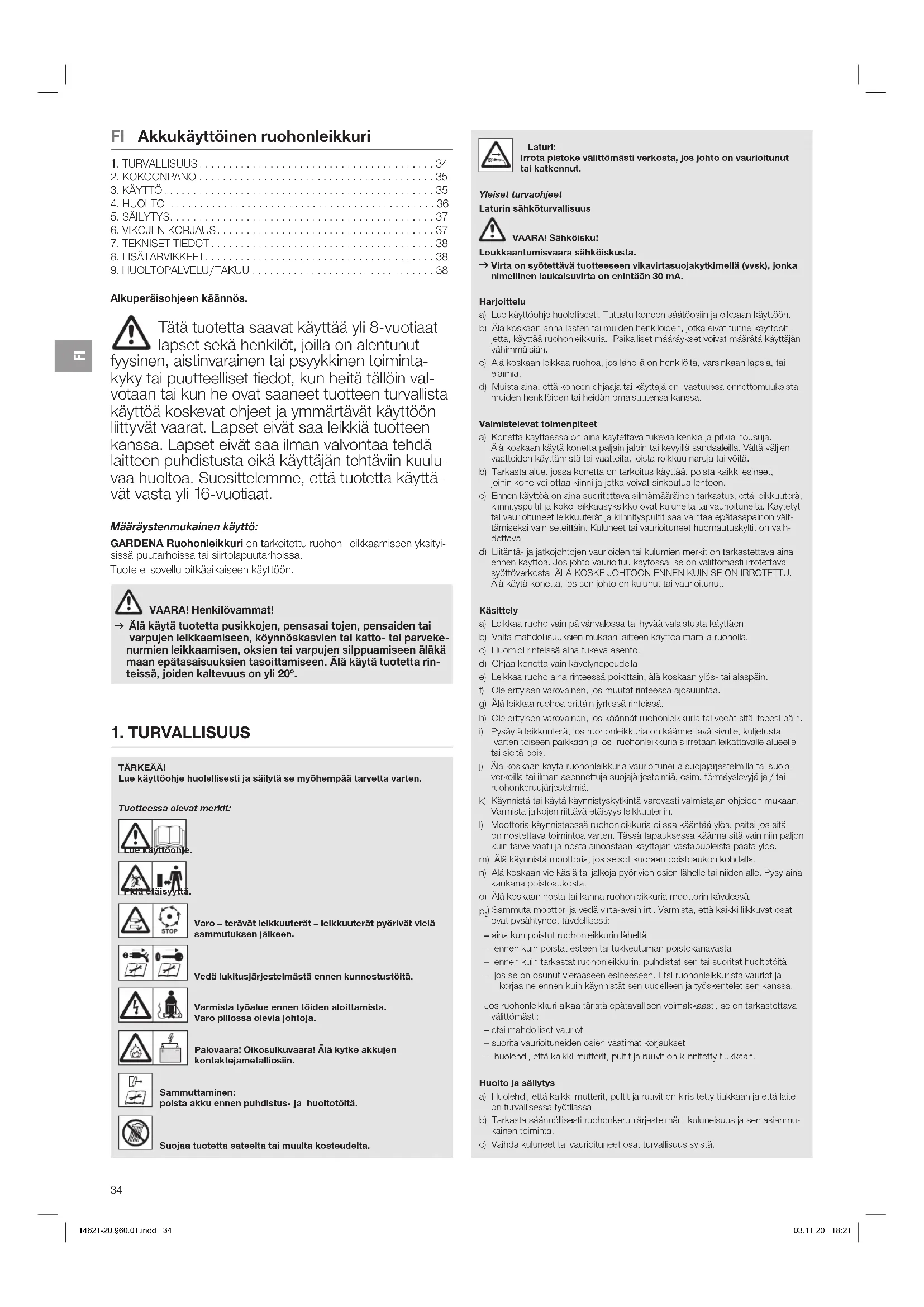Alkuperäisohjeen käännös. Tätä tuotetta saavat käyttää yli 8-vuotiaat lapset sekä henkilöt, joilla on alentunut fyysinen, aistinvarainen tai psyykkinen toiminta- kyky tai puutteelliset tiedot, kun heitä tällöin val- votaan tai kun he ovat saaneet tuotteen turvallista käyttöä koskevat ohjeet ja ymmärtävät käyttöön liittyvät vaarat. Lapset eivät saa leikkiä tuotteen kanssa. Lapset eivät saa ilman valvontaa tehdä laitteen puhdistusta eikä käyttäjän tehtäviin kuulu- vaa huoltoa. Suosittelemme, että tuotetta käyttä- vät vasta yli 16-vuotiaat. Määräystenmukainen käyttö: GARDENA Ruohonleikkuri on tarkoitettu ruohon leikkaamiseen yksityi- sissä puutarhoissa tai siirtolapuutarhoissa. Tuote ei sovellu pitkäaikaiseen käyttöön. VAARA! Henkilövammat! v Älä käytä tuotetta pusikkojen, pensasai tojen, pensaiden tai varpujen leikkaamiseen, köynnöskasvien tai katto- tai parveke- nurmien leikkaamisen, oksien tai varpujen silppuamiseen äläkä maan epätasaisuuksien tasoittamiseen. Älä käytä tuotetta rin- teissä, joiden kaltevuus on yli 20°. 14621-20.960.01.indd 34 03.11.20 18:21FI