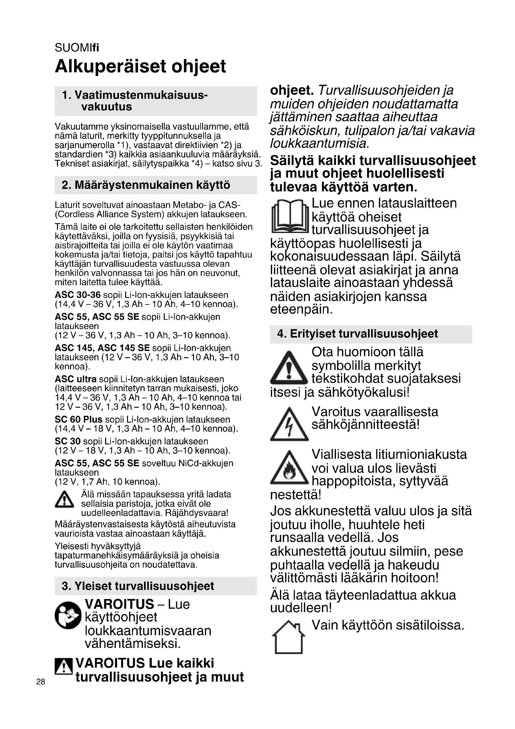 Alkuperäiset ohjeet Vakuutamme yksinomaisella vastuullamme, että nämä laturit, merkitty tyyppitunnuksella ja sarjanumerolla *1), vastaavat direktiivien *2) ja standardien *3) kaikkia asiaankuuluvia määräyksiä. Tekniset asiakirjat, säilytyspaikka *4) – katso sivu 3. Laturit soveltuvat ainoastaan Metabo- ja CAS- (Cordless Alliance System) akkujen lataukseen. Tämä laite ei ole tarkoitettu sellaisten henkilöiden käytettäväksi, joilla on fyysisiä, psyykkisiä tai aistirajoitteita tai joilla ei ole käytön vaatimaa kokemusta ja/tai tietoja, paitsi jos käyttö tapahtuu käyttäjän turvallisuudesta vastuussa olevan henkilön valvonnassa tai jos hän on neuvonut, miten laitetta tulee käyttää. ASC 30-36 sopii Li-Ion-akkujen lataukseen (14,4 V – 36 V, 1,3 Ah – 10 Ah, 4–10 kennoa). ASC 55, ASC 55 SE sopii Li-Ion-akkujen lataukseen (12 V – 36 V, 1,3 Ah – 10 Ah, 3–10 kennoa). ASC 145, ASC 145 SE sopii Li-Ion-akkujen lataukseen (12 V – 36 V, 1,3 Ah – 10 Ah, 3–10 kennoa). ASC ultra sopii Li-Ion-akkujen lataukseen (laitteeseen kiinnitetyn tarran mukaisesti, joko 14,4 V – 36 V, 1,3 Ah – 10 Ah, 4–10 kennoa tai 12 V – 36 V, 1,3 Ah – 10 Ah, 3–10 kennoa). SC 60 Plus sopii Li-Ion-akkujen lataukseen (14,4 V – 18 V, 1,3 Ah – 10 Ah, 4–10 kennoa). SC 30 sopii Li-Ion-akkujen lataukseen (12 V – 18 V, 1,3 Ah – 10 Ah, 3–10 kennoa). ASC 55, ASC 55 SE soveltuu NiCd-akkujen lataukseen (12 V, 1,7 Ah, 10 kennoa). Älä missään tapauksessa yritä ladata sellaisia paristoja, jotka eivät ole uudelleenladattavia. Räjähdysvaara! Määräystenvastaisesta käytöstä aiheutuvista vaurioista vastaa ainoastaan käyttäjä. Yleisesti hyväksyttyjä tapaturmanehkäisymääräyksiä ja oheisia turvallisuusohjeita on noudatettava. VAROITUS – Lue käyttöohjeet loukkaantumisvaaran vähentämiseksi. VAROITUS Lue kaikki turvallisuusohjeet ja muut ohjeet. Turvallisuusohjeiden ja muiden ohjeiden noudattamatta jättäminen saattaa aiheuttaa sähköiskun, tulipalon ja/tai vakavia loukkaantumisia. Säilytä kaikki turvallisuusohjeet ja muut ohjeet huolellisesti tulevaa käyttöä varten. Lue ennen latauslaitteen käyttöä oheiset turvallisuusohjeet ja käyttöopas huolellisesti ja kokonaisuudessaan läpi. Säilytä liitteenä olevat asiakirjat ja anna latauslaite ainoastaan yhdessä näiden asiakirjojen kanssa eteenpäin. Ota huomioon tällä symbolilla merkityt tekstikohdat suojataksesi itsesi ja sähkötyökalusi! Varoitus vaarallisesta sähköjännitteestä! Viallisesta litiumioniakusta voi valua ulos lievästi happopitoista, syttyvää nestettä! Jos akkunestettä valuu ulos ja sitä joutuu iholle, huuhtele heti runsaalla vedellä. Jos akkunestettä joutuu silmiin, pese puhtaalla vedellä ja hakeudu välittömästi lääkärin hoitoon! Älä lataa täyteenladattua akkua uudelleen! Vain käyttöön sisätiloissa.