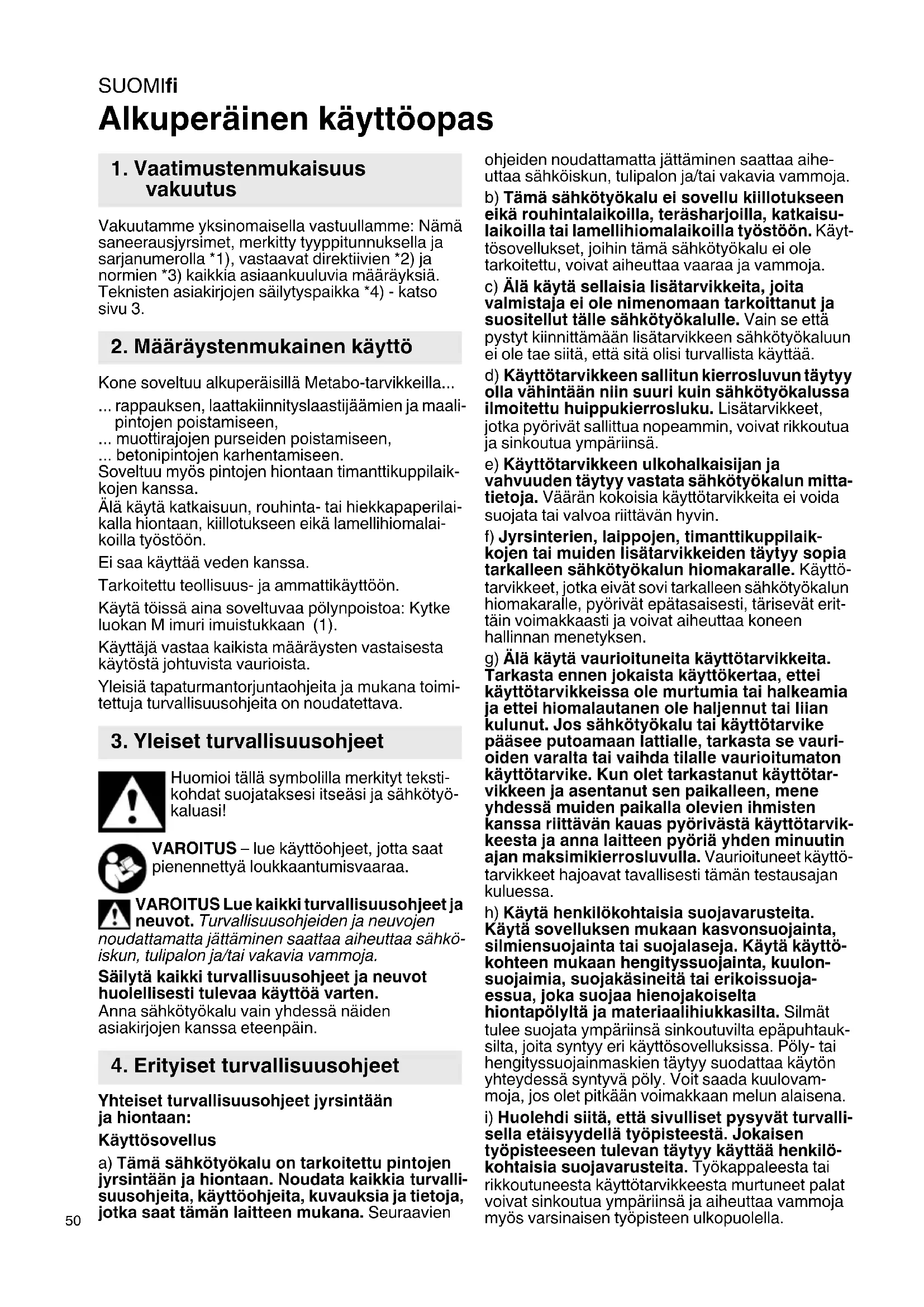 Alkuperäinen käyttöopas Vakuutamme yksinomaisella vastuullamme: Nämä saneerausjyrsimet, merkitty tyyppitunnuksella ja sarjanumerolla *1), vastaavat direktiivien *2) ja normien *3) kaikkia asiaankuuluvia määräyksiä. Teknisten asiakirjojen säilytyspaikka *4) - katso sivu 3. Kone soveltuu alkuperäisillä Metabo-tarvikkeilla... ... rappauksen, laattakiinnityslaastijäämien ja maali- pintojen poistamiseen, ... muottirajojen purseiden poistamiseen, ... betonipintojen karhentamiseen. Soveltuu myös pintojen hiontaan timanttikuppilaik- kojen kanssa. Älä käytä katkaisuun, rouhinta- tai hiekkapaperilai- kalla hiontaan, kiillotukseen eikä lamellihiomalai- koilla työstöön. Ei saa käyttää veden kanssa. Tarkoitettu teollisuus- ja ammattikäyttöön. Käytä töissä aina soveltuvaa pölynpoistoa: Kytke luokan M imuri imuistukkaan (1). Käyttäjä vastaa kaikista määräysten vastaisesta käytöstä johtuvista vaurioista. Yleisiä tapaturmantorjuntaohjeita ja mukana toimi- tettuja turvallisuusohjeita on noudatettava. Huomioi tällä symbolilla merkityt teksti- kohdat suojataksesi itseäsi ja sähkötyö- kaluasi! VAROITUS – lue käyttöohjeet, jotta saat pienennettyä loukkaantumisvaaraa. VAROITUS Lue kaikki turvallisuusohjeet ja neuvot. Turvallisuusohjeiden ja neuvojen noudattamatta jättäminen saattaa aiheuttaa sähkö- iskun, tulipalon ja/tai vakavia vammoja. Säilytä kaikki turvallisuusohjeet ja neuvot huolellisesti tulevaa käyttöä varten. Anna sähkötyökalu vain yhdessä näiden asiakirjojen kanssa eteenpäin. Yhteiset turvallisuusohjeet jyrsintään ja hiontaan: Käyttösovellus a) Tämä sähkötyökalu on tarkoitettu pintojen jyrsintään ja hiontaan. Noudata kaikkia turvalli- suus ohjeita, käyttöohjeita, kuvauksia ja tietoja, jotka saat tämän laitteen mukana. Seuraavien ohjeiden noudattamatta jättäminen saattaa aihe- uttaa sähköiskun, tulipalon ja/tai vakavia vammoja. b) Tämä sähkötyökalu ei sovellu kiillotukseen eikä rouhintalaikoilla, teräsharjoilla, katkaisu- laikoilla tai lamellihiomalaikoilla työstöön. Käyt- tösovellukset, joihin tämä sähkötyökalu ei ole tarkoitettu, voivat aiheuttaa vaaraa ja vammoja. c) Älä käytä sellaisia lisätarvikkeita, joita valmistaja ei ole nimenomaan tarkoittanut ja suositellut tälle sähkötyökalulle. Vain se että pystyt kiinnittämään lisätarvikkeen sähkötyökaluun ei ole tae siitä, että sitä olisi turvallista käyttää. d) Käyttötarvikkeen sallitun kierrosluvun täytyy olla vähintään niin suuri kuin sähkötyökalussa ilmoitettu huippukierrosluku. Lisätarvikkeet, jotka pyörivät sallittua nopeammin, voivat rikkoutua ja sinkoutua ympäriinsä. e) Käyttötarvikkeen ulkohalkaisijan ja vahvuuden täytyy vastata sähkötyökalun mitta- tietoja. Väärän kokoisia käyttötarvikkeita ei voida suojata tai valvoa riittävän hyvin. f) Jyrsinterien, laippojen, timanttikuppilaik- kojen tai muiden lisätarvikkeiden täytyy sopia tarkalleen sähkötyökalun hiomakaralle. Käyttö- tarvikkeet, jotka eivät sovi tarkalleen sähkötyökalun hiomakaralle, pyörivät epätasaisesti, tärisevät erit- täin voimakkaasti ja voivat aiheuttaa koneen hallinnan menetyksen. g) Älä käytä vaurioituneita käyttötarvikkeita. Tarkasta ennen jokaista käyttökertaa, ettei käyttötarvikkeissa ole murtumia tai halkeamia ja ettei hiomalautanen ole haljennut tai liian kulunut. Jos sähkötyökalu tai käyttötarvike pääsee putoamaan lattialle, tarkasta se vauri- oiden varalta tai vaihda tilalle vaurioitumaton käyttötarvike. Kun olet tarkastanut käyttötar- vikkeen ja asentanut sen paikalleen, mene yhdessä muiden paikalla olevien ihmisten kanssa riittävän kauas pyörivästä käyttötarvik- keesta ja anna laitteen pyöriä yhden minuutin ajan maksimikierrosluvulla. Vaurioituneet käyttö- tarvikkeet hajoavat tavallisesti tämän testausajan kuluessa. h) Käytä henkilökohtaisia suojavarusteita. Käytä sovelluksen mukaan kasvonsuojainta, silmiensuojainta tai suojalaseja. Käytä käyttö- kohteen mukaan hengityssuojainta, kuulon- suojaimia, suojakäsineitä tai erikoissuoja- essua, joka suojaa hienojakoiselta hiontapölyltä ja materiaalihiukkasilta. Silmät tulee suojata ympäriinsä sinkoutuvilta epäpuhtauk- silta, joita syntyy eri käyttösovelluksissa. Pöly- tai hengityssuojainmaskien täytyy suodattaa käytön yhteydessä syntyvä pöly. Voit saada kuulovam- moja, jos olet pitkään voimakkaan melun alaisena.