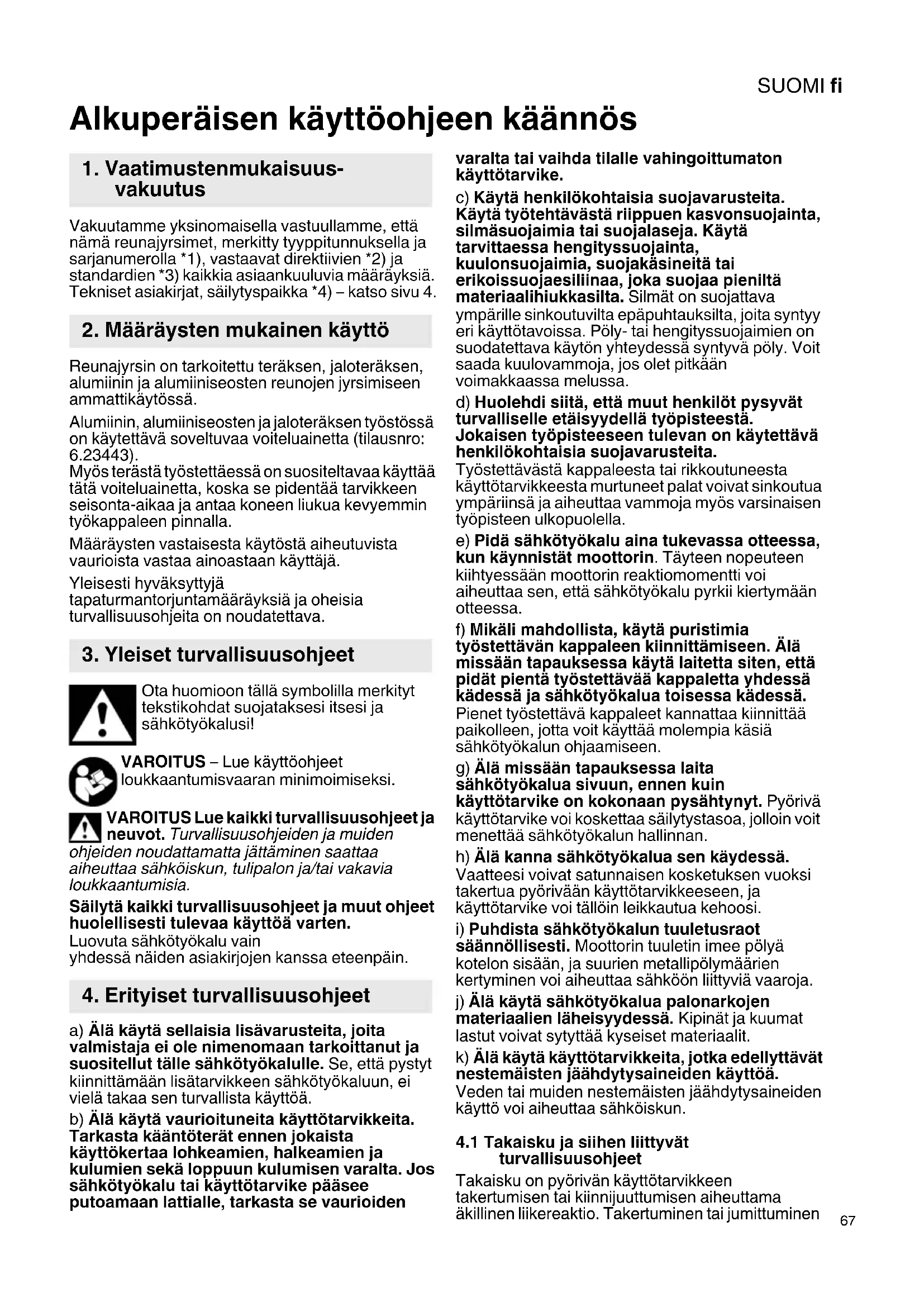 Alkuperäisen käyttöohjeen käännös Vakuutamme yksinomaisella vastuullamme, että nämä reunajyrsimet, merkitty tyyppitunnuksella ja sarjanumerolla *1), vastaavat direktiivien *2) ja standardien *3) kaikkia asiaankuuluvia määräyksiä. Tekniset asiakirjat, säilytyspaikka *4) – katso sivu 4. Reunajyrsin on tarkoitettu teräksen, jaloteräksen, alumiinin ja alumiiniseosten reunojen jyrsimiseen ammattikäytössä. Alumiinin, alumiiniseosten ja jaloteräksen työstössä on käytettävä soveltuvaa voiteluainetta (tilausnro: 6.23443). Myös terästä työstettäessä on suositeltavaa käyttää tätä voiteluainetta, koska se pidentää tarvikkeen seisonta-aikaa ja antaa koneen liukua kevyemmin työkappaleen pinnalla. Määräysten vastaisesta käytöstä aiheutuvista vaurioista vastaa ainoastaan käyttäjä. Yleisesti hyväksyttyjä tapaturmantorjuntamääräyksiä ja oheisia turvallisuusohjeita on noudatettava. Ota huomioon tällä symbolilla merkityt tekstikohdat suojataksesi itsesi ja sähkötyökalusi! VAROITUS – Lue käyttöohjeet loukkaantumisvaaran minimoimiseksi. VAROITUS Lue kaikki turvallisuusohjeet ja neuvot. Turvallisuusohjeiden ja muiden ohjeiden noudattamatta jättäminen saattaa aiheuttaa sähköiskun, tulipalon ja/tai vakavia loukkaantumisia. Säilytä kaikki turvallisuusohjeet ja muut ohjeet huolellisesti tulevaa käyttöä varten. Luovuta sähkötyökalu vain yhdessä näiden asiakirjojen kanssa eteenpäin. a) Älä käytä sellaisia lisävarusteita, joita valmistaja ei ole nimenomaan tarkoittanut ja suositellut tälle sähkötyökalulle. Se, että pystyt kiinnittämään lisätarvikkeen sähkötyökaluun, ei vielä takaa sen turvallista käyttöä. b) Älä käytä vaurioituneita käyttötarvikkeita. Tarkasta kääntöterät ennen jokaista käyttökertaa lohkeamien, halkeamien ja kulumien sekä loppuun kulumisen varalta. Jos sähkötyökalu tai käyttötarvike pääsee putoamaan lattialle, tarkasta se vaurioiden varalta tai vaihda tilalle vahingoittumaton käyttötarvike. c) Käytä henkilökohtaisia suojavarusteita. Käytä työtehtävästä riippuen kasvonsuojainta, silmäsuojaimia tai suojalaseja. Käytä tarvittaessa hengityssuojainta, kuulonsuojaimia, suojakäsineitä tai erikoissuojaesiliinaa, joka suojaa pieniltä materiaalihiukkasilta. Silmät on suojattava ympärille sinkoutuvilta epäpuhtauksilta, joita syntyy eri käyttötavoissa. Pöly- tai hengityssuojaimien on suodatettava käytön yhteydessä syntyvä pöly. Voit saada kuulovammoja, jos olet pitkään voimakkaassa melussa. d) Huolehdi siitä, että muut henkilöt pysyvät turvalliselle etäisyydellä työpisteestä. Jokaisen työpisteeseen tulevan on käytettävä henkilökohtaisia suojavarusteita. Työstettävästä kappaleesta tai rikkoutuneesta käyttötarvikkeesta murtuneet palat voivat sinkoutua ympäriinsä ja aiheuttaa vammoja myös varsinaisen työpisteen ulkopuolella. e) Pidä sähkötyökalu aina tukevassa otteessa, kun käynnistät moottorin. Täyteen nopeuteen kiihtyessään moottorin reaktiomomentti voi aiheuttaa sen, että sähkötyökalu pyrkii kiertymään otteessa. f) Mikäli mahdollista, käytä puristimia työstettävän kappaleen kiinnittämiseen. Älä missään tapauksessa käytä laitetta siten, että pidät pientä työstettävää kappaletta yhdessä kädessä ja sähkötyökalua toisessa kädessä. Pienet työstettävä kappaleet kannattaa kiinnittää paikolleen, jotta voit käyttää molempia käsiä sähkötyökalun ohjaamiseen. g) Älä missään tapauksessa laita sähkötyökalua sivuun, ennen kuin käyttötarvike on kokonaan pysähtynyt. Pyörivä käyttötarvike voi koskettaa säilytystasoa, jolloin voit menettää sähkötyökalun hallinnan. h) Älä kanna sähkötyökalua sen käydessä. Vaatteesi voivat satunnaisen kosketuksen vuoksi takertua pyörivään käyttötarvikkeeseen, ja käyttötarvike voi tällöin leikkautua kehoosi.