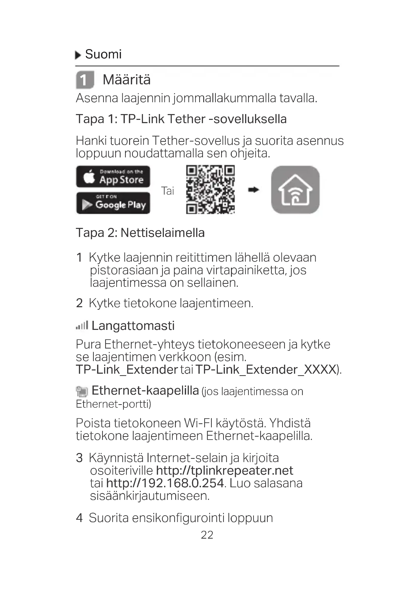 Määritä Asenna laajennin jommallakummalla tavalla. Tapa 1: TP-Link Tether -sovelluksella Hanki tuorein Tether-sovellus ja suorita asennus loppuun noudattamalla sen ohjeita. Tapa 2: Nettiselaimella 1 Kytke laajennin reitittimen lähellä olevaan pistorasiaan ja paina virtapainiketta, jos laajentimessa on sellainen. 2 Kytke tietokone laajentimeen. Langattomasti Pura Ethernet-yhteys tietokoneeseen ja kytke se laajentimen verkkoon (esim. TP-Link_Extender tai TP-Link_Extender_XXXX). Ethernet-kaapelilla (jos laajentimessa on Ethernet-portti) Poista tietokoneen Wi-FI käytöstä. Yhdistä tietokone laajentimeen Ethernet-kaapelilla. 3 Käynnistä Internet-selain ja kirjoita osoiteriville http://tplinkrepeater.net tai http://192.168.0.254. Luo salasana sisäänkirjautumiseen. 4 Suorita ensikonfigurointi loppuun TaiSuomi