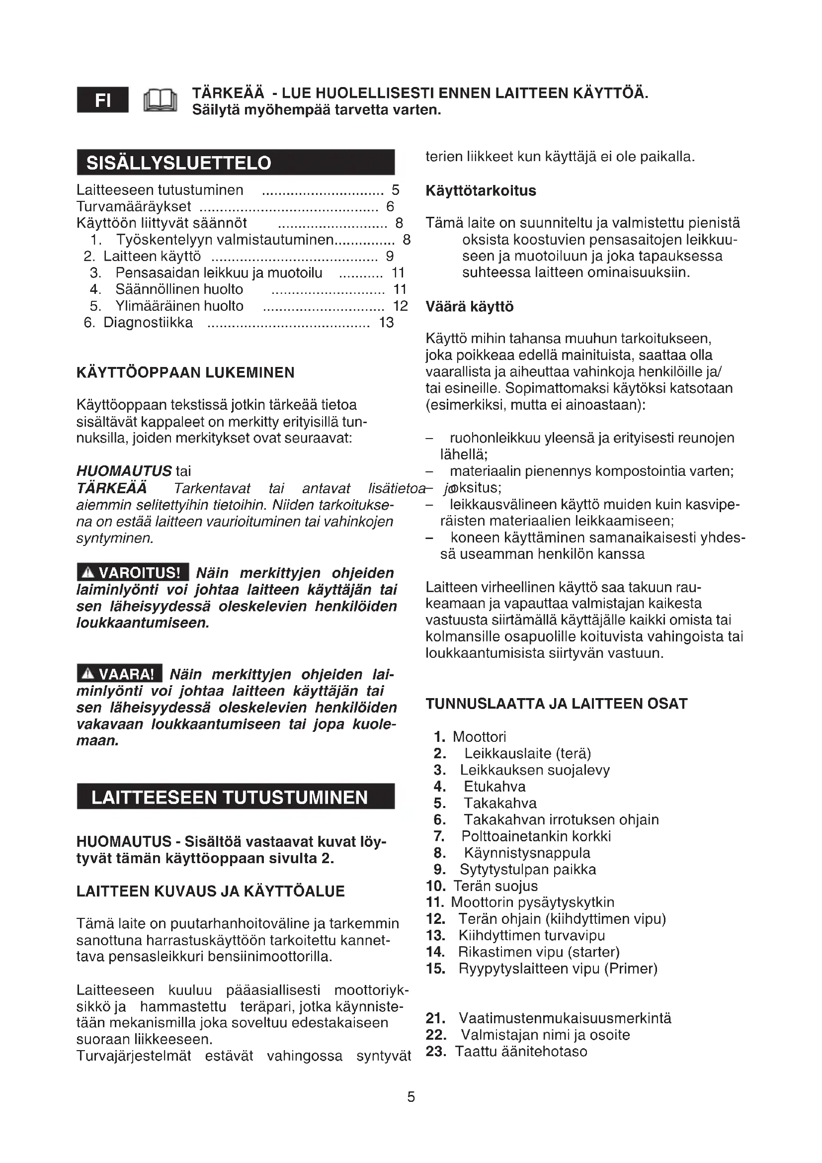 1) Aina laitetta tarkistettaessa, liikuteltaessa tai kuljetettaessa tulee: – sammuttaa moottori, odottaa terien pysähty- mistä, irrottaa sytytystulpan kupu ja odottaa laitteen jäähtymistä; – laittaa terien suojus paikoilleen; – ottaa kiinni laitteen kahvoista ja kohdistaa terät kulkusuuntaan nähden vastakkaiseen suuntaan. 2) Kun laitetta kuljetetaan autolla, tulee laite si- joittaa niin, ettei se aiheuta vaaraa kenellekään, ja lukita kunnolla laitteen kaatumisen estämi- seksi ja tästä johtuvan bensiini ulosvuotamisen välttämiseksi. KÄYTTÖÖN LIITTYVÄT SÄÄNNÖT HUOMAUTUS - Tekstissä mainitut kuvat löytyvät tämän käyttöoppaan sivulta 3 lähtien.
