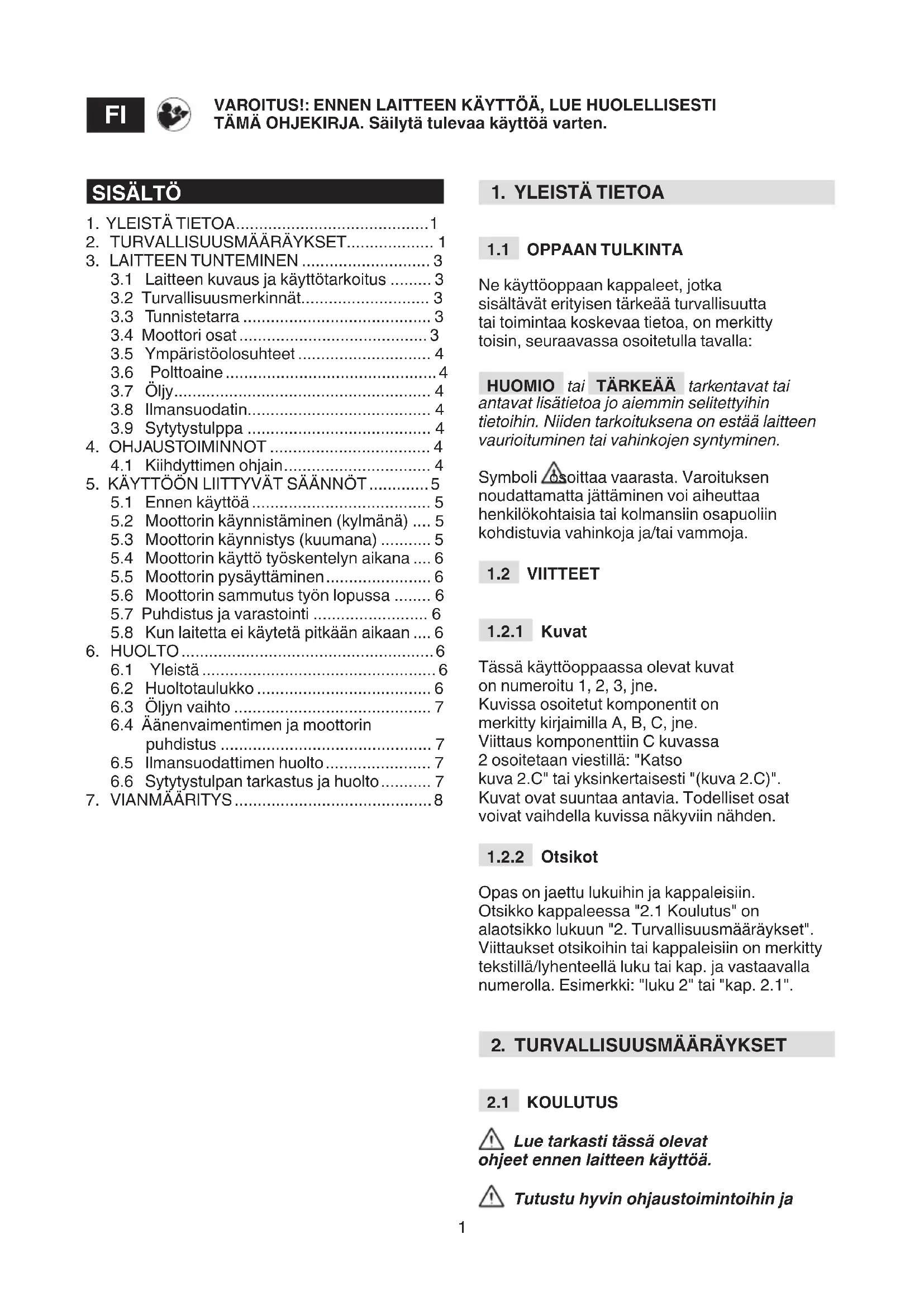 laitteen oikeaoppiseen käyttöön. Opettele sammuttamaan moottori nopeasti. Varoitusten ja ohjeiden laiminlyönti voi aiheuttaa onnettomuuksia ja/tai vakavia vammoja. Säilytä kaikki varoitukset ja ohjeet tulevaa käyttöä varten.