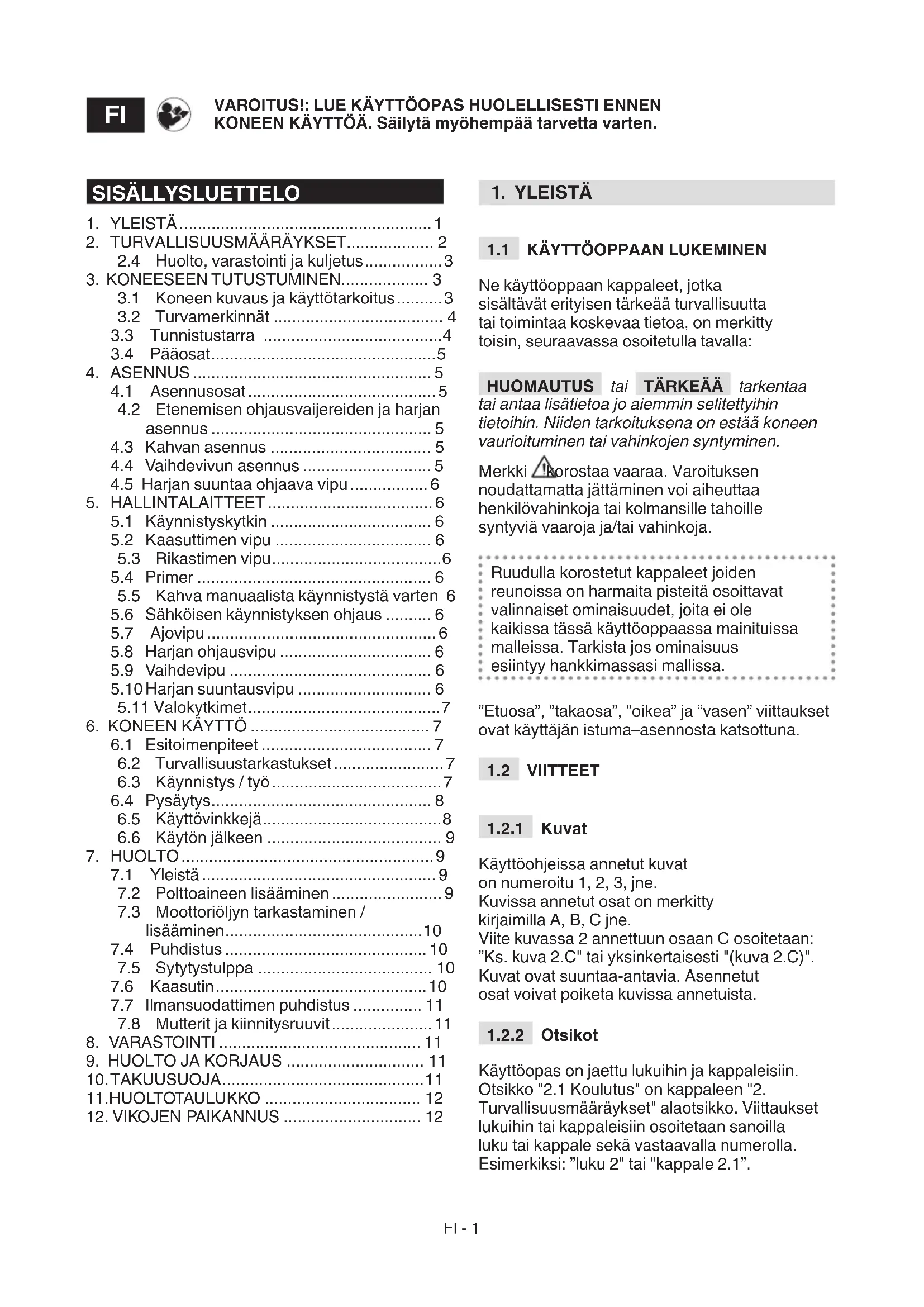 - Jos kone iskeytyy vieraisiin esineisiin tai jos epätavallista tärinää esiintyy, sammuta moottori, odota, että liikkuvat osat pysähtyvät ja tarkasta kone mahdollistenFI - 3 vahinkojen varalta. Tärinä on yleensä merkki ongelmasta. Korjaa mahdolliset vahingot ennen koneen käyttöä uudelleen.