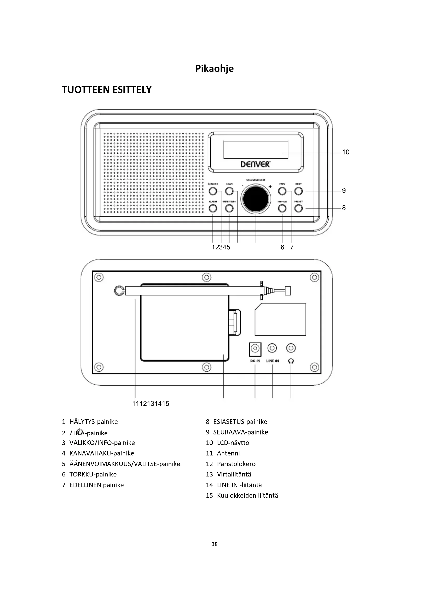 Omega 5A, Soeften DK-8382 Hinnerup Danmark www.facebook.com/denverelectronics38 Pikaohje TUOTTEEN ESITTELY 1 HÄLYTYS-painike 2 /TILA-painike 3 VALIKKO/INFO-painike 4 KANAVAHAKU-painike 5 ÄÄNENVOIMAKKUUS/VALITSE-painike 6 TORKKU-painike 7 EDELLINEN painike 8 ESIASETUS-painike 9 SEURAAVA-painike 10 LCD-näyttö 11 Antenni 12 Paristolokero 13 Virtaliitäntä 14 LINE IN -liitäntä 15 Kuulokkeiden liitäntä