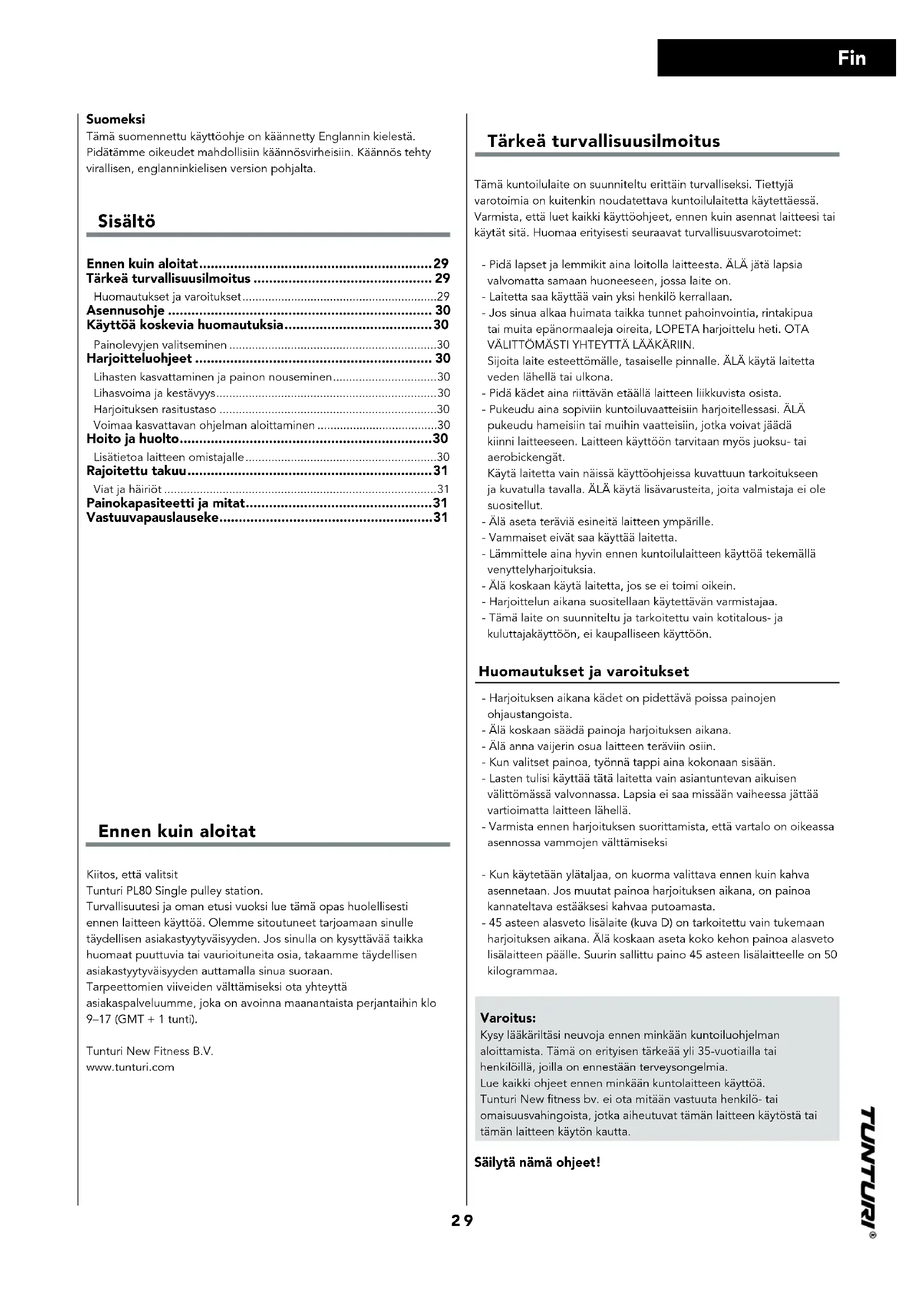 Löydä laitteen käyttöohje ilmaiseksi Single Pulley Station PL80 TUNTURI PDF-muodossa.