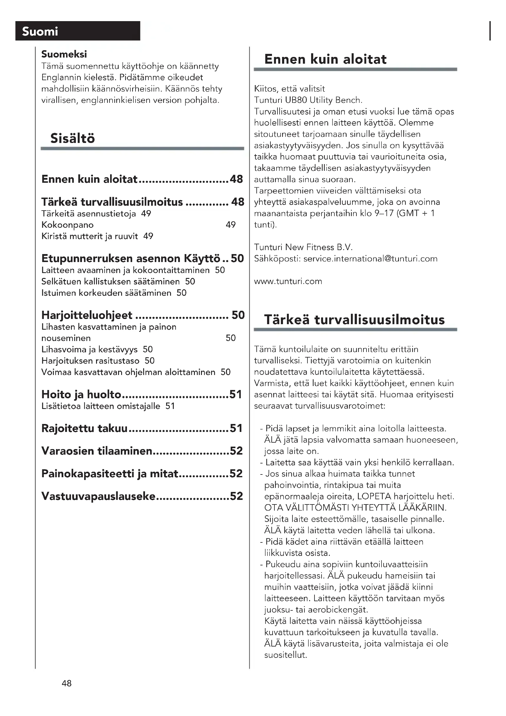 - Älä ylikiristä mitään kääntyvää osaa. • Varmista, että kaikki kääntyvät osat pääsevät liikkumaan vapaasti.Älä kiristä kaikkia muttereita ja ruuveja tässä vaiheessa.50 Suomi Etupunnerruksen asennon Käyttö Laitteen avaaminen ja kokoontaittaminen (Fig. Use #1) Vedä lukitustappi ulos liitoksesta ja taita laite, ja kiinnitä sitten lukkotappi. Selkätuen kallistuksen säätäminen (Kuva Use #2) - Kallista selkätukea hieman ja kallista säätötanko pois hammaslevyistä. - Siirrä selkätuki haluttuun asentoon. - Aseta säätötanko hammaslevyihin sen kiinnittämiseksi. Istuimen korkeuden säätäminen (Fig. Use #3) - Vedä säätönupista. - Siirrä istuin haluttuun asentoon. - Vapauta säätönuppi. Harjoitteluohjeet Lihasten kasvattaminen ja painon nouseminen Toisin kuin aerobisessa harjoittelussa, jossa korostetaan kestävyysharjoittelua, anaerobisessa harjoittelussa keskitytään voimaharjoitteluun. Paino voi nousta asteittain, kun lihasten kokoa ja voimaa kasvatetaan. Lihasmassaa kehitettäessä kehosi mukautuu siihen kohdistuvaan rasitukseen. Voit muokata ruokavaliotasi niin, että siihen sisältyy esimerkiksi lihaa, kalaa ja vihanneksia. Nämä ruoka-aineet auttavat lihaksia palautumaan ja täydentävät tärkeiden ravintoaineiden määrää rasittavan harjoittelun jälkeen. Lihasvoima ja kestävyys Jotta harjoittelusta saa suurimman mahdollisen hyödyn, on tärkeää laatia kuntoiluohjelma, jonka ansiosta saat harjoitettua kaikkia tärkeitä lihasryhmiä tasapuolisesti.Jos haluat lisätä lihasvoimaa, noudata tätä periaatetta:Lihasvoima lisääntyy, kun vastusta lisätään ja harjoituksen toistomäärä pidetään samana.Jos haluat kiinteyttää vartaloasi, noudata tätä periaatetta: Vartalo kiinteytyy, kun vastusta vähennetään ja harjoituksen toistomäärää lisätään.Kun harjoitus tuntuu helpolta, voit muuttaa vastusta, toistomäärää tai nopeutta, jolla teet harjoituksen. Kaikkia kolmea muuttujaa ei ole tarpeen muuttaa. Voit esimerkiksi harjoitella 10 kg:n painolla ja tehdä harjoituksen 10 kertaa 3 minuutissa. Kun tästä tulee liian helppoa, voit päättää nostaa painoksi 12 kg ja tehdä saman toistomäärän samassa ajassa. Lihasvoima kehittyy useimmiten nostamalla suurempia painoja vähempiä kertoja. Jos haluat kehittää sekä lihasvoimaa että kestävyyttä, suositeltavaa on, että teet jokaisessa harjoituksessa 15–20 toistoa sarjaa kohden. Harjoituksen rasitustaso Se, miten kovaa alat harjoitella, riippuu yleisestä kuntotasostasi. Kokemaasi kipua voi pienentää vähentämällä lihaksiisi kohdistuvaa kuormaa ja tehtyjen sarjojen määrää. Vammojen välttämiseksi sinun pitäisi täydentää kuntoiluohjelmaa asteittain ja määrittää kuormitus yksilöllisen kuntotasosi mukaan. Kuormituksen pitäisi kasvaa kuntosi kasvaessa.Lihaskipu on yleistä, erityisesti aloittaessasi harjoittelun. Jos kipu tuntuu pahalta ja kestää pitkään, sinun on ehkä muutettava ohjelmaa. Lopulta lihaksistosi tottuu siihen kohdistuvaan rasitukseen ja kuormaan. Voimaa kasvattavan ohjelman aloittaminen Alkuverryttely Voimaharjoittelun aluksi on tärkeää venytellä ja harjoitella kevyesti 5–10 minuutin ajan. Tämä51 Suomi auttaa kehoa valmistautumaan rasittavampaan harjoitteluun lisäämällä verenkiertoa, nostamalla ruumiinlämpöä ja tuomalla lisää happea lihaksiin. Harjoittelu Kaikessa harjoittelussa on muistettava, että pitkään kestävä lihaskipu ei ole toivottavaa ja voi kertoa vamman syntymisestä. Loppuverryttely Venyttele jokaisen harjoittelukerran lopussa hitaasti 5–10 minuutin ajan. Tee kaikki venytykset asteittain menemällä vain niin pitkälle kuin pystyt. Tämä vaihe auttaa lihaksiasi palautumaan harjoittelun jälkeen. Jotta kuntoiluohjelma on kokonaisvaltainen, on suositeltavaa, että voimaharjoittelun lisäksi siinä on 2–3 päivänä aerobista harjoittelua. Veden juominen Keho voi toimia asianmukaisesti vain, jos sitä nesteytetään oikein. Jos kuntoilet, nautittavien nesteiden määrää on lisättävä. Tähän on syynä se, että nauttimasi vesi poistuu elimistöstäsi hikoilun kautta, joka viilentää kehoasi harjoittelun aikana. Harjoittelun aikana menettämäsi vesi on korvattava, jotta lihakset palautuvat kunnolla. Lepopäivä Vaikka et sitä haluaisikaan, on tärkeää pitää lepopäivä vähintään kerran viikossa, jotta kehosi saa mahdollisuuden toipua. Lihasten jatkuva harjoittaminen johtaa yliharjoitteluun, joka ei ole hyödyksi pitkällä aikavälillä. Hoito ja huolto - Voitele liikkuvat osat säännöllisesti WD-40:llä tai kevyellä öljyllä. - Tarkasta ja kiristä kaikki osat ennen laitteen käyttöä. - Laitteen voi puhdistaa kevyesti kostutetulla liinalla ja miedolla, hankaamattomalla puhdistusaineella. ÄLÄ KÄYTÄ liuottimia. - Tarkasta säännöllisesti, että laite ei ole vahingoittunut tai kulunut. - Vaihda vialliset osat välittömästi ja/tai pidä laite poissa käytöstä siihen asti kun se on korjattu. - Tarkastuksen laiminlyönti voi vaikuttaa laitteen turvallisuuteen. Lisätietoa laitteen omistajalle Pakkauksen hävittäminen Lainsäädäntö ohjeistaa meitä vähentämään kaatopaikoille toimitetun jätteen määrää. Sen vuoksi pyydämme sinua toimittamaan kaikki pakkausjätteet sitä varten tarkoitettuun kierrät Laitteen hävittäminen käyttoiän päättyessä Me Tunturilla toivomme, että iloitset kuntolaitteestasi vuosia. Jokainen kuntolaite tulee kuitenkin aikanaan oman käyttöikänsä loppuun. Kotitalouksien sähkö- ja elektroniikkalaiteromua käsittelevien eurooppalaisten määräysten (WEEE) mukaan sinun kuuluu toimittaa kuntolaitteesi sitä varten tarkoitettuun keräyspaikkaan. Rajoitettu takuu Tunturi New Fitness takaa, että tuotteessa ei esiinny valmistus- tai materiaalivikoja, kun sitä käytetään ja huolletaan normaalisti, rungon osalta kahteen vuoteen sekä kaikkien muiden osien osalta yhteen vuoteen ostopäivästä lukien. Tämä takuu koskee vain laitteen 