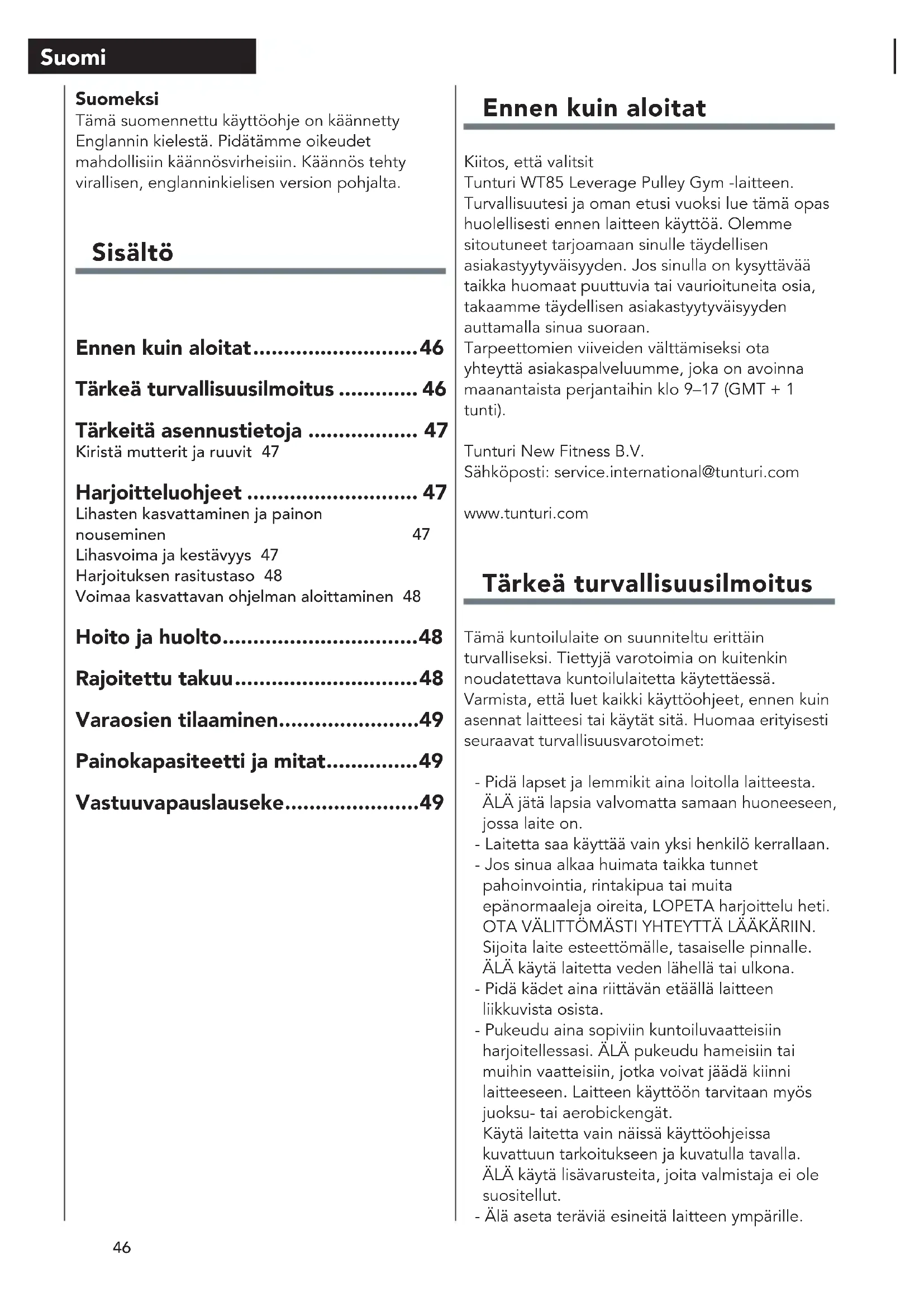 KÄYTTÖOHJE Leverage Pulley Gym WT85 TUNTURI