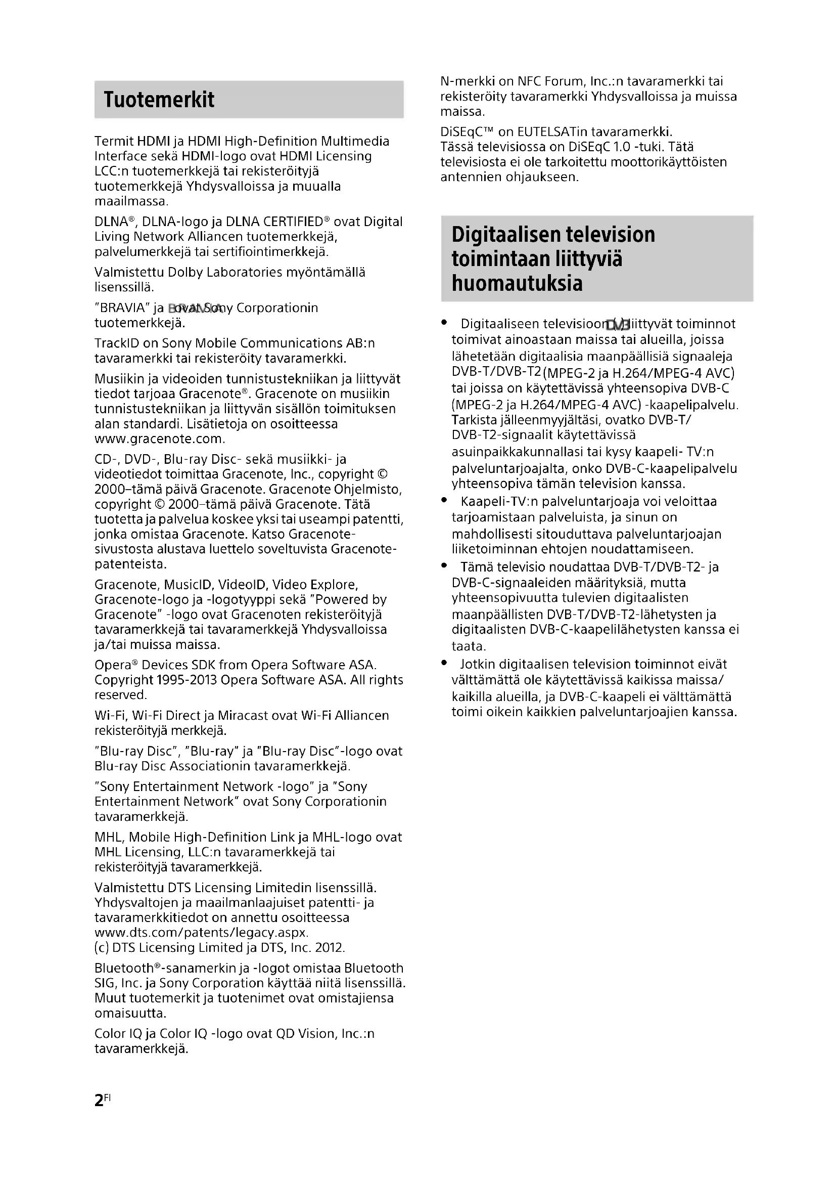 Termit HDMI ja HDMI High-Definition Multimedia Interface sekä HDMI-logo ovat HDMI Licensing LCC:n tuotemerkkejä tai rekisteröityjä tuotemerkkejä Yhdysvalloissa ja muualla maailmassa. DLNA®, DLNA-logo ja DLNA CERTIFIED® ovat Digital Living Network Alliancen tuotemerkkejä, palvelumerkkejä tai sertifiointimerkkejä. Valmistettu Dolby Laboratories myöntämällä lisenssillä. ”BRAVIA” ja ovat Sony Corporationin tuotemerkkejä. TrackID on Sony Mobile Communications AB:n tavaramerkki tai rekisteröity tavaramerkki. Musiikin ja videoiden tunnistustekniikan ja liittyvät tiedot tarjoaa Gracenote®. Gracenote on musiikin tunnistustekniikan ja liittyvän sisällön toimituksen alan standardi. Lisätietoja on osoitteessa www.gracenote.com. CD-, DVD-, Blu-ray Disc- sekä musiikki- ja videotiedot toimittaa Gracenote, Inc., copyright © 2000–tämä päivä Gracenote. Gracenote Ohjelmisto, copyright © 2000–tämä päivä Gracenote. Tätä tuotetta ja palvelua koskee yksi tai useampi patentti, jonka omistaa Gracenote. Katso Gracenote- sivustosta alustava luettelo soveltuvista Gracenote- patenteista. Gracenote, MusicID, VideoID, Video Explore, Gracenote-logo ja -logotyyppi sekä ”Powered by Gracenote” -logo ovat Gracenoten rekisteröityjä tavaramerkkejä tai tavaramerkkejä Yhdysvalloissa ja/tai muissa maissa. Opera® Devices SDK from Opera Software ASA. Copyright 1995-2013 Opera Software ASA. All rights reserved. Wi-Fi, Wi-Fi Direct ja Miracast ovat Wi-Fi Alliancen rekisteröityjä merkkejä. ”Blu-ray Disc”, ”Blu-ray” ja ”Blu-ray Disc”-logo ovat Blu-ray Disc Associationin tavaramerkkejä. ”Sony Entertainment Network -logo” ja ”Sony Entertainment Network” ovat Sony Corporationin tavaramerkkejä. MHL, Mobile High-Definition Link ja MHL-logo ovat MHL Licensing, LLC:n tavaramerkkejä tai rekisteröityjä tavaramerkkejä. Valmistettu DTS Licensing Limitedin lisenssillä. Yhdysvaltojen ja maailmanlaajuiset patentti- ja tavaramerkkitiedot on annettu osoitteessa www.dts.com/patents/legacy.aspx. (c) DTS Licensing Limited ja DTS, Inc. 2012. Bluetooth®-sanamerkin ja -logot omistaa Bluetooth SIG, Inc. ja Sony Corporation käyttää niitä lisenssillä. Muut tuotemerkit ja tuotenimet ovat omistajiensa omaisuutta. Color IQ ja Color IQ -logo ovat QD Vision, Inc.:n tavaramerkkejä. N-merkki on NFC Forum, Inc.:n tavaramerkki tai rekisteröity tavaramerkki Yhdysvalloissa ja muissa maissa. DiSEqC™ on EUTELSATin tavaramerkki. Tässä televisiossa on DiSEqC 1.0 -tuki. Tätä televisiosta ei ole tarkoitettu moottorikäyttöisten antennien ohjaukseen. Digitaaliseen televisioon ( ) liittyvät toiminnot toimivat ainoastaan maissa tai alueilla, joissa lähetetään digitaalisia maanpäällisiä signaaleja DVB-T/DVB-T2 (MPEG-2 ja H.264/MPEG-4 AVC) tai joissa on käytettävissä yhteensopiva DVB-C (MPEG-2 ja H.264/MPEG-4 AVC) -kaapelipalvelu. Tarkista jälleenmyyjältäsi, ovatko DVB-T/ DVB-T2-signaalit käytettävissä asuinpaikkakunnallasi tai kysy kaapeli- TV:n palveluntarjoajalta, onko DVB-C-kaapelipalvelu yhteensopiva tämän television kanssa. Kaapeli-TV:n palveluntarjoaja voi veloittaa tarjoamistaan palveluista, ja sinun on mahdollisesti sitouduttava palveluntarjoajan liiketoiminnan ehtojen noudattamiseen. Tämä televisio noudattaa DVB-T/DVB-T2- ja DVB-C-signaaleiden määrityksiä, mutta yhteensopivuutta tulevien digitaalisten maanpäällisten DVB-T/DVB-T2-lähetysten ja digitaalisten DVB-C-kaapelilähetysten kanssa ei taata. Jotkin digitaalisen television toiminnot eivät välttämättä ole käytettävissä kaikissa maissa/ kaikilla alueilla, ja DVB-C-kaapeli ei välttämättä toimi oikein kaikkien palveluntarjoajien kanssa. Tuotemerkit Digitaalisen television toimintaan liittyviä huomautuksia3