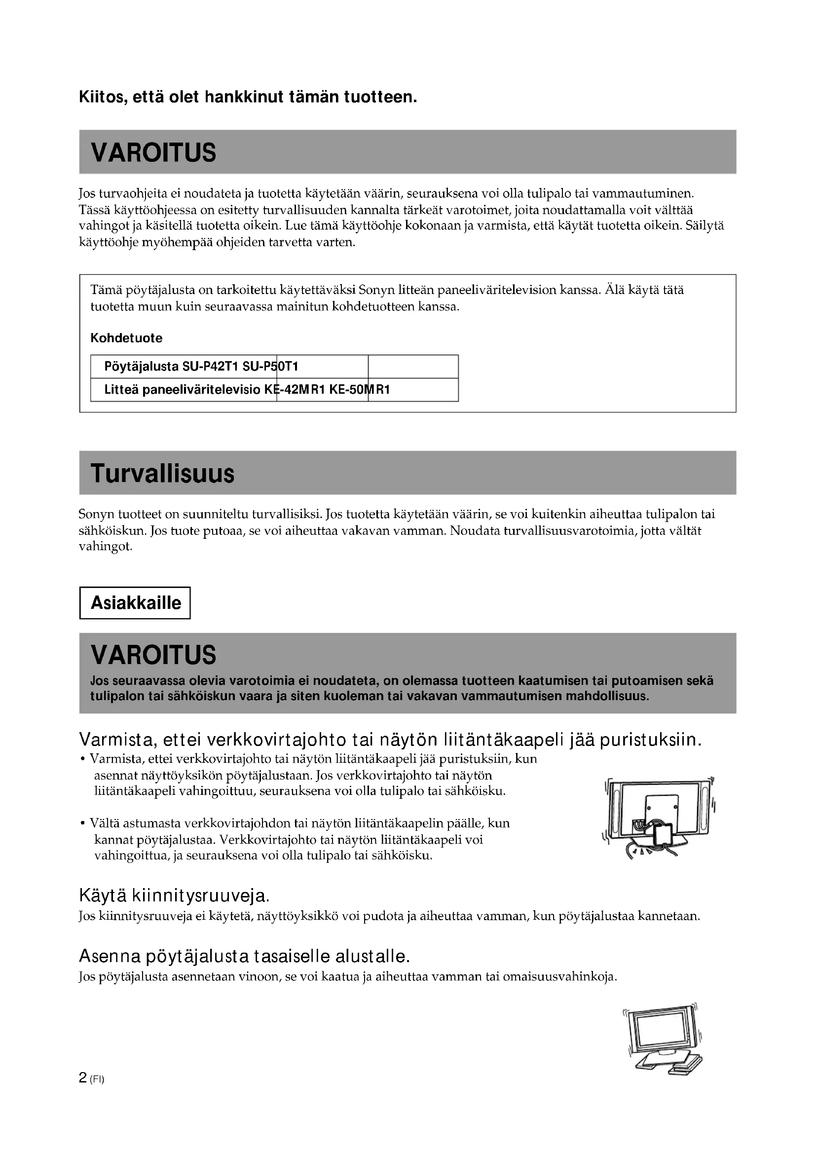 SU-P42T1 SU-P50T1 Enhet: (mm) A 500 600 B 295 321 C 392 D 340 E 310 F 461 G 141 H 602 Vikt: (kg) 16,0 19,011 (SE)2 (FI) Kiitos, että olet hankkinut tämän tuotteen. VAROITUS Jos turvaohjeita ei noudateta ja tuotetta käytetään väärin, seurauksena voi olla tulipalo tai vammautuminen. Tässä käyttöohjeessa on esitetty turvallisuuden kannalta tärkeät varotoimet, joita noudattamalla voit välttää vahingot ja käsitellä tuotetta oikein. Lue tämä käyttöohje kokonaan ja varmista, että käytät tuotetta oikein. Säilytä käyttöohje myöhempää ohjeiden tarvetta varten. Tämä pöytäjalusta on tarkoitettu käytettäväksi Sonyn litteän paneeliväritelevision kanssa. Älä käytä tätä tuotetta muun kuin seuraavassa mainitun kohdetuotteen kanssa. Kohdetuote Pöytäjalusta SU-P42T1 SU-P50T1 Litteä paneeliväritelevisio KE-42MR1 KE-50MR1 Turvallisuus Sonyn tuotteet on suunniteltu turvallisiksi. Jos tuotetta käytetään väärin, se voi kuitenkin aiheuttaa tulipalon tai sähköiskun. Jos tuote putoaa, se voi aiheuttaa vakavan vamman. Noudata turvallisuusvarotoimia, jotta vältät vahingot. Asiakkaille VAROITUS Jos seuraavassa olevia varotoimia ei noudateta, on olemassa tuotteen kaatumisen tai putoamisen sekä tulipalon tai sähköiskun vaara ja siten kuoleman tai vakavan vammautumisen mahdollisuus. Varmista, ettei verkkovirtajohto tai näytön liitäntäkaapeli jää puristuksiin.