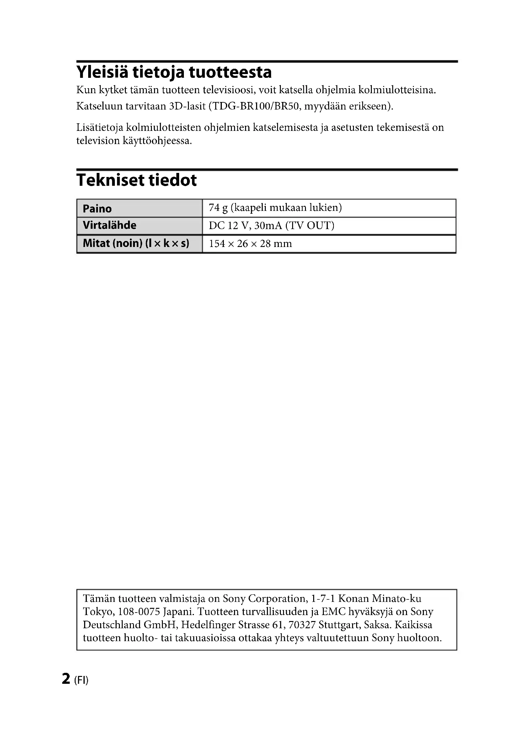 3D-tahdistuslähettimen hävitys Käytöstä poistettujen sähkö- ja elektroniikkalaitteiden hävittäminen (koskee Euroopan yhteisön ja muiden Euroopan maiden jätehuoltoa) Tämä laitteeseen tai sen pakkaukseen merkitty symboli tarkoittaa, että laitetta ei saa käsitellä kotitalousjätteenä. Sen sijaan laite on toimitettava sähkö- ja elektroniikkalaitteiden kierrätyksestä huolehtivaan keräys- ja kierrätyspisteeseen. Varmistamalla, että tämä laite hävitetään asianmukaisesti, voit auttaa estämään mahdollisia ympäristö- ja terveyshaittoja, joita muuten voi aiheutua laitteen epäasianmukaisesta käsittelystä. Materiaalien kierrätys säästää luonnonvaroja. Lisätietoja laitteen käsittelystä, talteenotosta ja kierrätyksestä on saatavilla paikallisilta ympäristöviranomaisilta, jätehuoltokeskuksesta tai liikkeestä, josta laite on ostettu.TMR-BR100 4-180-471-26(1) 4 (FI) TMR-BR100 4-180-471-26(1) Huomio Lue nämä turvaohjeet huolellisesti oman turvallisuutesi vuoksi ja omaisuusvahinkojen välttämiseksi. Varotoimet 3D-lasit vastaanottavat infrapunasäteitä 3D-tahdistuslähettimestä. Jos lähellä on jokin toinen infrapunalähetin (valaisin, lämmitin tms.), lasien toiminta voi häiriintyä. Kun katselet 3D-videoita, varmista, että katseluetäisyytesi on annetuissa rajoissa (lisätietoja on kohdassa ”3D-tahdistuslähettimen ja 3D-lasien tiedonsiirtoalue”.) Jos käytät 3D-laseja annetun alueen ulkopuolella, et ehkä voi katsoa 3D- videoita. 3D-tahdistuslähettimen signaali voi häiritä kaukosäätimen toimintaa. Jos näin on, suuntaa 3D-tahdistuslähetin uudelleen. Turvaohjeet Käytä tätä tuotetta 3D-videokuvan katselemiseen yhteensopivassa Sony- televisiossa. Jotkut henkilöt voivat saada fyysisiä oireita (silmien rasittumista, väsymystä tai pahoinvointia) tämän tuotteen käytöstä. Sony suosittelee, että kaikki katselijat pitävät säännöllisin välein taukoja katsellessaan 3D-videokuvaa tai pelatessaan stereoskooppisia 3D-pelejä. Taukojen ja pituuden tarve vaihtelee henkilöittäin. Toimi itsellesi parhaalla tavalla. Jos koet epämiellyttäviä oireita, lopeta tämän tuotteen käyttö ja 3D-videokuvan katselu, kunnes oireet häviävät. Ota tarvittaessa yhteys lääkäriin. Tutustu myös (i) television ja muiden sen kanssa käytettävien laitteiden käyttöohjeisiin ja (ii) verkkosivustoomme (http://www.sony-europe.com/myproduct) viimeisimpiä tietoja varten. Nuorten lasten (etenkin alle kuusivuotiaiden) näkö kehittyy vielä. Kysy lisätietoja lääkäriltä (lastenlääkäriltä tai silmälääkäriltä), ennen kuin annat lasten katsoa 3D-videokuvaa tai pelata stereoskooppisia 3D-pelejä. Aikuisten tulisi tarkkailla nuoria lapsia ja varmistaa, että nämä noudattavat edellä olevia suosituksia. Älä pudota tätä tuotetta tai tee siihen muutoksia.