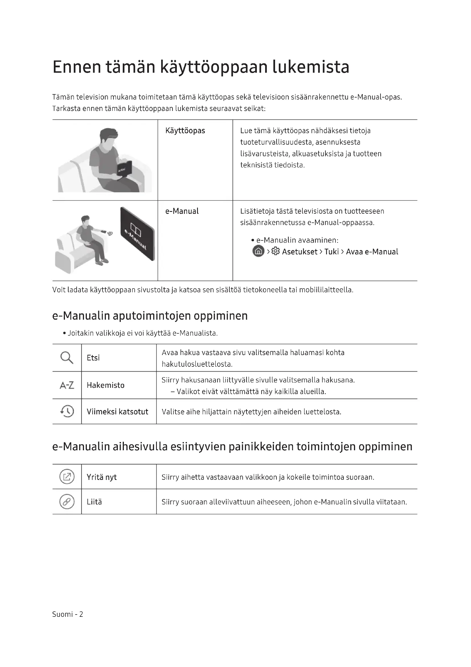 - e-Manualin avaaminen: > Asetukset > Tuki > Avaa e-Manual Voit ladata käyttöoppaan sivustolta ja katsoa sen sisältöä tietokoneella tai mobiililaitteella. e-Manualin aputoimintojen oppiminen