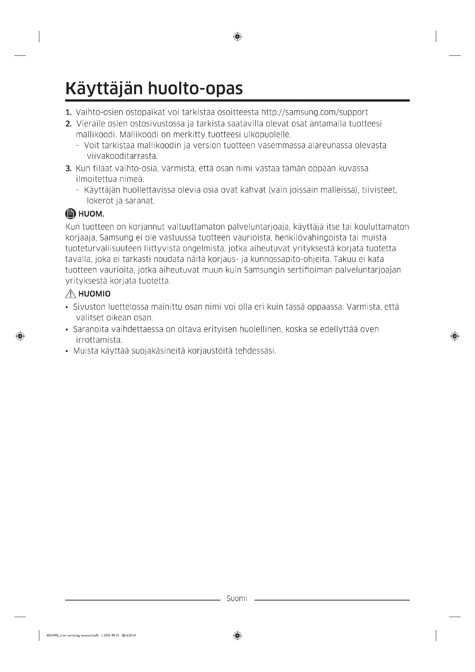 ilmoitettua nimeä. - Käyttäjän huollettavissa olevia osia ovat kahvat (vain joissain malleissa), tiivisteet, lokerot ja saranat. HUOM. Kun tuotteen on korjannut valtuuttamaton palveluntarjoaja, käyttäjä itse tai kouluttamaton korjaaja, Samsung ei ole vastuussa tuotteen vaurioista, henkilövahingoista tai muista tuoteturvallisuuteen liittyvistä ongelmista, jotka aiheutuvat yrityksestä korjata tuotetta tavalla, joka ei tarkasti noudata näitä korjaus- ja kunnossapito-ohjeita. Takuu ei kata tuotteen vaurioita, jotka aiheutuvat muun kuin Samsungin sertioiman palveluntarjoajan yrityksestä korjata tuotetta. HUOMIO