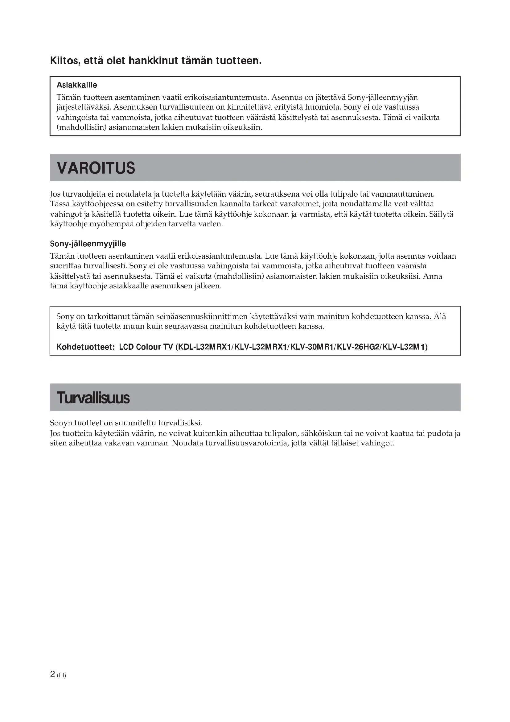 2452 (FI) Kiitos, että olet hankkinut tämän tuotteen. Asiakkaille Tämän tuotteen asentaminen vaatii erikoisasiantuntemusta. Asennus on jätettävä Sony-jälleenmyyjän järjestettäväksi. Asennuksen turvallisuuteen on kiinnitettävä erityistä huomiota. Sony ei ole vastuussa vahingoista tai vammoista, jotka aiheutuvat tuotteen väärästä käsittelystä tai asennuksesta. Tämä ei vaikuta (mahdollisiin) asianomaisten lakien mukaisiin oikeuksiin. VAROITUS Jos turvaohjeita ei noudateta ja tuotetta käytetään väärin, seurauksena voi olla tulipalo tai vammautuminen. Tässä käyttöohjeessa on esitetty turvallisuuden kannalta tärkeät varotoimet, joita noudattamalla voit välttää vahingot ja käsitellä tuotetta oikein. Lue tämä käyttöohje kokonaan ja varmista, että käytät tuotetta oikein. Säilytä käyttöohje myöhempää ohjeiden tarvetta varten. Sony-jälleenmyyjille Tämän tuotteen asentaminen vaatii erikoisasiantuntemusta. Lue tämä käyttöohje kokonaan, jotta asennus voidaan suorittaa turvallisesti. Sony ei ole vastuussa vahingoista tai vammoista, jotka aiheutuvat tuotteen väärästä käsittelystä tai asennuksesta. Tämä ei vaikuta (mahdollisiin) asianomaisten lakien mukaisiin oikeuksiisi. Anna tämä käyttöohje asiakkaalle asennuksen jälkeen. Sony on tarkoittanut tämän seinäasennuskiinnittimen käytettäväksi vain mainitun kohdetuotteen kanssa. Älä käytä tätä tuotetta muun kuin seuraavassa mainitun kohdetuotteen kanssa. Kohdetuotteet: LCD Colour TV (KDL-L32MRX1/KLV-L32MRX1/KLV-30MR1/KLV-26HG2/KLV-L32M1) Turvallisuus Sonyn tuotteet on suunniteltu turvallisiksi. Jos tuotteita käytetään väärin, ne voivat kuitenkin aiheuttaa tulipalon, sähköiskun tai ne voivat kaatua tai pudota ja siten aiheuttaa vakavan vamman. Noudata turvallisuusvarotoimia, jotta vältät tällaiset vahingot.3 (FI) Suomi