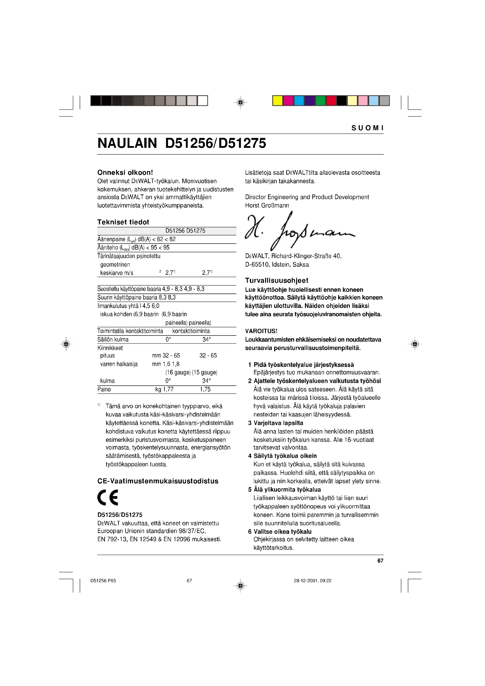 Tämä arvo on konekohtainen tyyppiarvo, eikä kuvaa vaikutusta käsi-käsivarsi-yhdistelmään käytettäessä konetta. Käsi-käsivarsi-yhdistelmään kohdistuva vaikutus konetta käytettäessä riippuu esimerkiksi puristusvoimasta, kosketuspaineen voimasta, työskentelysuunnasta, energiansyötön säätämisestä, työstökappaleesta ja työstökappaleen tuesta. CE-Vaatimustenmukaisuustodistus D51256/D51275 DEWALT vakuuttaa, että koneet on valmistettu Euroopan Unionin standardien 98/37/EC, EN 792-13, EN 12549 & EN 12096 mukaisesti. Lisätietoja saat DEWALTtilta allaolevasta osoitteesta tai käsikirjan takakannesta. Director Engineering and Product Development Horst Großmann DEWALT, Richard-Klinger-Straße 40, D-65510, Idstein, Saksa Turvallisuusohjeet Lue käyttöohje huolellisesti ennen koneen käyttöönottoa. Säilytä käyttöohje kaikkien koneen käyttäjien ulottuvilla. Näiden ohjeiden lisäksi tulee aina seurata työsuojeluviranomaisten ohjeita. VAROITUS! Loukkaantumisten ehkäisemiseksi on noudatettava seuraavia perusturvallisuustoimenpiteitä. 1 Pidä työskentelyalue järjestyksessä Epäjärjestys tuo mukanaan onnettomuusvaaran. 2 Ajattele työskentelyalueen vaikutusta työhösi Älä vie työkalua ulos sateeseen. Älä käytä sitä kosteissa tai märissä tiloissa. Järjestä työalueelle hyvä valaistus. Älä käytä työkaluja palavien nesteiden tai kaasujen läheisyydessä. 3 Varjeltava lapsilta Älä anna lasten tai muiden henkilöiden päästä kosketuksiin työkalun kanssa. Alle 16-vuotiaat tarvitsevat valvontaa. 4 Säilytä työkalua oikein Kun et käytä työkalua, säilytä sitä kuivassa paikassa. Huolehdi siitä, että säilytyspaikka on lukittu ja niin korkealla, etteivät lapset ylety sinne. 5 Älä ylikuormita työkalua Liiallisen leikkausvoiman käyttö tai liian suuri työkappaleen syöttönopeus voi ylikuormittaa koneen. Kone toimii paremmin ja turvallisemmin sille suunnitellulla suoritusalueella. 6 Valitse oikea työkalu Ohjekirjassa on selvitetty laitteen oikea käyttötarkoitus. D51256.P65 28-12-2001, 09:226768 SUOMI Ota epävarmoissa tapauksissa yhteys DEWALTin edustajaan. Laitteen tai siihen liitetyn lisälaitteen käyttö ohjekirjan suositusten vastaisesti voi aiheuttaa henkilövahinkoja. 7 Pukeudu asianmukaisesti Älä käytä liian väljiä vaatteita tai koruja. Ne voivat tarttua liikkuviin osiin. Käytä ulkona työskennellessäsi kumihansikkaita ja liukumattomia kenkiä. Jos sinulla on pitkät hiukset, käytä hiusverkkoa. 8 Älä kurottele Seiso aina tukevasti ja tasapainossa. 9 Hoida työkalua huolella Pidä työkalu puhtaana ja terät terävinä. Noudata työkalun huolto-ohjeita sekä terän/työkalun vaihto-ohjeita. Pidä työkalun kädensijat kuivina ja puhtaina öljystä ja rasvasta. 10 Ole tarkkaavainen Keskity työhösi. Käytä tervettä järkeä. Älä käytä työkalua, kun olet väsynyt. 11 Tarkista, että työkalu on kunnossa Ennen kuin otat koneen käyttöön, tarkista turvalaitteet ja kaikki koneen osat. Näin varmistat, että kone toimii sille asetettujen vaatimusten mukaisesti. Tarkista, että liikkuvat osat toimivat moitteettomasti ja että kaikki osat ovat kunnossa ja oikein asennetut. Tarkista myös, että kaikki muut käyttöön mahdollisesti vaikuttavat tekijät ovat kunnossa. Älä käytä työkalua, mikäli virtakytkin ei toimi kunnolla. 12 Turvallisuudeksi Käytä vain käyttöohjeessa ja tuotekuvastossa suositeltuja lisävarusteita ja -laitteita. Jonkin muun laitteen käyttö voi aiheuttaa onnettomuuden. 13 Korjauta koneesi DEWALTin valtuuttamalla huoltokorjaamolla Tämä työkalu on asiaankuuluvien turvallisuusmääräysten mukainen. Turvallisuussyistä vain valtuutetut ammattilaiset saavat huoltaa laitteita. Paineilmatoimisia naulaimia koskevat lisäturvaohjeet