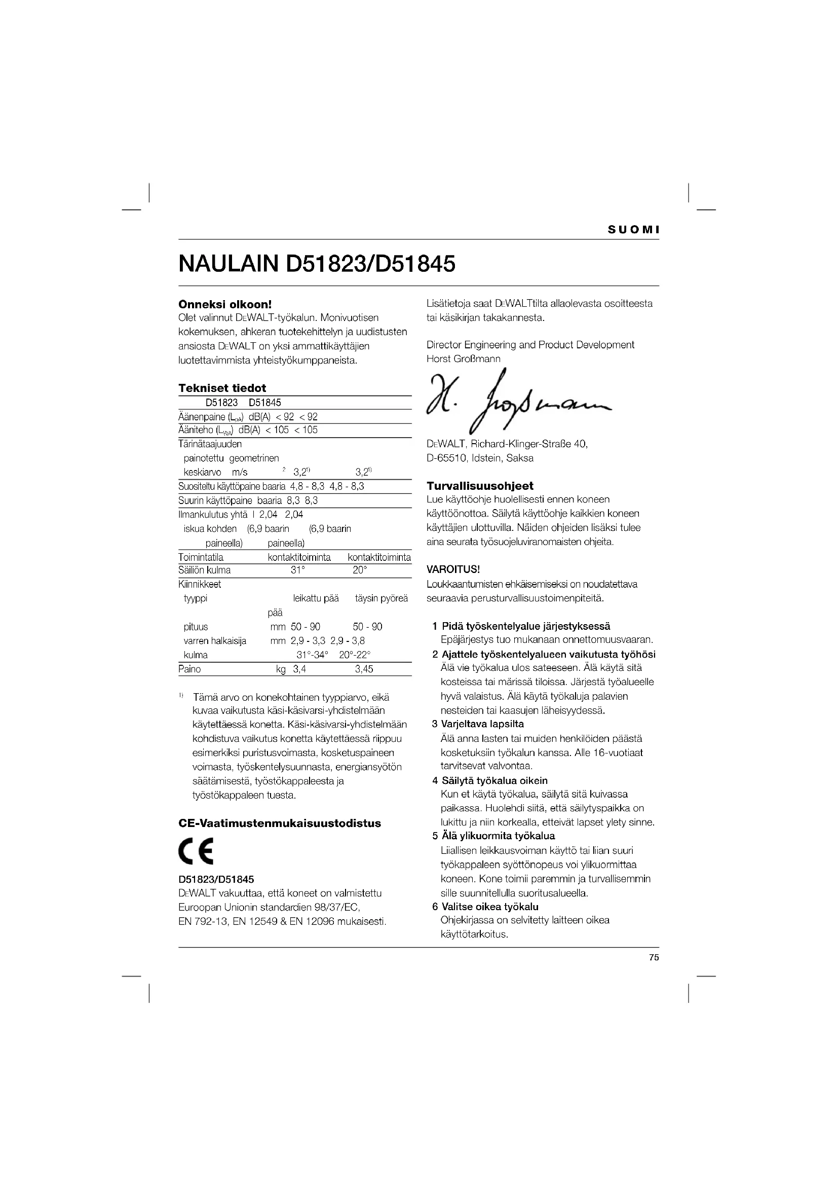 EWALT vakuuttaa, että koneet on valmistettu Euroopan Unionin standardien 98/37/EC, EN 792-13, EN 12549 & EN 12096 mukaisesti. Lisätietoja saat D EWALTtilta allaolevasta osoitteesta tai käsikirjan takakannesta. Director Engineering and Product Development Horst Großmann DEWALT, Richard-Klinger-Straße 40, D-65510, Idstein, Saksa Turvallisuusohjeet Lue käyttöohje huolellisesti ennen koneen käyttöönottoa. Säilytä käyttöohje kaikkien koneen käyttäjien ulottuvilla. Näiden ohjeiden lisäksi tulee aina seurata työsuojeluviranomaisten ohjeita. VAROITUS! Loukkaantumisten ehkäisemiseksi on noudatettava seuraavia perusturvallisuustoimenpiteitä. 1 Pidä työskentelyalue järjestyksessä Epäjärjestys tuo mukanaan onnettomuusvaaran. 2 Ajattele työskentelyalueen vaikutusta työhösi Älä vie työkalua ulos sateeseen. Älä käytä sitä kosteissa tai märissä tiloissa. Järjestä työalueelle hyvä valaistus. Älä käytä työkaluja palavien nesteiden tai kaasujen läheisyydessä. 3 Varjeltava lapsilta Älä anna lasten tai muiden henkilöiden päästä kosketuksiin työkalun kanssa. Alle 16-vuotiaat tarvitsevat valvontaa. 4 Säilytä työkalua oikein Kun et käytä työkalua, säilytä sitä kuivassa paikassa. Huolehdi siitä, että säilytyspaikka on lukittu ja niin korkealla, etteivät lapset ylety sinne. 5 Älä ylikuormita työkalua Liiallisen leikkausvoiman käyttö tai liian suuri työkappaleen syöttönopeus voi ylikuormittaa koneen. Kone toimii paremmin ja turvallisemmin sille suunnitellulla suoritusalueella. 6 Valitse oikea työkalu Ohjekirjassa on selvitetty laitteen oikea käyttötarkoitus.76 SUOMI Ota epävarmoissa tapauksissa yhteys DEWALTin edustajaan. Laitteen tai siihen liitetyn lisälaitteen käyttö ohjekirjan suositusten vastaisesti voi aiheuttaa henkilövahinkoja. 7 Pukeudu asianmukaisesti Älä käytä liian väljiä vaatteita tai koruja. Ne voivat tarttua liikkuviin osiin. Käytä ulkona työskennellessäsi kumihansikkaita ja liukumattomia kenkiä. Jos sinulla on pitkät hiukset, käytä hiusverkkoa. 8 Älä kurottele Seiso aina tukevasti ja tasapainossa. 9 Hoida työkalua huolella Pidä työkalu puhtaana ja terät terävinä. Noudata työkalun huolto-ohjeita sekä terän/työkalun vaihto-ohjeita. Pidä työkalun kädensijat kuivina ja puhtaina öljystä ja rasvasta. 10 Ole tarkkaavainen Keskity työhösi. Käytä tervettä järkeä. Älä käytä työkalua, kun olet väsynyt. 11 Tarkista, että työkalu on kunnossa Ennen kuin otat koneen käyttöön, tarkista turvalaitteet ja kaikki koneen osat. Näin varmistat, että kone toimii sille asetettujen vaatimusten mukaisesti. Tarkista, että liikkuvat osat toimivat moitteettomasti ja että kaikki osat ovat kunnossa ja oikein asennetut. Tarkista myös, että kaikki muut käyttöön mahdollisesti vaikuttavat tekijät ovat kunnossa. Älä käytä työkalua, mikäli virtakytkin ei toimi kunnolla. 12 Turvallisuudeksi Käytä vain käyttöohjeessa ja tuotekuvastossa suositeltuja lisävarusteita ja -laitteita. Jonkin muun laitteen käyttö voi aiheuttaa onnettomuuden. 13 Korjauta koneesi D EWALTin valtuuttamalla huoltokorjaamolla Tämä työkalu on asiaankuuluvien turvallisuusmääräysten mukainen. Turvallisuussyistä vain valtuutetut ammattilaiset saavat huoltaa laitteita. Paineilmatoimisia naulaimia koskevat lisäturvaohjeet