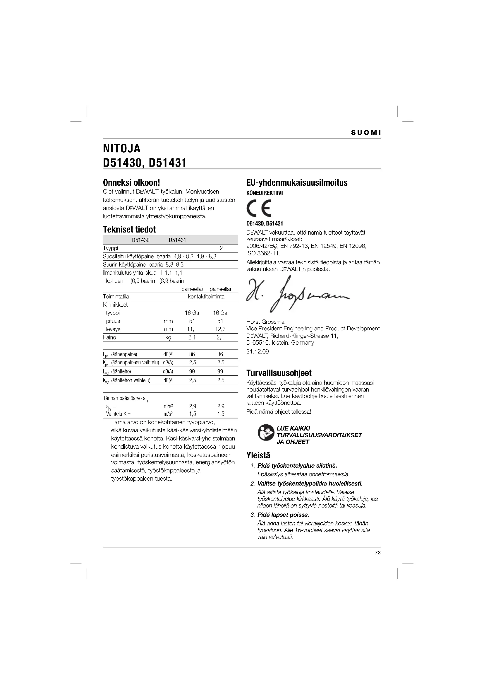 m/s² 2,9 2,9 Vaihtelu K = m/s² 1,5 1,5 Tämä arvo on konekohtainen tyyppiarvo, eikä kuvaa vaikutusta käsi-käsivarsi-yhdistelmään käytettäessä konetta. Käsi-käsivarsi-yhdistelmään kohdistuva vaikutus konetta käytettäessä riippuu esimerkiksi puristusvoimasta, kosketuspaineen voimasta, työskentelysuunnasta, energiansyötön säätämisestä, työstökappaleesta ja työstökappaleen tuesta. EU-yhdenmukaisuusilmoitus KONEDIREKTIIVI D51430, D51431 DEWALT vakuuttaa, että nämä tuotteet täyttävät seuraavat määräykset: 2006/42/EC, EN 792-13, EN 12549, EN 12096, ISO 8662-11. Allekirjoittaja vastaa teknisistä tiedoista ja antaa tämän vakuutuksen DEWALTin puolesta. Horst Grossmann Vice President Engineering and Product Development DEWALT, Richard-Klinger-Strasse 11, D-65510, Idstein, Germany