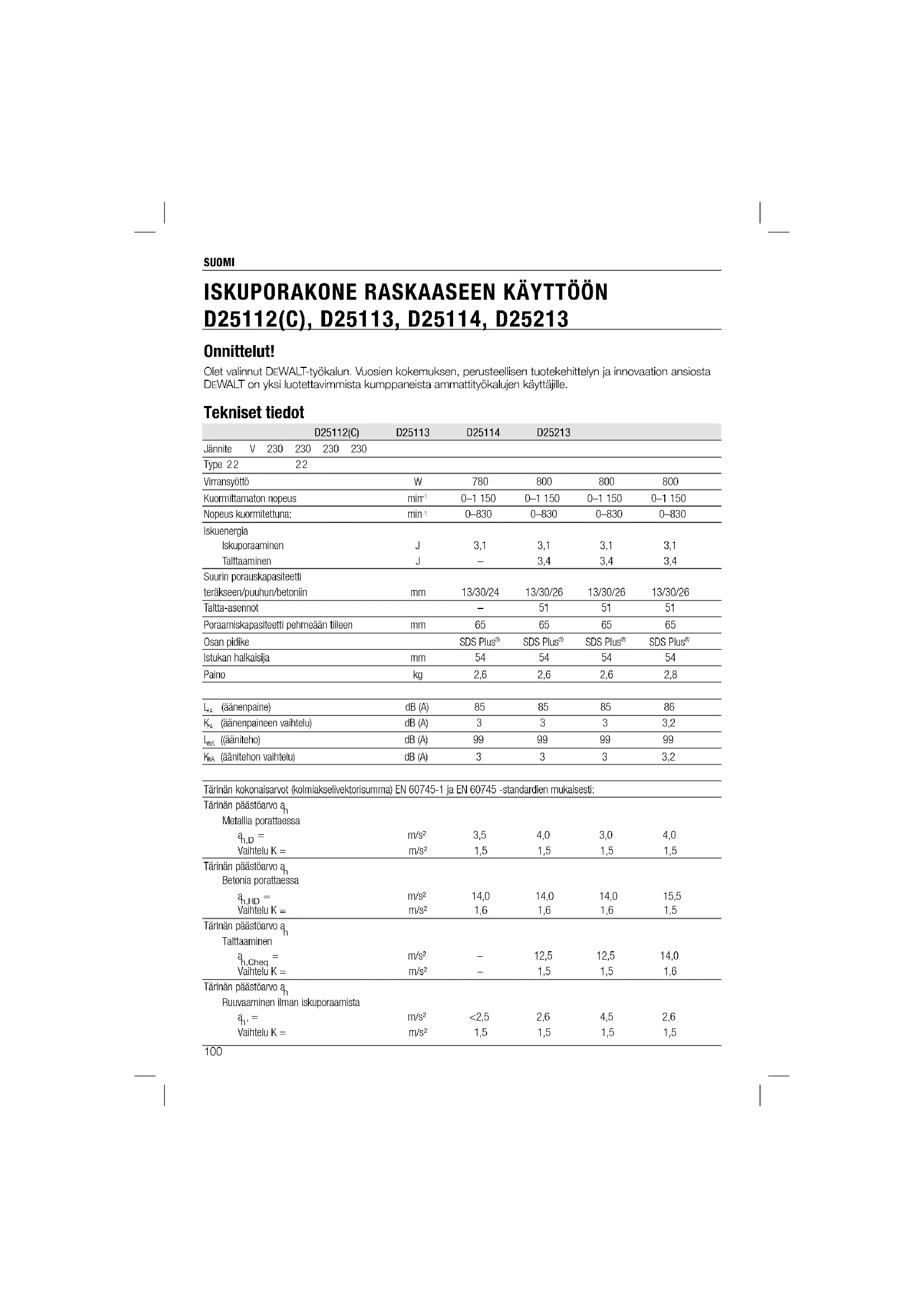 D25112(C), D25113, D25114, D25213 Onnittelut! Olet valinnut DEWALT-työkalun. Vuosien kokemuksen, perusteellisen tuotekehittelyn ja innovaation ansiosta DEWALT on yksi luotettavimmista kumppaneista ammattityökalujen käyttäjille. Tekniset tiedot D25112(C) D25113 D25114 D25213 Jännite V 230 230 230 230 Type 2 2 2 2 Virransyöttö W 780 800 800 800 Kuormittamaton nopeus min