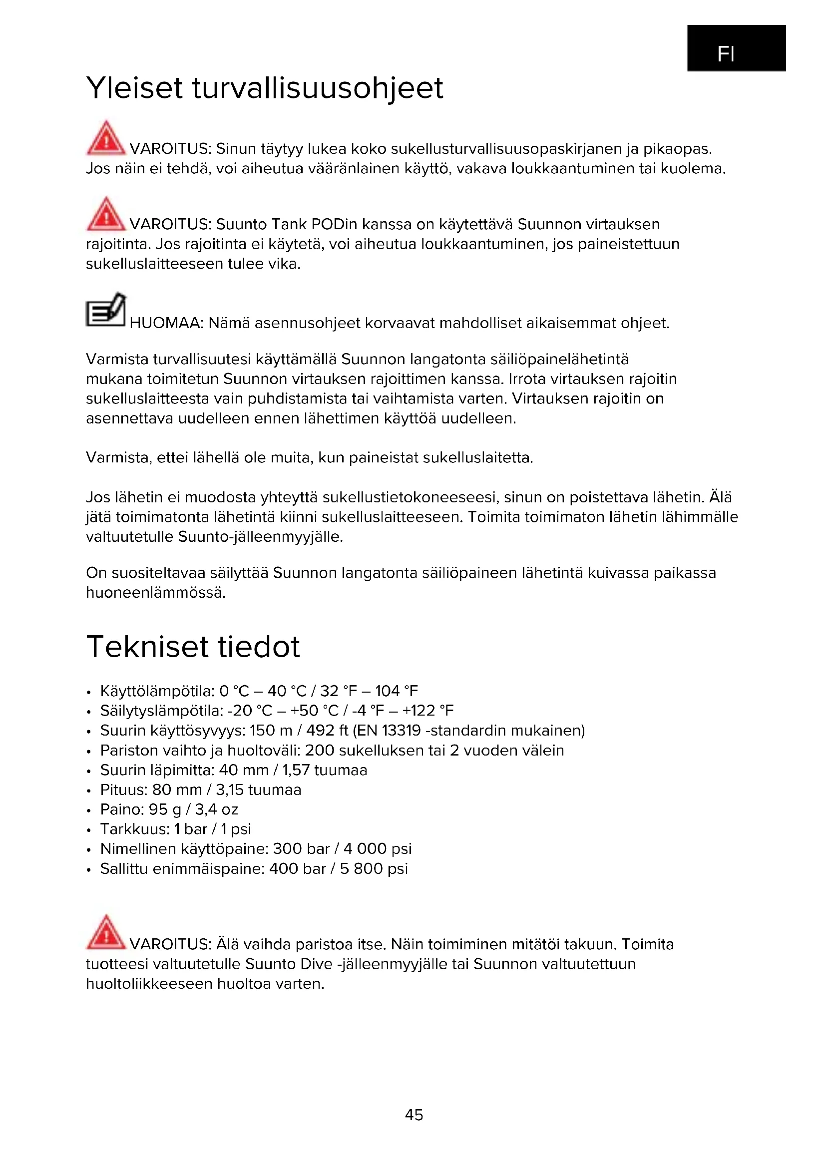 - Sallittu enimmäispaine: 400 bar / 5 800 psi VAROITUS: Älä vaihda paristoa itse. Näin toimiminen mitätöi takuun. Toimita tuotteesi valtuutetulle Suunto Dive -jälleenmyyjälle tai Suunnon valtuutettuun huoltoliikkeeseen huoltoa varten. FI46