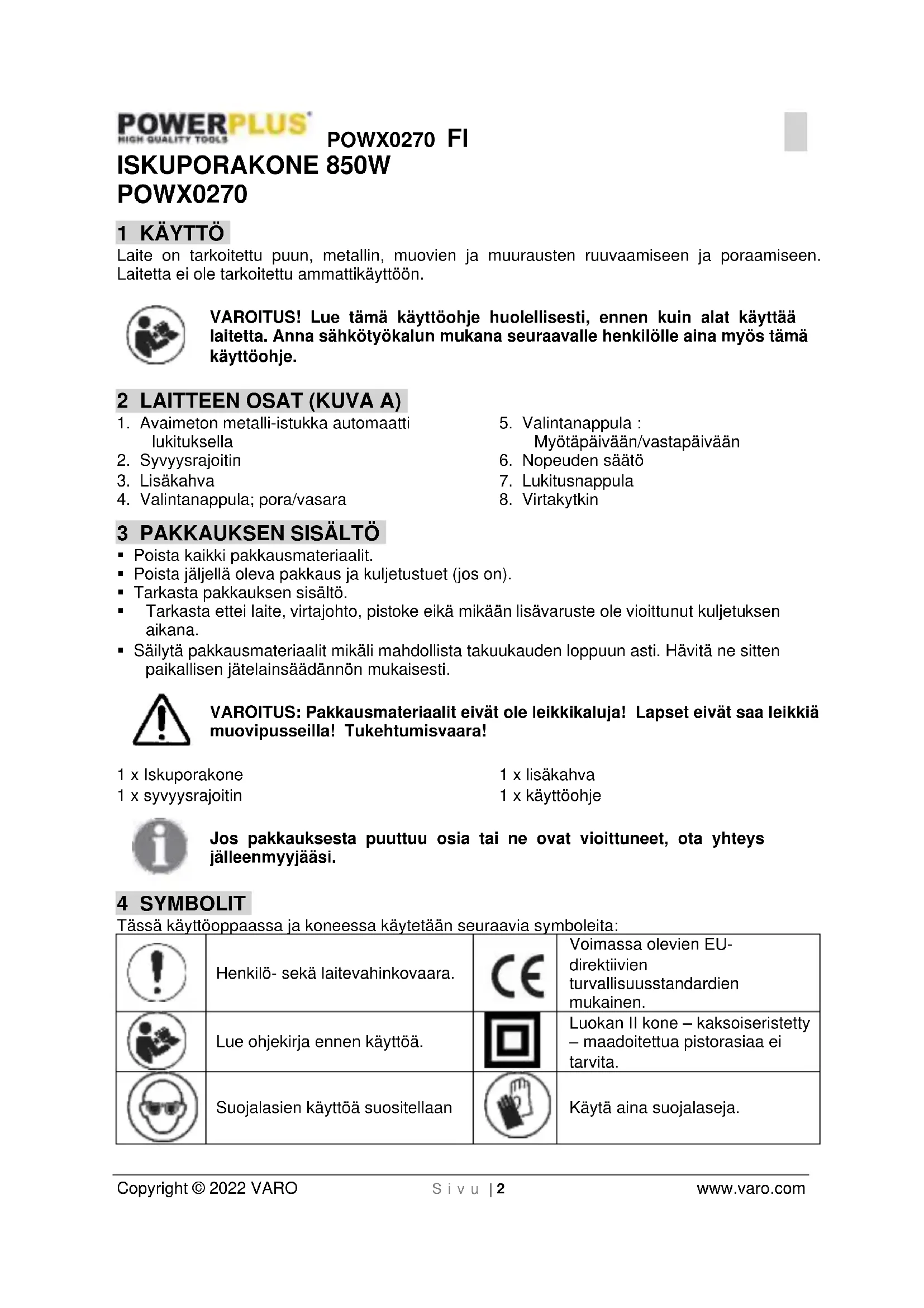 Copyright © 2022 VARO S i v u | 2 www.varo.com ISKUPORAKONE 850W POWX0270 1 KÄYTTÖ Laite on tarkoitettu puun, metallin, muovien ja muurausten ruuvaamiseen ja poraamiseen. Laitetta ei ole tarkoitettu ammattikäyttöön. VAROITUS! Lue tämä käyttöohje huolellisesti, ennen kuin alat käyttää laitetta. Anna sähkötyökalun mukana seuraavalle henkilölle aina myös tämä käyttöohje. 2 LAITTEEN OSAT (KUVA A)