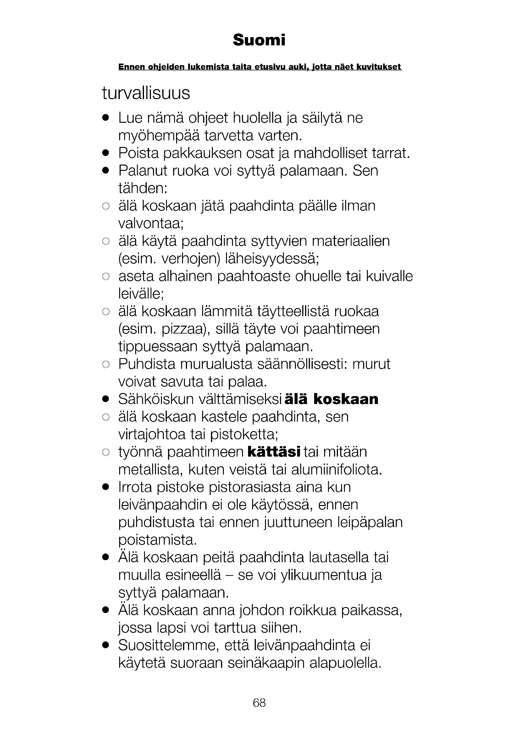 Palanut ruoka voi syttyä palamaan. Sen tähden: älä koskaan jätä paahdinta päälle ilman valvontaa; älä käytä paahdinta syttyvien materiaalien (esim. verhojen) läheisyydessä; aseta alhainen paahtoaste ohuelle tai kuivalle leivälle;