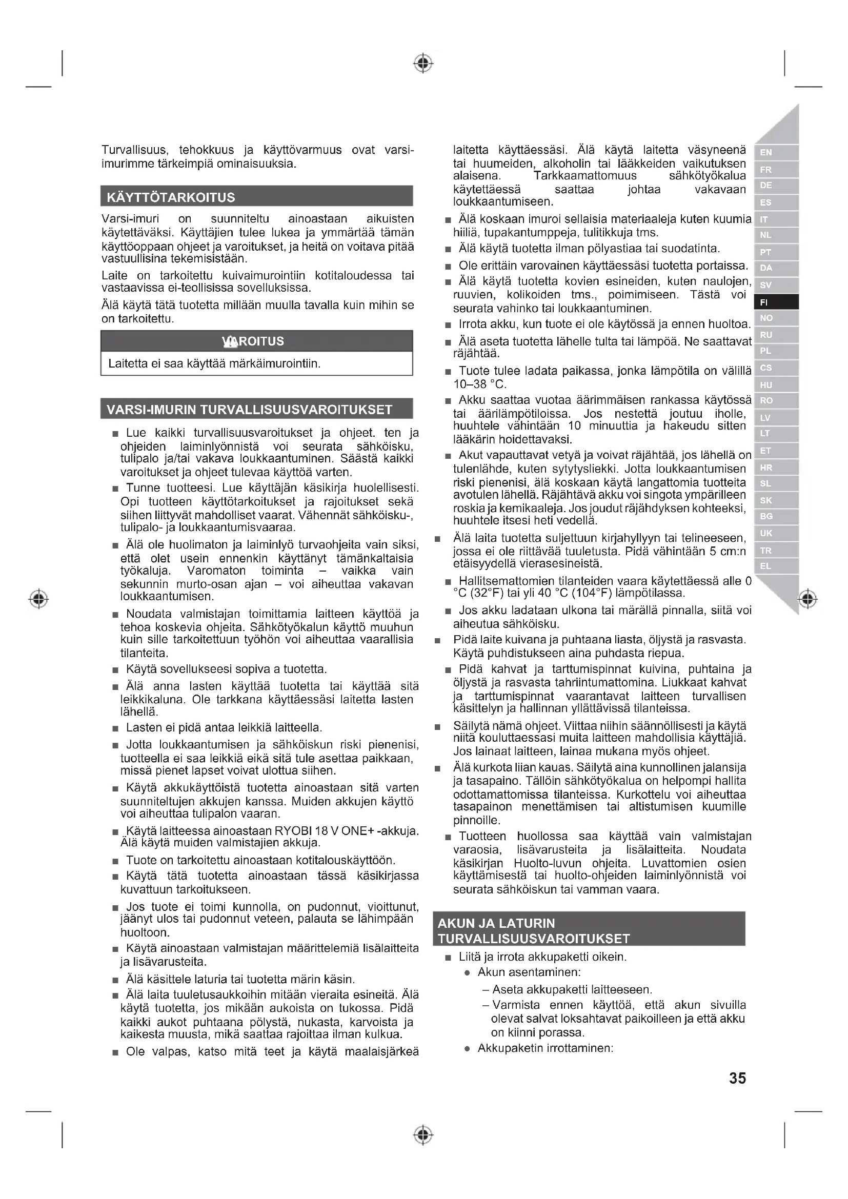 Varsi-imuri on suunniteltu ainoastaan aikuisten käytettäväksi. Käyttäjien tulee lukea ja ymmärtää tämän käyttöoppaan ohjeet ja varoitukset, ja heitä on voitava pitää vastuullisina tekemisistään. Laite on tarkoitettu kuivaimurointiin kotitaloudessa tai vastaavissa ei-teollisissa sovelluksissa. Älä käytä tätä tuotetta millään muulla tavalla kuin mihin se on tarkoitettu. VAROITUS Laitetta ei saa käyttää märkäimurointiin. VARSI-IMURIN TURVALLISUUSVAROITUKSET ■ Lue kaikki turvallisuusvaroitukset ja ohjeet. ten ja ohjeiden laiminlyönnistä voi seurata sähköisku, tulipalo ja/tai vakava loukkaantuminen. Säästä kaikki varoitukset ja ohjeet tulevaa käyttöä varten. ■ Tunne tuotteesi. Lue käyttäjän käsikirja huolellisesti. Opi tuotteen käyttötarkoitukset ja rajoitukset sekä siihen liittyvät mahdolliset vaarat. Vähennät sähköisku-, tulipalo- ja loukkaantumisvaaraa. ■ Älä ole huolimaton ja laiminlyö turvaohjeita vain siksi, että olet usein ennenkin käyttänyt tämänkaltaisia työkaluja. Varomaton toiminta – vaikka vain sekunnin murto-osan ajan – voi aiheuttaa vakavan loukkaantumisen. ■ Noudata valmistajan toimittamia laitteen käyttöä ja tehoa koskevia ohjeita. Sähkötyökalun käyttö muuhun kuin sille tarkoitettuun työhön voi aiheuttaa vaarallisia tilanteita. ■ Käytä sovellukseesi sopiva a tuotetta. ■ Älä anna lasten käyttää tuotetta tai käyttää sitä leikkikaluna. Ole tarkkana käyttäessäsi laitetta lasten lähellä. ■ Lasten ei pidä antaa leikkiä laitteella. ■ Jotta loukkaantumisen ja sähköiskun riski pienenisi, tuotteella ei saa leikkiä eikä sitä tule asettaa paikkaan, missä pienet lapset voivat ulottua siihen. ■ Käytä akkukäyttöistä tuotetta ainoastaan sitä varten suunniteltujen akkujen kanssa. Muiden akkujen käyttö voi aiheuttaa tulipalon vaaran. ■ Käytä laitteessa ainoastaan RYOBI 18 V ONE+ -akkuja. Älä käytä muiden valmistajien akkuja. ■ Tuote on tarkoitettu ainoastaan kotitalouskäyttöön. ■ Käytä tätä tuotetta ainoastaan tässä käsikirjassa kuvattuun tarkoitukseen. ■ Jos tuote ei toimi kunnolla, on pudonnut, vioittunut, jäänyt ulos tai pudonnut veteen, palauta se lähimpään huoltoon. ■ Käytä ainoastaan valmistajan määrittelemiä lisälaitteita ja lisävarusteita. ■ Älä käsittele laturia tai tuotetta märin käsin. ■ Älä laita tuuletusaukkoihin mitään vieraita esineitä. Älä käytä tuotetta, jos mikään aukoista on tukossa. Pidä kaikki aukot puhtaana pölystä, nukasta, karvoista ja kaikesta muusta, mikä saattaa rajoittaa ilman kulkua. ■ Ole valpas, katso mitä teet ja käytä maalaisjärkeä laitetta käyttäessäsi. Älä käytä laitetta väsyneenä tai huumeiden, alkoholin tai lääkkeiden vaikutuksen alaisena. Tarkkaamattomuus sähkötyökalua käytettäessä saattaa johtaa vakavaan loukkaantumiseen. ■ Älä koskaan imuroi sellaisia materiaaleja kuten kuumia hiiliä, tupakantumppeja, tulitikkuja tms. ■ Älä käytä tuotetta ilman pölyastiaa tai suodatinta. ■ Ole erittäin varovainen käyttäessäsi tuotetta portaissa. ■ Älä käytä tuotetta kovien esineiden, kuten naulojen, ruuvien, kolikoiden tms., poimimiseen. Tästä voi seurata vahinko tai loukkaantuminen. ■ Irrota akku, kun tuote ei ole käytössä ja ennen huoltoa. ■ Älä aseta tuotetta lähelle tulta tai lämpöä. Ne saattavat räjähtää. ■ Tuote tulee ladata paikassa, jonka lämpötila on välillä 10–38 °C. ■ Akku saattaa vuotaa äärimmäisen rankassa käytössä tai äärilämpötiloissa. Jos nestettä joutuu iholle, huuhtele vähintään 10 minuuttia ja hakeudu sitten lääkärin hoidettavaksi. ■ Akut vapauttavat vetyä ja voivat räjähtää, jos lähellä on tulenlähde, kuten sytytysliekki. Jotta loukkaantumisen riski pienenisi, älä koskaan käytä langattomia tuotteita avotulen lähellä. Räjähtävä akku voi singota ympärilleen roskia ja kemikaaleja. Jos joudut räjähdyksen kohteeksi, huuhtele itsesi heti vedellä. ■ Älä laita tuotetta suljettuun kirjahyllyyn tai telineeseen, jossa ei ole riittävää tuuletusta. Pidä vähintään 5 cm:n etäisyydellä vierasesineistä. ■ Hallitsemattomien tilanteiden vaara käytettäessä alle 0 °C (32°F) tai yli 40 °C (104°F) lämpötilassa. ■ Jos akku ladataan ulkona tai märällä pinnalla, siitä voi aiheutua sähköisku. ■ Pidä laite kuivana ja puhtaana liasta, öljystä ja rasvasta. Käytä puhdistukseen aina puhdasta riepua. ■ Pidä kahvat ja tarttumispinnat kuivina, puhtaina ja öljystä ja rasvasta tahriintumattomina. Liukkaat kahvat ja tarttumispinnat vaarantavat laitteen turvallisen käsittelyn ja hallinnan yllättävissä tilanteissa. ■ Säilytä nämä ohjeet. Viittaa niihin säännöllisesti ja käytä niitä kouluttaessasi muita laitteen mahdollisia käyttäjiä. Jos lainaat laitteen, lainaa mukana myös ohjeet. ■ Älä kurkota liian kauas. Säilytä aina kunnollinen jalansija ja tasapaino. Tällöin sähkötyökalua on helpompi hallita odottamattomissa tilanteissa. Kurkottelu voi aiheuttaa tasapainon menettämisen tai altistumisen kuumille pinnoille. ■ Tuotteen huollossa saa käyttää vain valmistajan varaosia, lisävarusteita ja lisälaitteita. Noudata käsikirjan Huolto-luvun ohjeita. Luvattomien osien käyttämisestä tai huolto-ohjeiden laiminlyönnistä voi seurata sähköiskun tai vamman vaara.
