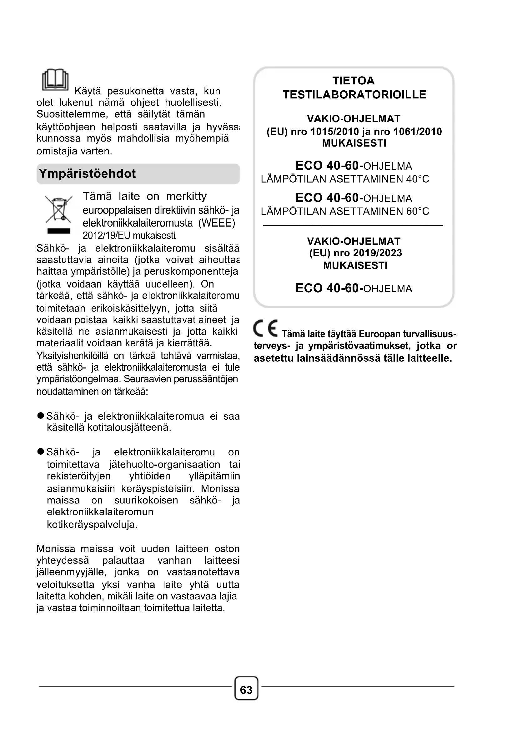 Ympäristöehdot TIETOA TESTILABORATORIOILLE VAKIO-OHJELMAT (EU) nro 1015/2010 ja nro 1061/2010 MUKAISESTI