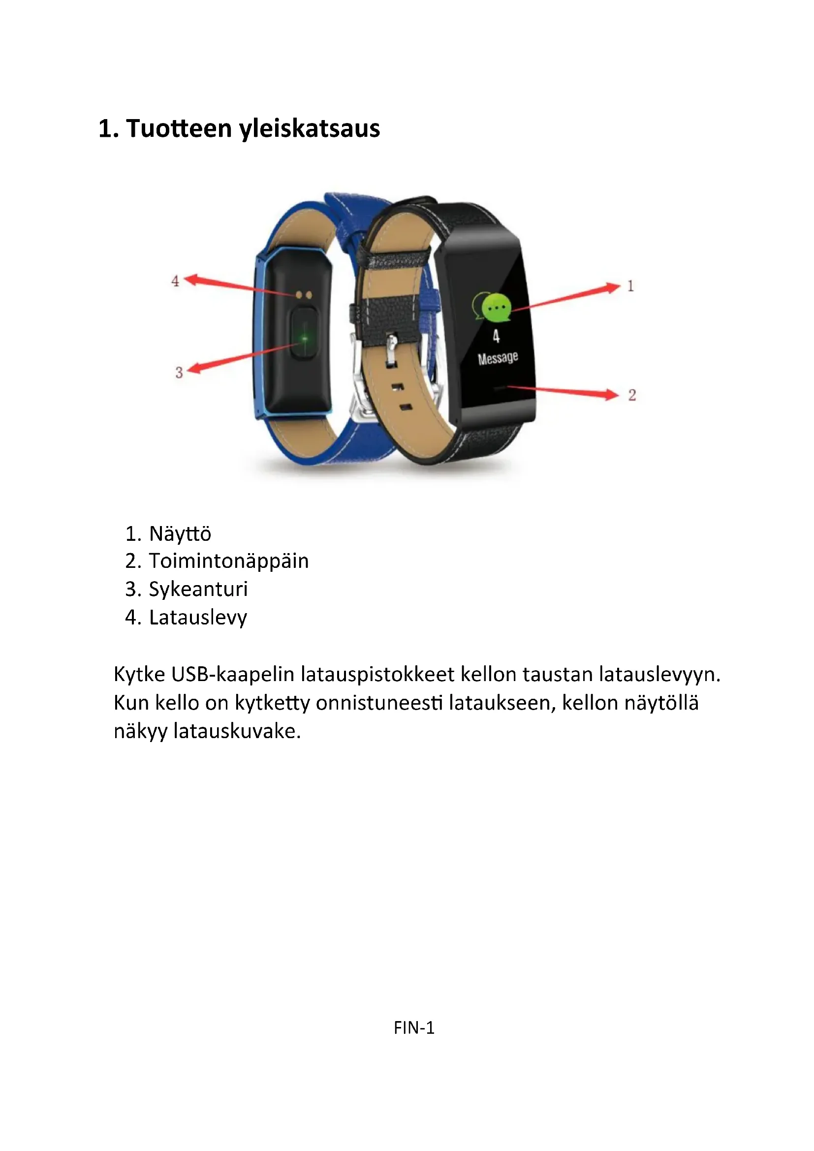 Kytke USB-kaapelin latauspistokkeet kellon taustan latauslevyyn. Kun kello on kytketty onnistuneesti lataukseen, kellon näytöllä näkyy latauskuvake.FIN-2