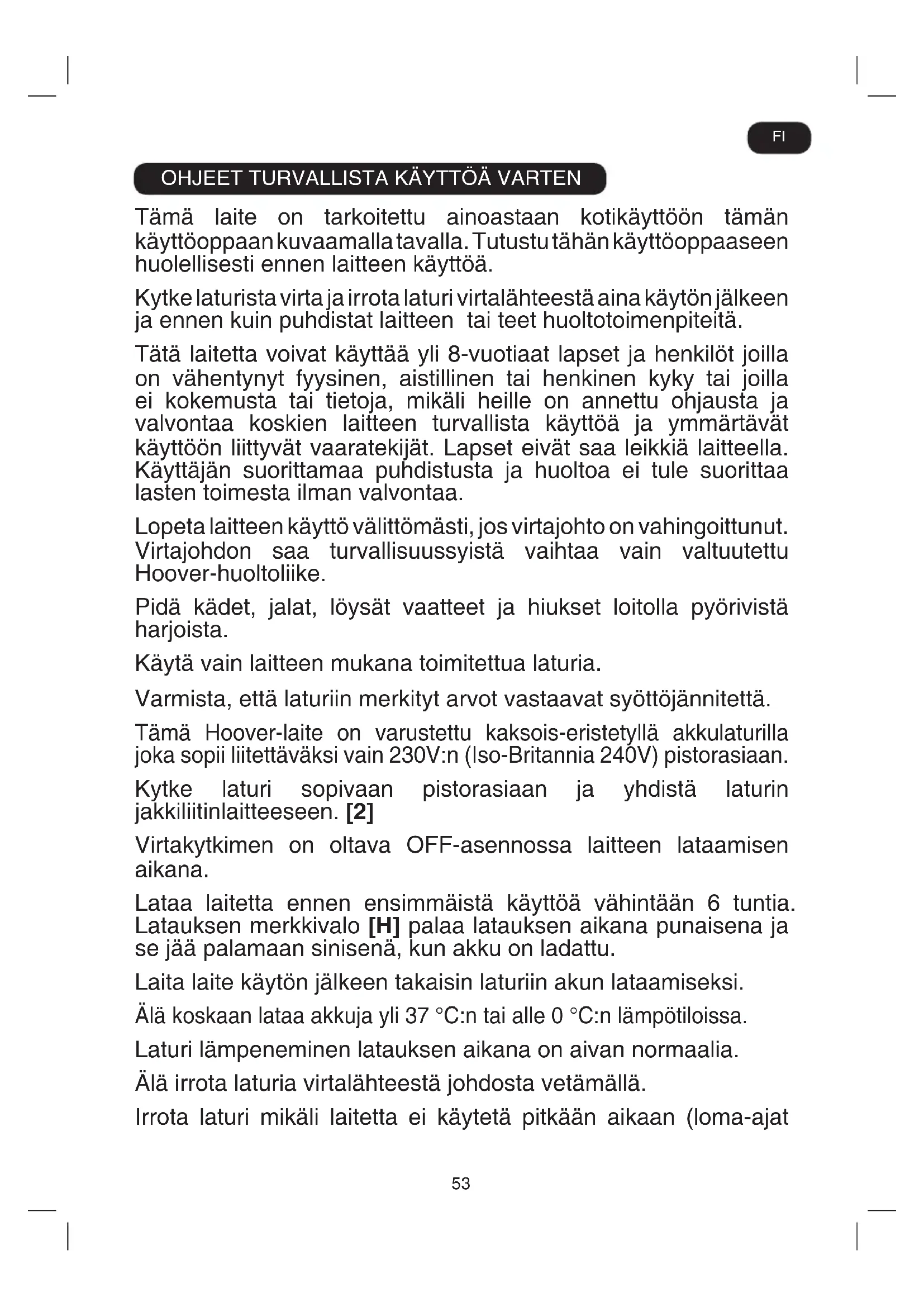 Tämä laite on tarkoitettu ainoastaan kotikäyttöön tämän käyttöoppaan kuvaamalla tavalla. Tutustu tähän käyttöoppaaseen huolellisesti ennen laitteen käyttöä. Kytke laturista virta ja irrota laturi virtalähteestä aina käytön jälkeen ja ennen kuin puhdistat laitteen tai teet huoltotoimenpiteitä. Tätä laitetta voivat käyttää yli 8-vuotiaat lapset ja henkilöt joilla on vähentynyt fyysinen, aistillinen tai henkinen kyky tai joilla ei kokemusta tai tietoja, mikäli heille on annettu ohjausta ja valvontaa koskien laitteen turvallista käyttöä ja ymmärtävät käyttöön liittyvät vaaratekijät. Lapset eivät saa leikkiä laitteella. Käyttäjän suorittamaa puhdistusta ja huoltoa ei tule suorittaa lasten toimesta ilman valvontaa. Lopeta laitteen käyttö välittömästi, jos virtajohto on vahingoittunut. Virtajohdon saa turvallisuussyistä vaihtaa vain valtuutettu Hoover-huoltoliike. Pidä kädet, jalat, löysät vaatteet ja hiukset loitolla pyörivistä harjoista. Käytä vain laitteen mukana toimitettua laturia. Varmista, että laturiin merkityt arvot vastaavat syöttöjännitettä. Tämä Hoover-laite on varustettu kaksois-eristetyllä akkulaturilla joka sopii liitettäväksi vain 230V:n (Iso-Britannia 240V) pistorasiaan. Kytke laturi sopivaan pistorasiaan ja yhdistä laturin jakkiliitinlaitteeseen. [2] Virtakytkimen on oltava OFF-asennossa laitteen lataamisen aikana. Lataa laitetta ennen ensimmäistä käyttöä vähintään 6 tuntia. Latauksen merkkivalo [H] palaa latauksen aikana punaisena ja se jää palamaan sinisenä, kun akku on ladattu. Laita laite käytön jälkeen takaisin laturiin akun lataamiseksi. Älä koskaan lataa akkuja yli 37 °C:n tai alle 0 °C:n lämpötiloissa. Laturi lämpeneminen latauksen aikana on aivan normaalia. Älä irrota laturia virtalähteestä johdosta vetämällä. Irrota laturi mikäli laitetta ei käytetä pitkään aikaan (loma-ajat FI54 jne.). Lataa laite uudelleen ennen käyttöä koska akut voivat purkaa varausta pitkien säilytysjaksojen aikana. Jos laite hävitetään, akut on ensin poistettava. Laitteen täytyy olla irti verkkovirrasta akkua vaihdettaessa. Hävitä akut turvallisesti. Käytä laitetta kunnes se pysähtyy, jotta akut tyhjentyvät kokonaan. Vie käytetyt akut kierrätyskeskukseen. Älä hävitä niitä kotitalousjätteen mukana. Irrottaaksesi akut ota yhteyttä valtuutettuun Hoover huoltoliikkeeseen tai noudata seuraavia ohjeita. TÄRKEÄÄ: Tyhjennä paristot aina kokonaan ennen niiden poistamista. Käytä imuria kunnes akut ovat täysin tyhjät. Irrota laturin liitin laitteesta. Vedä akkupaketin vapautuspainike taakse, jolloin akkupaketti työntyy automaattisesti hieman ulospäin. [14a] Vedä akkupaketti hitaasti pois paikaltaan. [14b] Huomaa: Jos sinulla on vaikeuksia purkaa laitetta tai tarvitset yksityiskohtaisempaa tietoa laitteen jälkikäsittelystä, talteenotosta ja kierrätyksestä, ota yhteyttä paikallisiin kierrätysviranomaisiin tai kotitalouksien jätehuoltoon. Käytä ainoastaan Hooverin toimittamia tai suosittelemia kiinnityskappaleita, lisävarusteita tai varaosia. Staattinen sähkö: Jotkin matot voivat aiheuttaa vähäisen määrän staattista sähköä. Staattisen sähkön purkaus ei ole vaarallista terveydelle. Älä käytä laitettasi ulkona tai märällä alustalla. Älä imuroi nesteitä. Älä imuroi kovia tai teräviä esineitä, tulitikkuja, kuumaa tuhkaa, tupakantumppeja tai muita vastaavia esineitä. Älä ruiskuta laitteelle tai imuroi laitteella syttyviä nesteitä, puhdistusnesteitä, aerosoleja tai näiden höyryjä. Älä aja laitteella verkkojohdon yli tai irrota pistoketta virtalähteestä johdosta vetämällä. Älä käytä laitetta tai laturia, jos se vaikuttaa vialliselta. Hoover-huolto: Laitteen käyttöturvallisuuden ja tehokkaan toiminnan varmistamiseksi huolto ja korjaukset kannattaa teettää valtuutetussa Hoover-huollossa. FITUOTTEEN OSAT A. Latausasema * B. 2 in 1 -Pölyharja * C. Mattoharjan vapautuspainike D. Tehosuulake E. Suulakkeen ledvalo * F. Putki G. Lisävarusteen vapautuspainike H. Rikkaimurin ledvalo