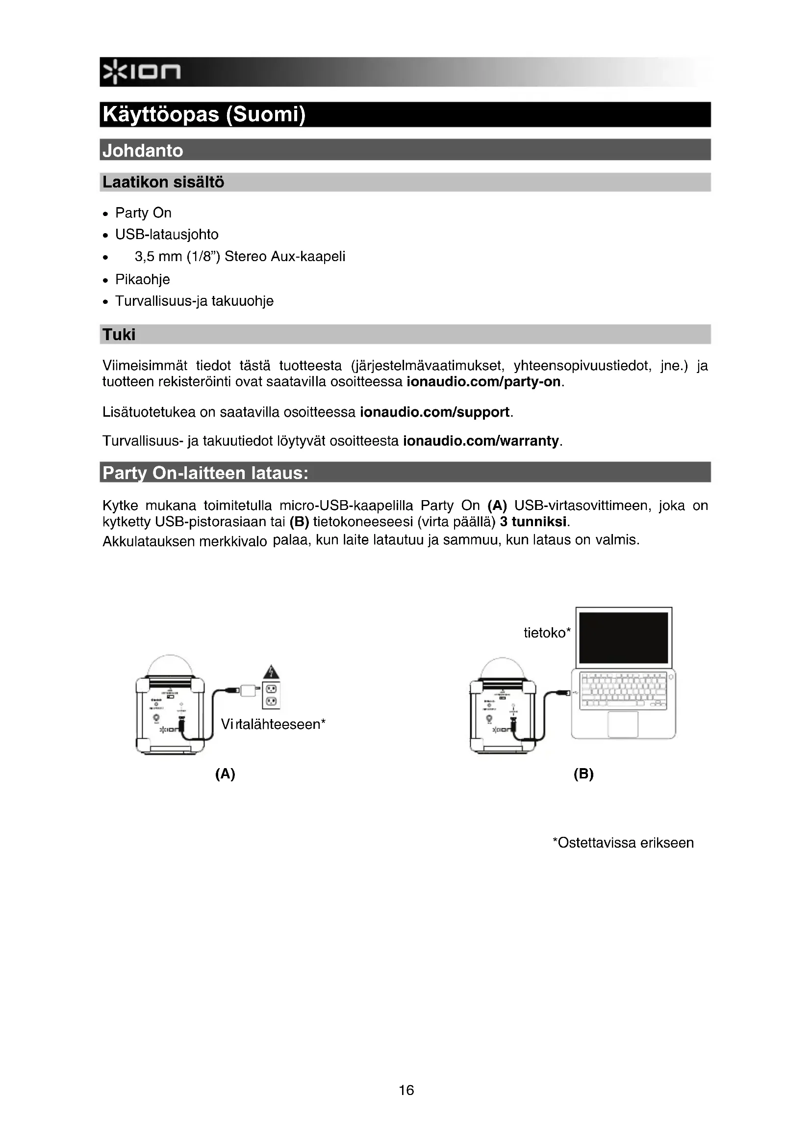 - Pikaohje • Turvallisuus-ja takuuohje Tuki Viimeisimmät tiedot tästä tuotteesta (järjestelmävaatimukset, yhteensopivuustiedot, jne.) ja tuotteen rekisteröinti ovat saatavilla osoitteessa ionaudio.com/party-on. Lisätuotetukea on saatavilla osoitteessa ionaudio.com/support. Turvallisuus- ja takuutiedot löytyvät osoitteesta ionaudio.com/warranty. Party On-laitteen lataus: Kytke mukana toimitetulla micro-USB-kaapelilla Party On (A) USB-virtasovittimeen, joka on kytketty USB-pistorasiaan tai (B) tietokoneeseesi (virta päällä) 3 tunniksi. Akkulatauksen merkkivalo palaa, kun laite latautuu ja sammuu, kun lataus on valmis.