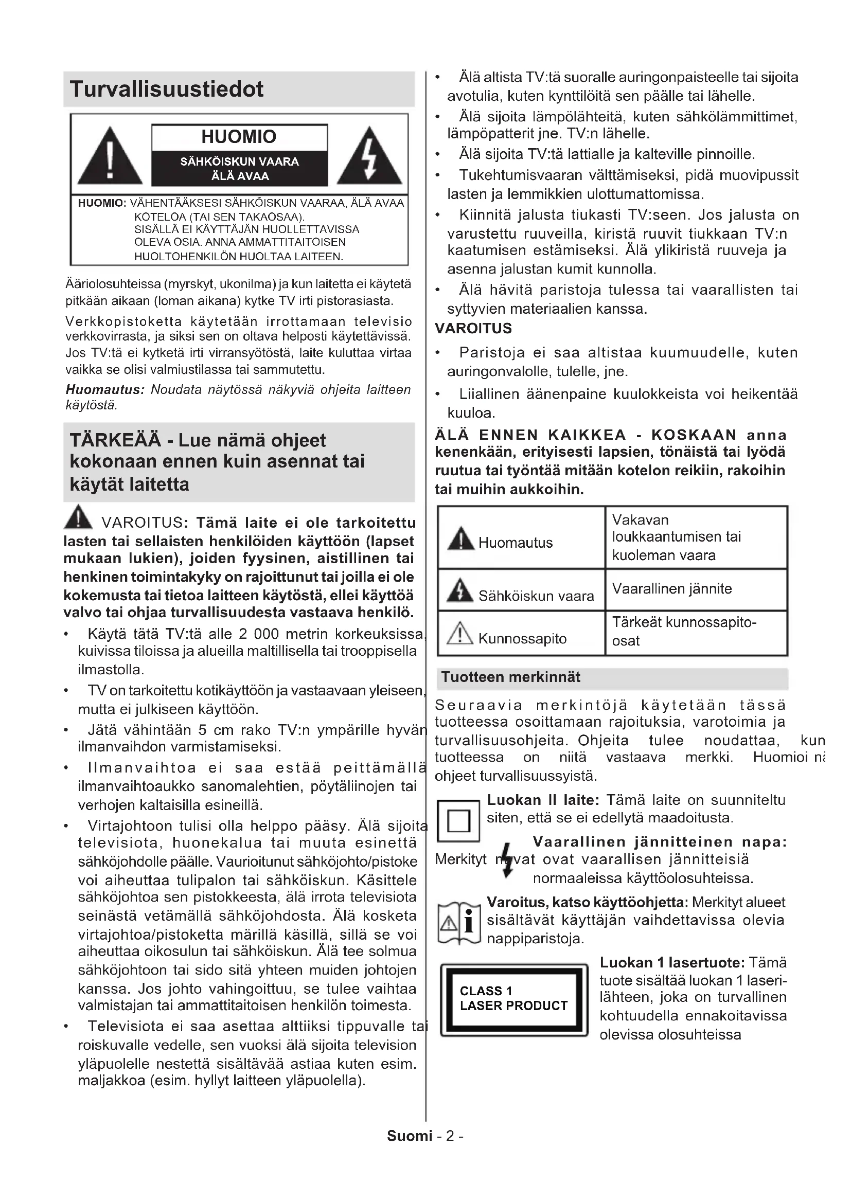 - Tiedot hävittämisestä Suomi - 2 - Turvallisuustiedot HUOMIO SÄHKÖISKUN VAARAÄLÄ AVAAHUOMIO: VÄHENTÄÄKSESI SÄHKÖISKUN VAARAA, ÄLÄ AVAA KOTELOA (TAI SEN TAKAOSAA). SISÄLLÄ EI KÄYTTÄJÄN HUOLLETTAVISSA OLEVA OSIA. ANNA AMMATTITAITOISEN HUOLTOHENKILÖN HUOLTAA LAITEEN.Huomautus: Noudata näytössä näkyviä ohjeita laitteen käytöstä.Ääriolosuhteissa (myrskyt, ukonilma) ja kun laitetta ei käytetä pitkään aikaan (loman aikana) kytke TV irti pistorasiasta.Verkkopistoketta käytetään irrottamaan televisio verkkovirrasta, ja siksi sen on oltava helposti käytettävissä. Jos TV:tä ei kytketä irti virransyötöstä, laite kuluttaa virtaa vaikka se olisi valmiustilassa tai sammutettu. TÄRKEÄÄ - Lue nämä ohjeet kokonaan ennen kuin asennat tai käytät laitetta VAROITUS: Tämä laite ei ole tarkoitettu lasten tai sellaisten henkilöiden käyttöön (lapset mukaan lukien), joiden fyysinen, aistillinen tai henkinen toimintakyky on rajoittunut tai joilla ei ole kokemusta tai tietoa laitteen käytöstä, ellei käyttöä valvo tai ohjaa turvallisuudesta vastaava henkilö. p. 35