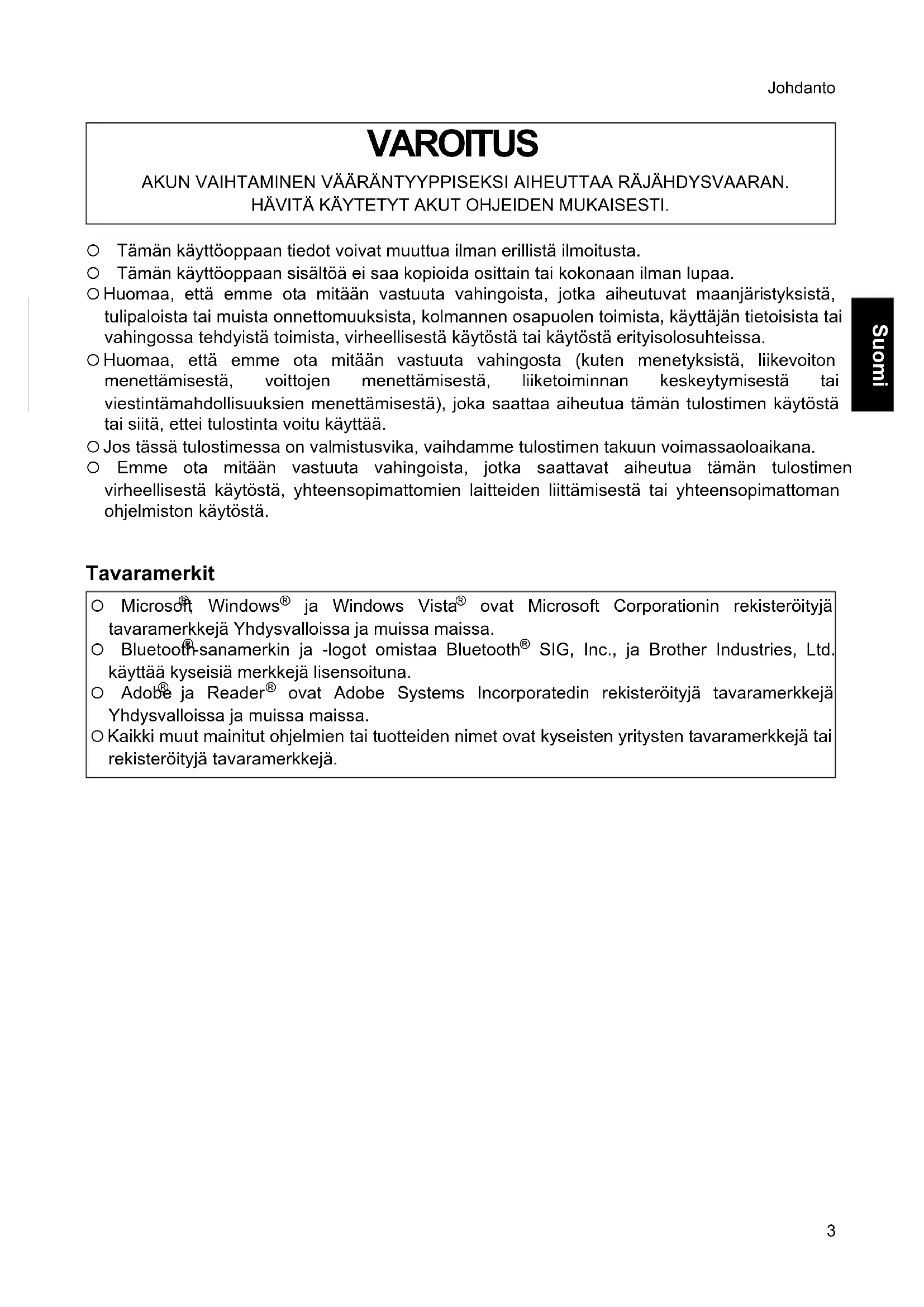 Suomi { Tämän käyttöoppaan tiedot voivat muuttua ilman erillistä ilmoitusta. { Tämän käyttöoppaan sisältöä ei saa kopioida osittain tai kokonaan ilman lupaa. { Huomaa, että emme ota mitään vastuuta vahingoista, jotka aiheutuvat maanjäristyksistä, tulipaloista tai muista onnettomuuksista, kolmannen osapuolen toimista, käyttäjän tietoisista tai vahingossa tehdyistä toimista, virheellisestä käytöstä tai käytöstä erityisolosuhteissa. { Huomaa, että emme ota mitään vastuuta vahingosta (kuten menetyksistä, liikevoiton menettämisestä, voittojen menettämisestä, liiketoiminnan keskeytymisestä tai viestintämahdollisuuksien menettämisestä), joka saattaa aiheutua tämän tulostimen käytöstä tai siitä, ettei tulostinta voitu käyttää. { Jos tässä tulostimessa on valmistusvika, vaihdamme tulostimen takuun voimassaoloaikana. { Emme ota mitään vastuuta vahingoista, jotka saattavat aiheutua tämän tulostimen virheellisestä käytöstä, yhteensopimattomien laitteiden liittämisestä tai yhteensopimattoman ohjelmiston käytöstä. Tavaramerkit VAROITUS AKUN VAIHTAMINEN VÄÄRÄNTYYPPISEKSI AIHEUTTAA RÄJÄHDYSVAARAN. HÄVITÄ KÄYTETYT AKUT OHJEIDEN MUKAISESTI. { Microsoft