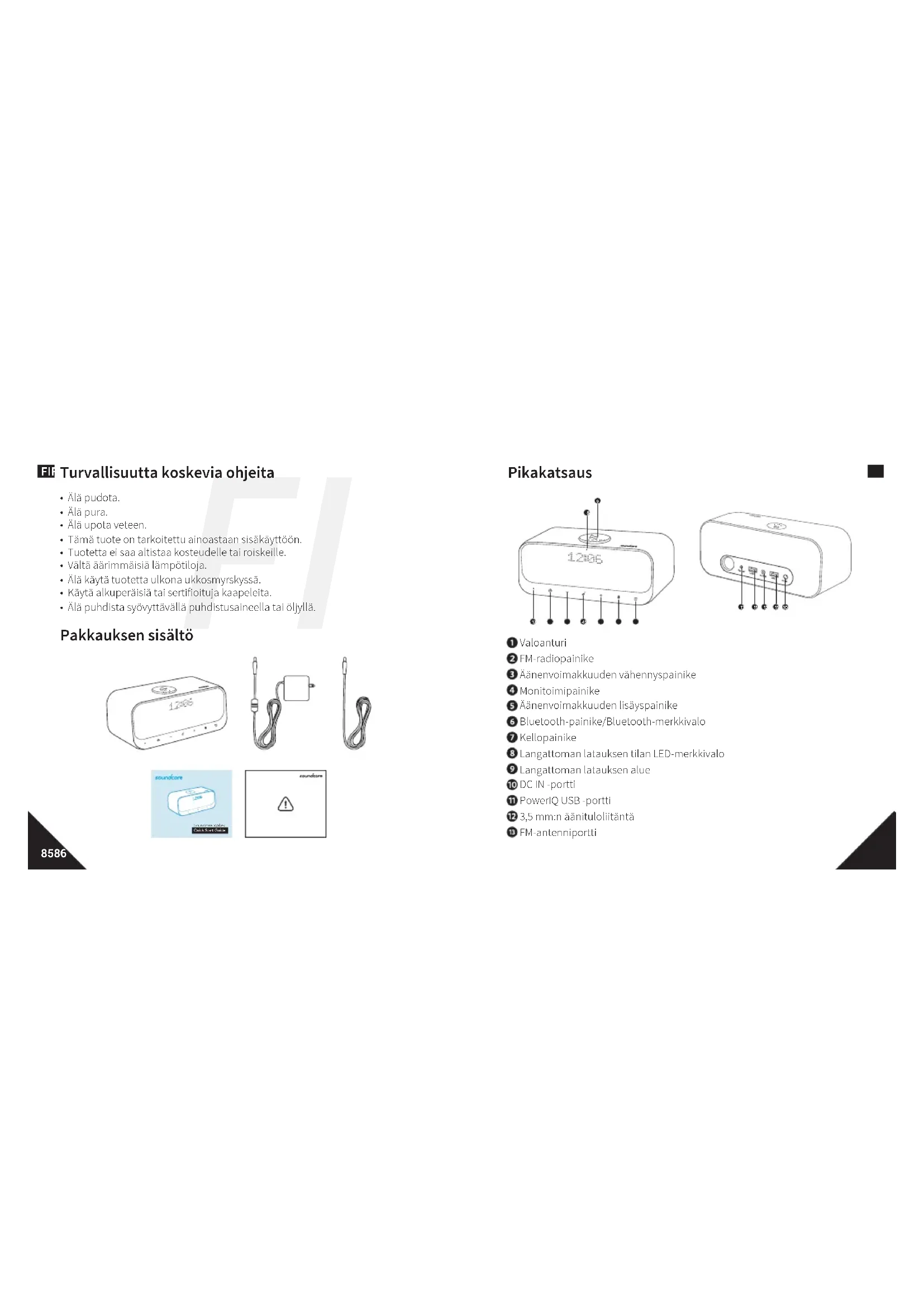 Valoanturi FM-radiopainike Äänenvoimakkuuden vähennyspainike Monitoimipainike Äänenvoimakkuuden lisäyspainike Bluetooth-painike/Bluetooth-merkkivalo Kellopainike Langattoman latauksen tilan LED-merkkivalo Langattoman latauksen alue DC IN -portti PowerIQ USB -portti 3,5 mm:n äänituloliitäntä FM-antenniporttiFI FI