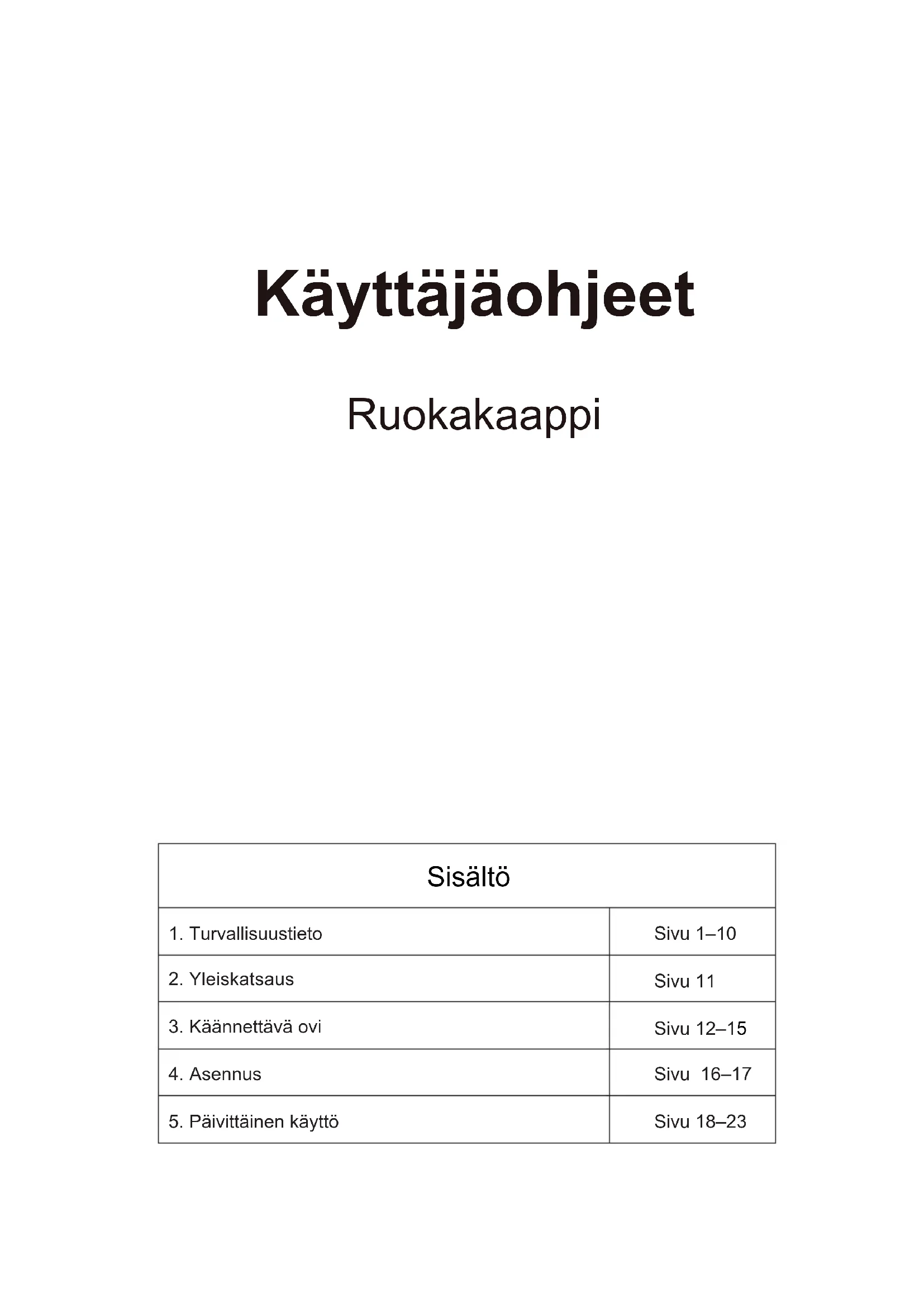 Sivu 18–23Kiitos, että ostit tämän tuotteen. Lue tämä käyttöopas huolellisesti ennen jääkaapin käyttämistä, jotta sen suoritusteho olisi paras mahdollinen. Säilytä kaikki asiakirjat myöhempää käyttöä tai toisia omistajia varten. Tuote on tarkoitettu yksinomaan kotitalouskäyttöön ja vastaaviin tarkoituksiin, kuten: - henkilöstökeittiöt kaupoissa, toimistoissa ja muissa työympäristöissä - maatilat, hotellien, motellien ja muiden majatalojen asiakkaiden käyttöympäristöt - aamiaismajoitus (Bed & Breakfast) - pitopalvelut ja vastaavat, ei jälleenmyynti. Laitett a saa käyttää vain elintarvikkeiden säilyttämiseen. Kaikki muu käyttö katsotaan vaaralliseksi, eikä valmistaja ole vastuussa mistään vaurioista. Suosittelemme myös kiinnittämään huomiota takuuehtoihin. TURVALLISUUSTIEDOT Lue käyttö- ja asennusohjeet huolellisesti! Ne sisältävät tärkeää tietoa laitteen asennuksesta, käytöstä ja ylläpidosta. Laitteen valmistaja ei ole vastuussa sellaista seurauksista, jotka aiheutuvat, jos et noudata laitteen ohjeita ja varoituksia. Säilytä kaikki asiakirjat, jotta voit luovuttaa ne seuraavalle mahdolliselle omistajalle.