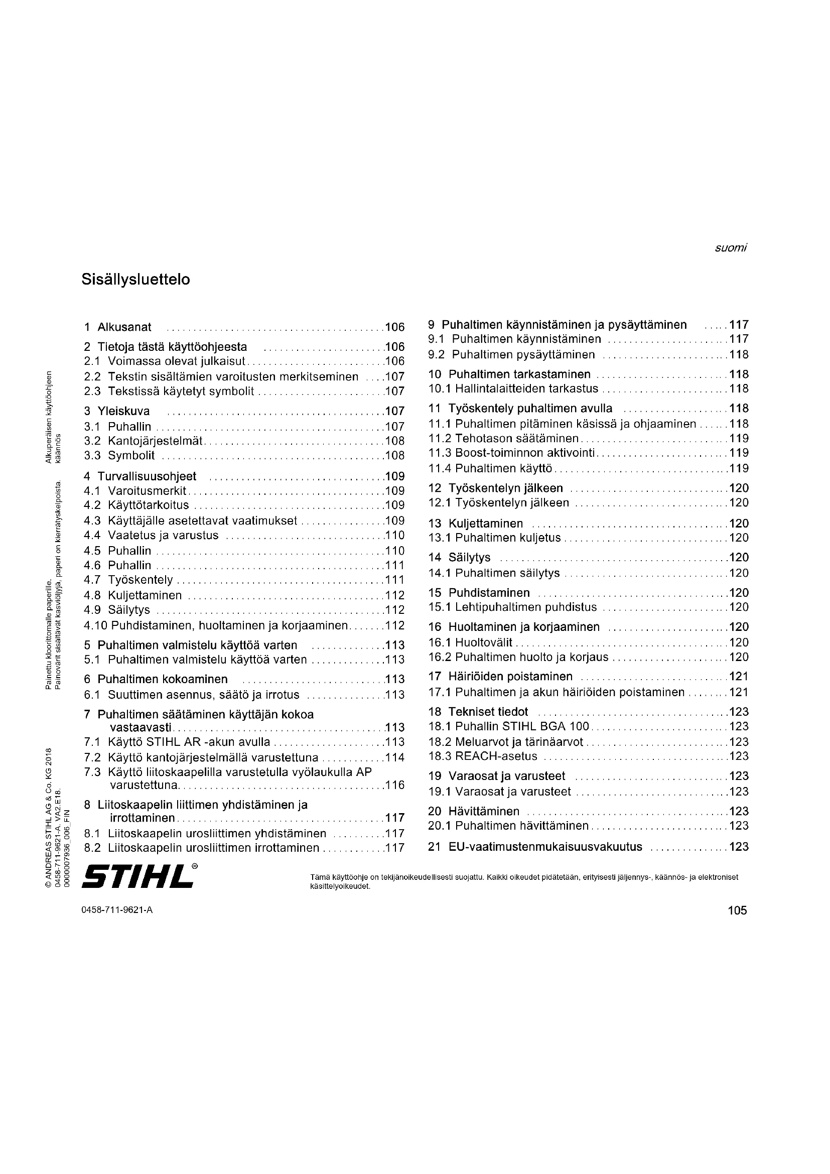 Käyttäjä ei saa itse huoltaa eikä korjata puhallinta. ► Jos puhallin vaatii huoltoa tai jos puhallin on viallinen tai vaurioitunut: Ota yhteyttä STIHL-jälleenmyyjään. 12 Työskentelyn jälkeen 13 Kuljettaminen 14 Säilytys 15 Puhdistaminen 16 Huoltaminen ja korjaaminen0458-711-9621-A