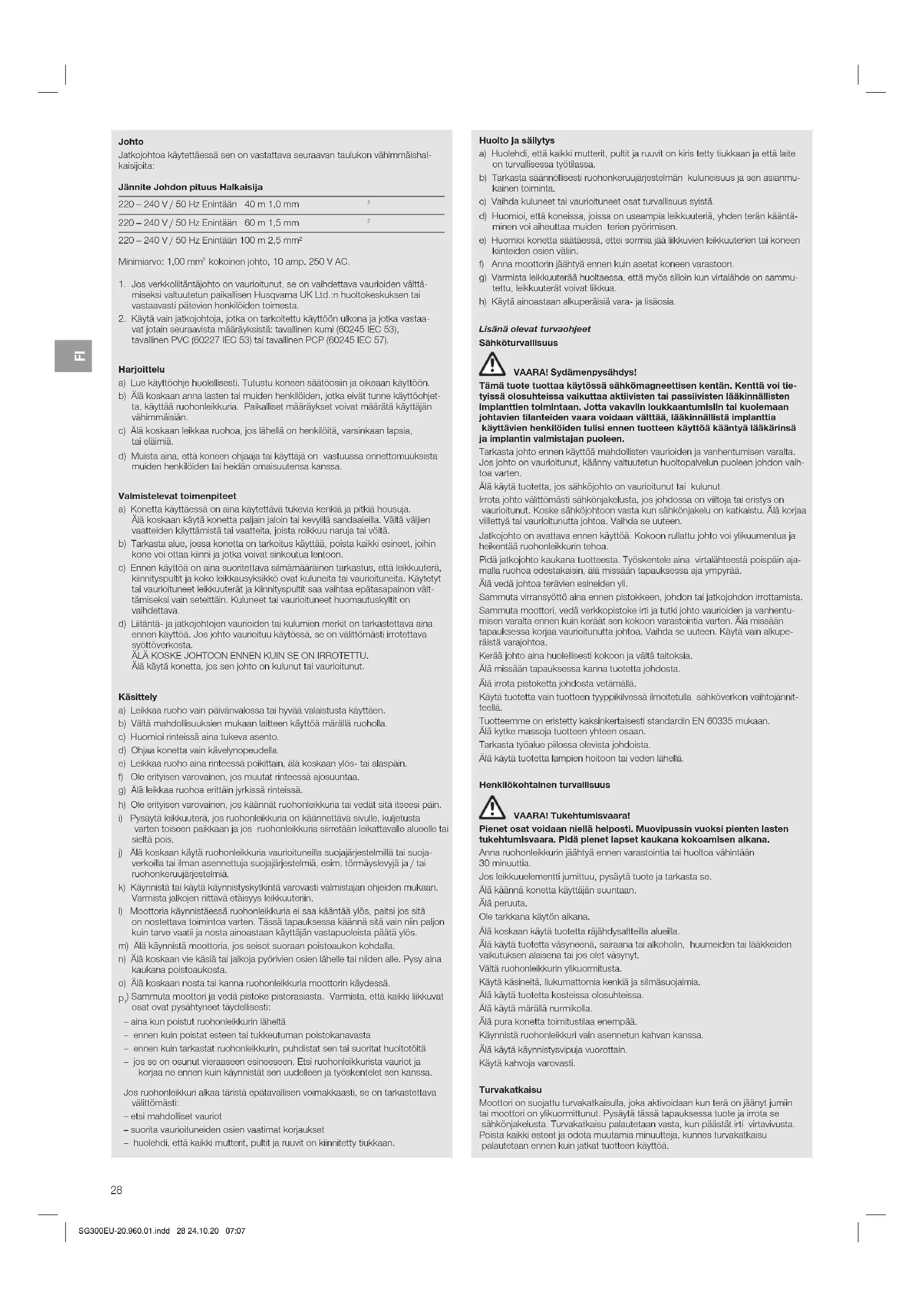 ) Sammuta moottori ja vedä pistoke pistorasiasta. Varmista, että kaikki liikkuvat osat ovat pysähtyneet täydellisesti: – aina kun poistut ruohonleikkurin läheltä – ennen kuin poistat esteen tai tukkeutuman poistokanavasta – ennen kuin tarkastat ruohonleikkurin, puhdistat sen tai suoritat huoltotöitä – jos se on osunut vieraaseen esineeseen. Etsi ruohonleikkurista vauriot ja korjaa ne ennen kuin käynnistät sen uudelleen ja työskentelet sen kanssa. Jos ruohonleikkuri alkaa täristä epätavallisen voimakkaasti, se on tarkastettava välittömästi: – etsi mahdolliset vauriot – suorita vaurioituneiden osien vaatimat korjaukset – huolehdi, että kaikki mutterit, pultit ja ruuvit on kiinnitetty tiukkaan. Huolto ja säilytys a) Huolehdi, että kaikki mutterit, pultit ja ruuvit on kiris tetty tiukkaan ja että laite on turvallisessa työtilassa. b) Tarkasta säännöllisesti ruohonkeruujärjestelmän kuluneisuus ja sen asianmu- kainen toiminta. c) Vaihda kuluneet tai vaurioituneet osat turvallisuus syistä. d) Huomioi, että koneissa, joissa on useampia leikkuuteriä, yhden terän kääntä- minen voi aiheuttaa muiden terien pyörimisen. e) Huomioi konetta säätäessä, ettei sormia jää liikkuvien leikkuuterien tai koneen kiinteiden osien väliin. f) Anna moottorin jäähtyä ennen kuin asetat koneen varastoon. g) Varmista leikkuuterää huoltaessa, että myös silloin kun virtalähde on sammu- tettu, leikkuuterät voivat liikkua. h) Käytä ainoastaan alkuperäisiä vara- ja lisäosia. Lisänä olevat turvaohjeet Sähköturvallisuus VAARA! Sydämenpysähdys! Tämä tuote tuottaa käytössä sähkömagneettisen kentän. Kenttä voi tie- tyissä olosuhteissa vaikuttaa aktiivisten tai passiivisten lääkinnällisten implanttien toimintaan. Jotta vakaviin loukkaantumisiin tai kuolemaan johtavien tilanteiden vaara voidaan välttää, lääkinnällistä implanttia käyttävien henkilöiden tulisi ennen tuotteen käyttöä kääntyä lääkärinsä jaimplantin valmistajan puoleen. Tarkasta johto ennen käyttöä mahdollisten vaurioiden ja vanhentumisen varalta. Jos johto on vaurioitunut, käänny valtuutetun huoltopalvelun puoleen johdon vaih- toa varten. Älä käytä tuotetta, jos sähköjohto on vaurioitunut tai kulunut. Irrota johto välittömästi sähkönjakelusta, jos johdossa on viiltoja tai eristys on vaurioitunut. Koske sähköjohtoon vasta kun sähkönjakelu on katkaistu. Älä korjaa viillettyä tai vaurioitunutta johtoa. Vaihda se uuteen. Jatkojohto on avattava ennen käyttöä. Kokoon rullattu johto voi ylikuumentua ja heikentää ruohonleikkurin tehoa. Pidä jatkojohto kaukana tuotteesta. Työskentele aina virtalähteestä poispäin aja- malla ruohoa edestakaisin, älä missään tapauksessa aja ympyrää. Älä vedä johtoa terävien esineiden yli. Sammuta virransyöttö aina ennen pistokkeen, johdon tai jatkojohdon irrottamista. Sammuta moottori, vedä verkkopistoke irti ja tutki johto vaurioiden ja vanhentu- misen varalta ennen kuin keräät sen kokoon varastointia varten. Älä missään tapauksessa korjaa vaurioitunutta johtoa. Vaihda se uuteen. Käytä vain alkupe- räistä varajohtoa. Kerää johto aina huolellisesti kokoon ja vältä taitoksia. Älä missään tapauksessa kanna tuotetta johdosta. Älä irrota pistoketta johdosta vetämällä. Käytä tuotetta vain tuotteen tyyppikilvessä ilmoitetulla sähköverkon vaihtojännit- teellä. Tuotteemme on eristetty kaksinkertaisesti standardin EN 60335 mukaan. Älä kytke massoja tuotteen yhteen osaan. Tarkasta työalue piilossa olevista johdoista. Älä käytä tuotetta lampien hoitoon tai veden lähellä. Henkilökohtainen turvallisuus VAARA! Tukehtumisvaara! Pienet osat voidaan niellä helposti. Muovipussin vuoksi pienten lasten tukehtumisvaara. Pidä pienet lapset kaukana kokoamisen aikana. Anna ruohonleikkurin jäähtyä ennen varastointia tai huoltoa vähintään 30 minuuttia. Jos leikkuuelementti jumittuu, pysäytä tuote ja tarkasta se. Älä käännä konetta käyttäjän suuntaan. Älä peruuta. Ole tarkkana käytön aikana. Älä koskaan käytä tuotetta räjähdysaltteilla alueilla. Älä käytä tuotetta väsyneenä, sairaana tai alkoholin, huumeiden tai lääkkeiden vaikutuksen alaisena tai jos olet väsynyt. Vältä ruohonleikkurin ylikuormitusta. Käytä käsineitä, liukumattomia kenkiä ja silmäsuojaimia. Älä käytä tuotetta kosteissa olosuhteissa. Älä käytä märällä nurmikolla. Älä pura konetta toimitustilaa enempää. Käynnistä ruohonleikkuri vain asennetun kahvan kanssa. Älä käytä käynnistysvipuja vuorottain. Käytä kahvoja varovasti. Turvakatkaisu Moottori on suojattu turvakatkaisulla, joka aktivoidaan kun terä on jäänyt jumiin tai moottori on ylikuormittunut. Pysäytä tässä tapauksessa tuote ja irrota se sähkönjakelusta. Turvakatkaisu palautetaan vasta, kun päästät irti virtavivusta. Poista kaikki esteet ja odota muutamia minuutteja, kunnes turvakatkaisu palautetaan ennen kuin jatkat tuotteen käyttöä. SG300EU-20.960.01.indd 28 24.10.20 07:07FI