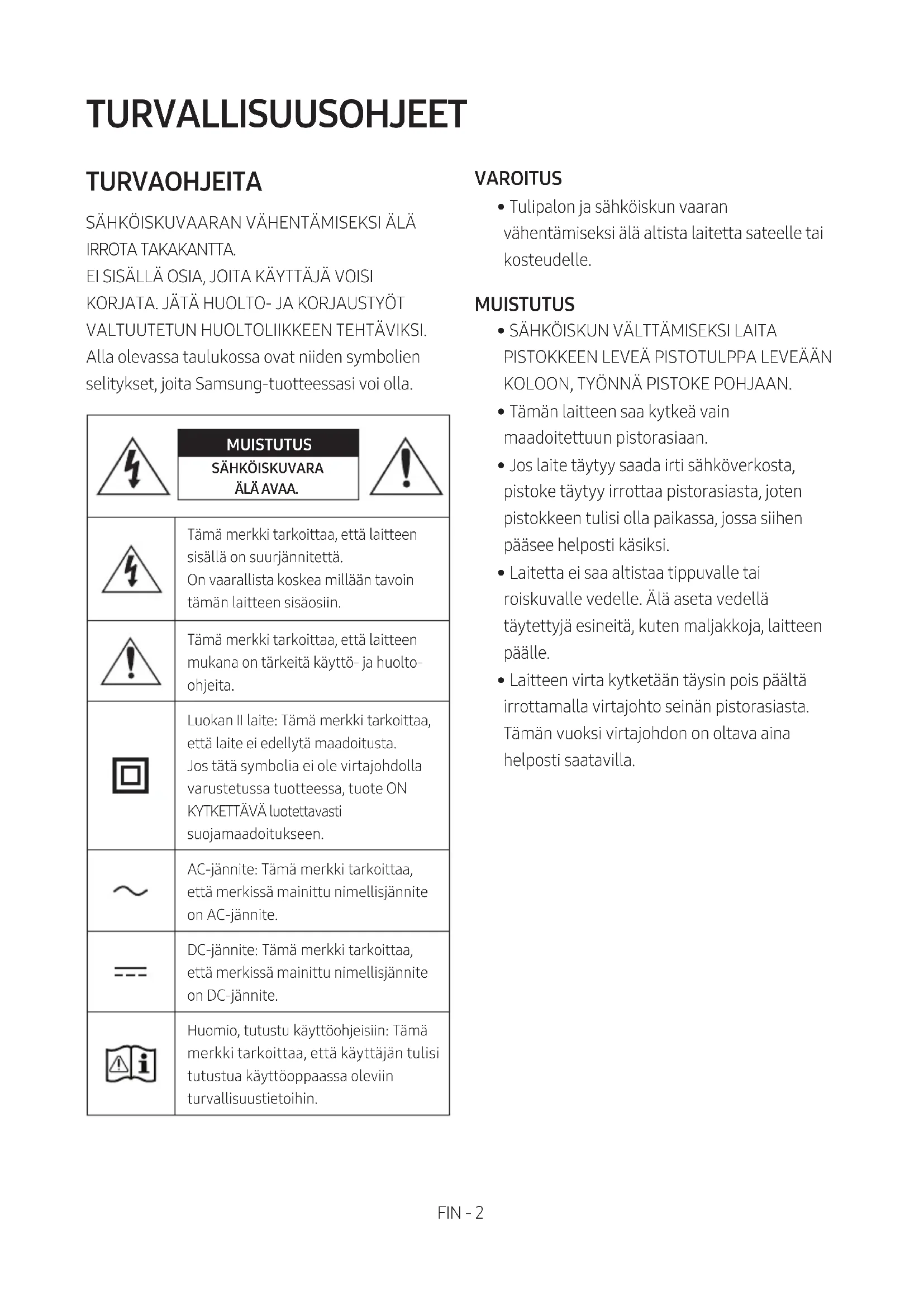 - Laitteen virta kytketään täysin pois päältä irrottamalla virtajohto seinän pistorasiasta. Tämän vuoksi virtajohdon on oltava aina helposti saatavilla.FIN - 3 TURVAOHJEET