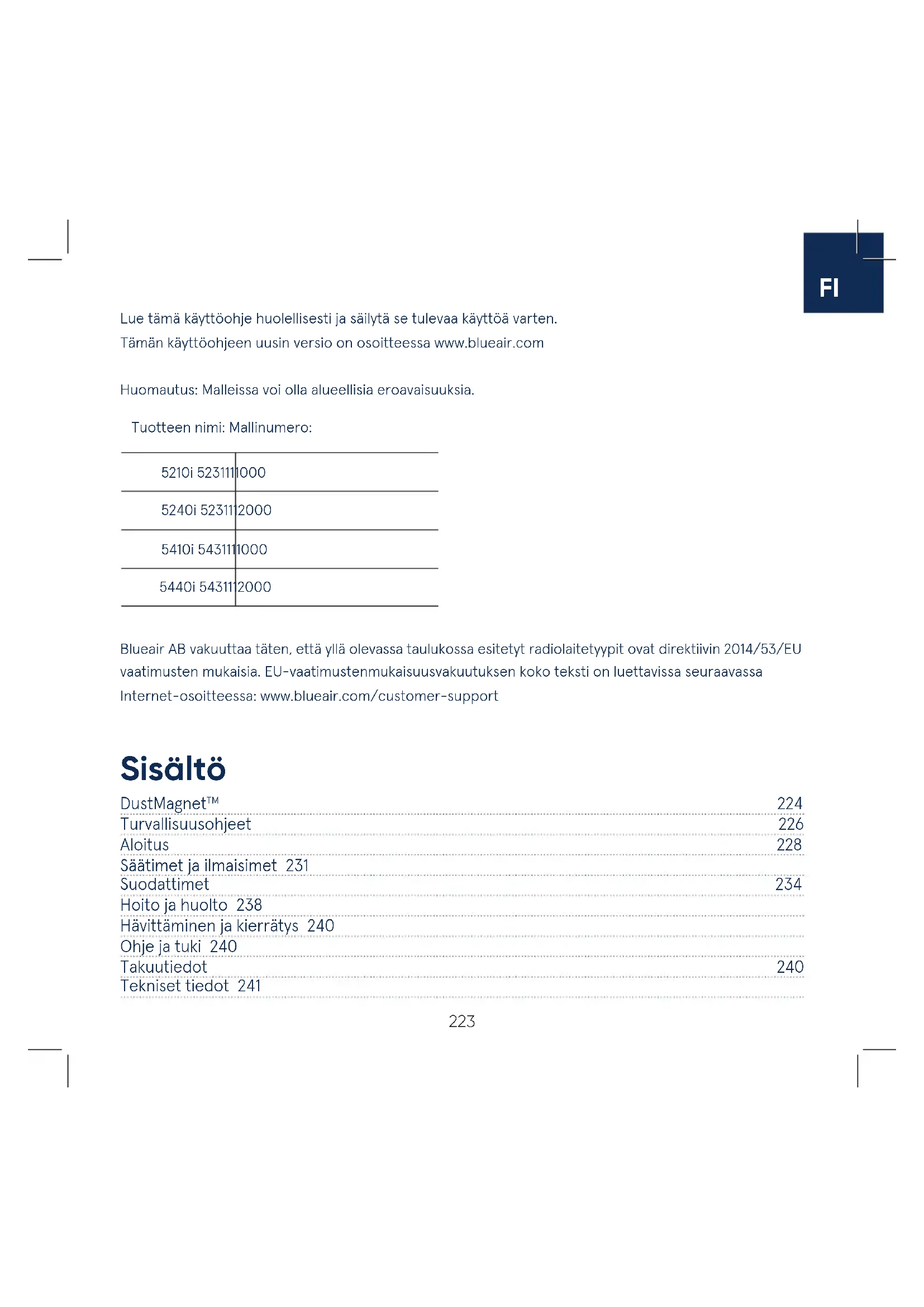 DustMagnet 224 Turvallisuusohjeet 226 Aloitus 228 Säätimet ja ilmaisimet 231 Suodattimet 234 Hoito ja huolto 238 Hävittäminen ja kierrätys 240 Ohje ja tuki 240 Takuutiedot 240 Tekniset tiedot 241 Sisältö Lue tämä käyttöohje huolellisesti ja säilytä se tulevaa käyttöä varten. Tämän käyttöohjeen uusin versio on osoitteessa www.blueair.com Huomautus: Malleissa voi olla alueellisia eroavaisuuksia. Blueair AB vakuuttaa täten, että yllä olevassa taulukossa esitetyt radiolaitetyypit ovat direktiivin 2014/53/EU vaatimusten mukaisia. EU-vaatimustenmukaisuusvakuutuksen koko teksti on luettavissa seuraavassa Internet-osoitteessa: www.blueair.com/customer-support Tuotteen nimi: Mallinumero: 5210i 5231111000 5240i 5231112000 5410i 5431111000 5440i 5431112000 TM224 Blueair DustMagnet