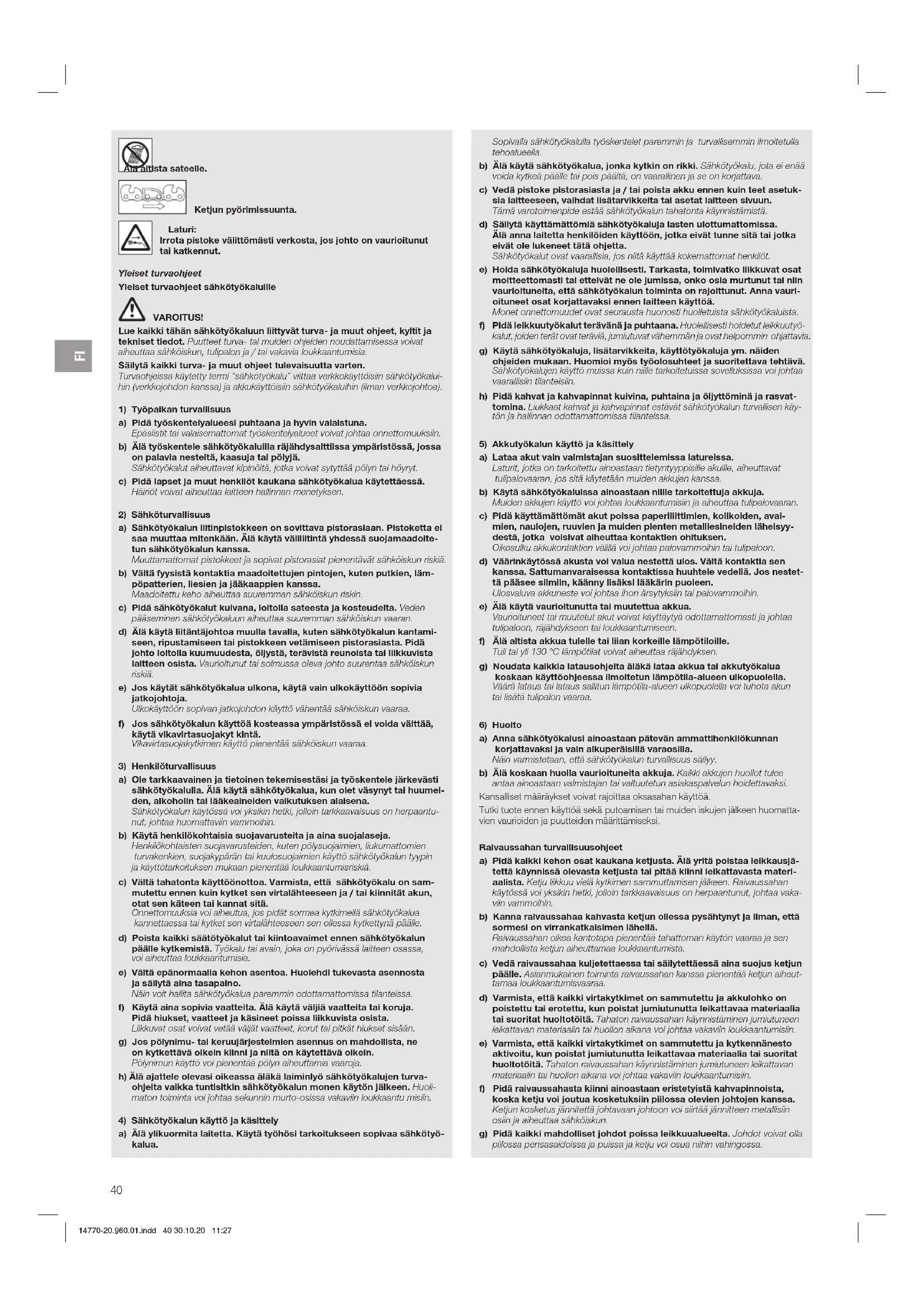 Ketjun pyörimissuunta. Laturi: Irrota pistoke välittömästi verkosta, jos johto on vaurioitunut tai katkennut. Yleiset turvaohjeet Yleiset turvaohjeet sähkötyökaluille VAROITUS! Lue kaikki tähän sähkötyökaluun liittyvät turva- ja muut ohjeet, kyltit ja tekniset tiedot. Puutteet turva- tai muiden ohjeiden noudattamisessa voivat aiheuttaa sähköiskun, tulipalon ja / tai vakavia loukkaantumisia. Säilytä kaikki turva- ja muut ohjeet tulevaisuutta varten. Turvaohjeissa käytetty termi “sähkötyökalu” viittaa verkkokäyttöisiin sähkötyökalui- hin (verkkojohdon kanssa) ja akkukäyttöisiin sähkötyökaluihin (ilman verkkojohtoa).