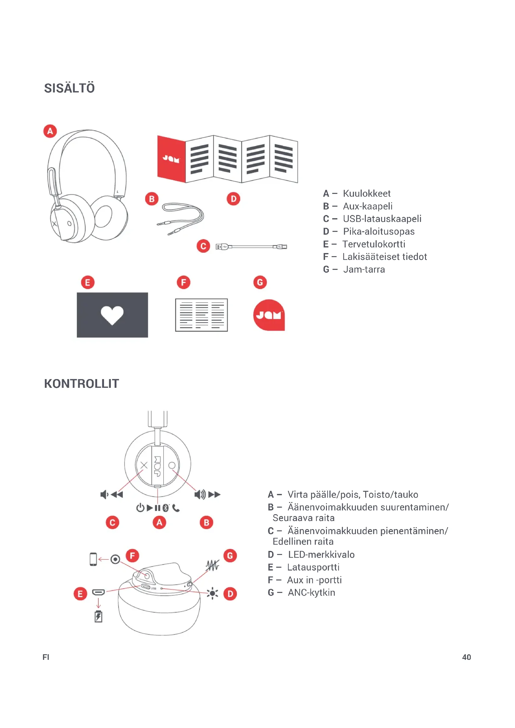 Tutti i diritti riservati. IB-HXHP303EN 39 “Out There” HX-HP303 Ohjekirja40 SISÄLTÖ A – Kuulokkeet B – Aux-kaapeli C – USB-latauskaapeli D – Pika-aloitusopas E – Tervetulokortti F – Lakisääteiset tiedot G – Jam-tarra KONTROLLIT A – Virta päälle/pois, Toisto/tauko B – Äänenvoimakkuuden suurentaminen/ Seuraava raita C – Äänenvoimakkuuden pienentäminen/ Edellinen raita D – LED-merkkivalo E – Latausportti F – Aux in -portti G – ANC-kytkin FI41