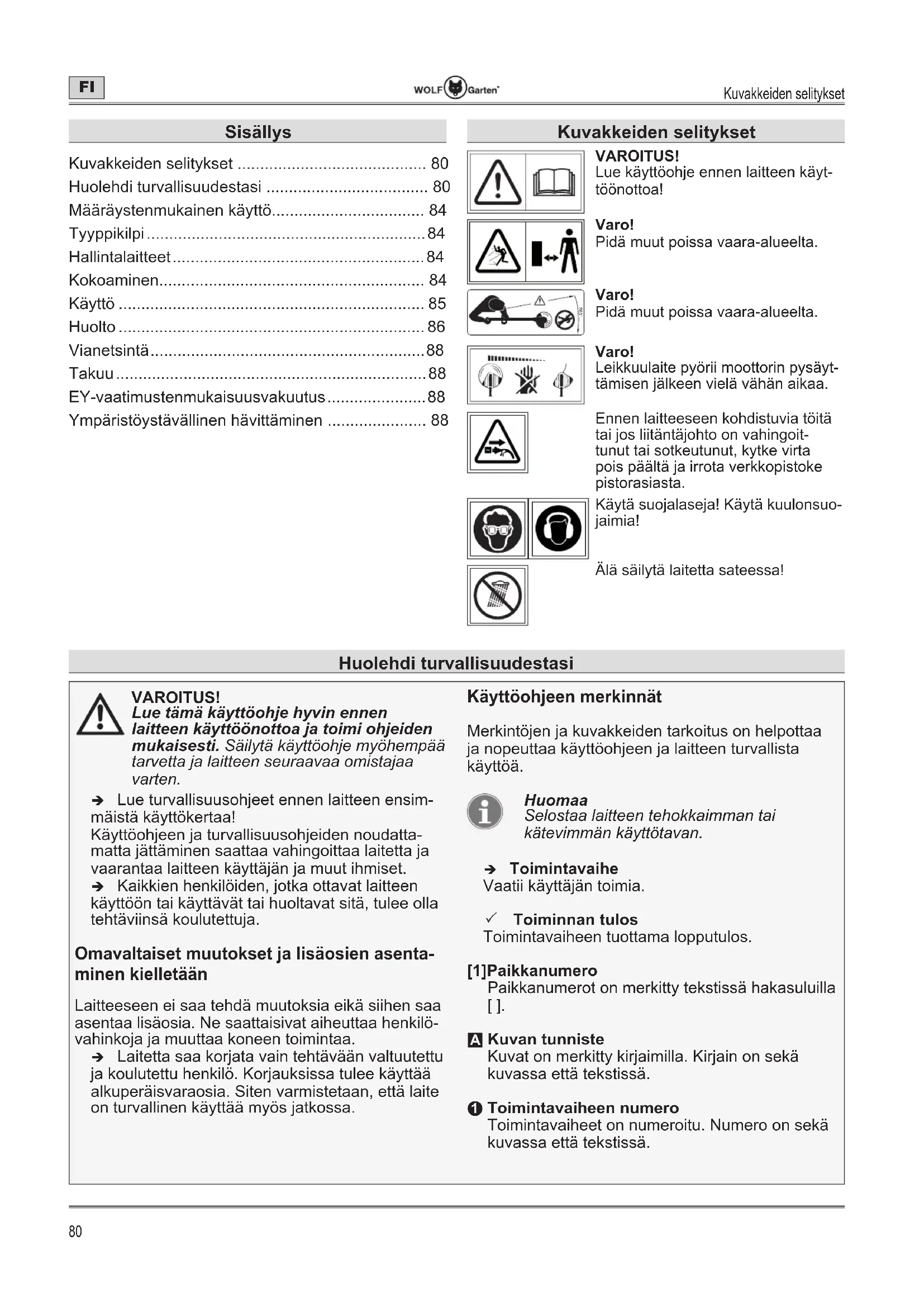 Toimintavaiheen numero Toimintavaiheet on numeroitu. Numero on sekä kuvassa että tekstissä. Kuvakkeiden selitykset .......................................... Huolehdi turvallisuudestasi .................................... Määräystenmukainen käyttö.................................. 84 Tyyppikilpi .............................................................. 84 Hallintalaitteet ........................................................ 84 Kokoaminen........................................................... 84 Käyttö .................................................................... 85 Huolto .................................................................... 86 Vianetsintä ............................................................. 88 Takuu ..................................................................... 88 EY-vaatimustenmukaisuusvakuutus ...................... 88 Ympäristöystävällinen hävittäminen ...................... 88 Huolehdi turvallisuudestasi Kuvakkeiden selitykset VAROITUS! Lue käyttöohje ennen laitteen käyt- töönottoa! Varo! Pidä muut poissa vaara-alueelta. 360° Varo! Pidä muut poissa vaara-alueelta. Varo! Leikkuulaite pyörii moottorin pysäyt- tämisen jälkeen vielä vähän aikaa. Ennen laitteeseen kohdistuvia töitä tai jos liitäntäjohto on vahingoit- tunut tai sotkeutunut, kytke virta pois päältä ja irrota verkkopistoke pistorasiasta. Käytä suojalaseja! Käytä kuulonsuo- jaimia! Älä säilytä laitetta sateessa! SisällysHuolehdi turvallisuudestasi