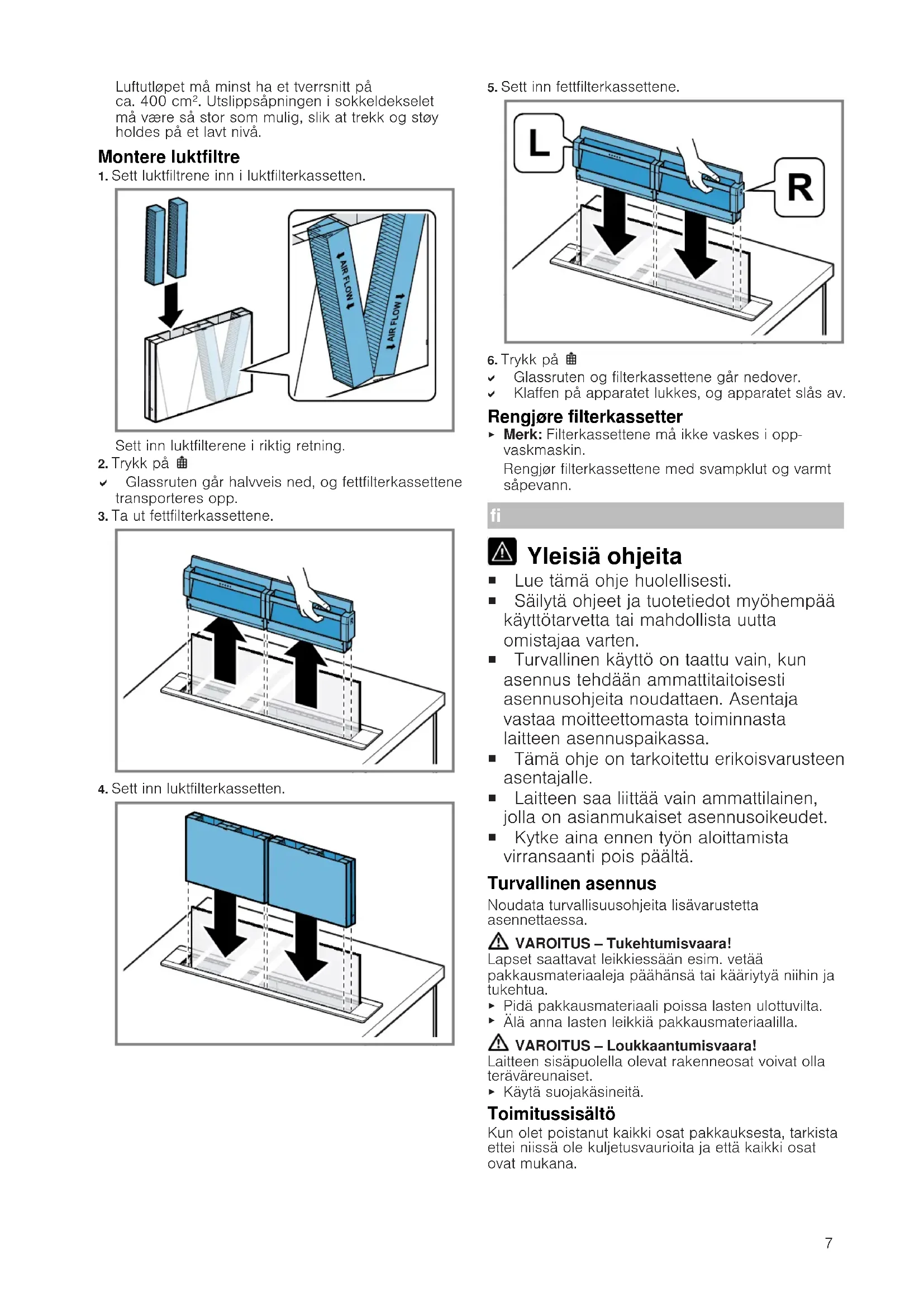 Yleisiä ohjeita ¡ Lue tämä ohje huolellisesti. ¡ Säilytä ohjeet ja tuotetiedot myöhempää käyttötarvetta tai mahdollista uutta omistajaa varten. ¡ Turvallinen käyttö on taattu vain, kun asennus tehdään ammattitaitoisesti asennusohjeita noudattaen. Asentaja vastaa moitteettomasta toiminnasta laitteen asennuspaikassa. ¡ Tämä ohje on tarkoitettu erikoisvarusteen asentajalle. ¡ Laitteen saa liittää vain ammattilainen, jolla on asianmukaiset asennusoikeudet. ¡ Kytke aina ennen työn aloittamista virransaanti pois päältä. Turvallinen asennus Noudata turvallisuusohjeita lisävarustetta asennettaessa. VAROITUS‒Tukehtumisvaara! Lapset saattavat leikkiessään esim. vetää pakkausmateriaaleja päähänsä tai kääriytyä niihin ja tukehtua.