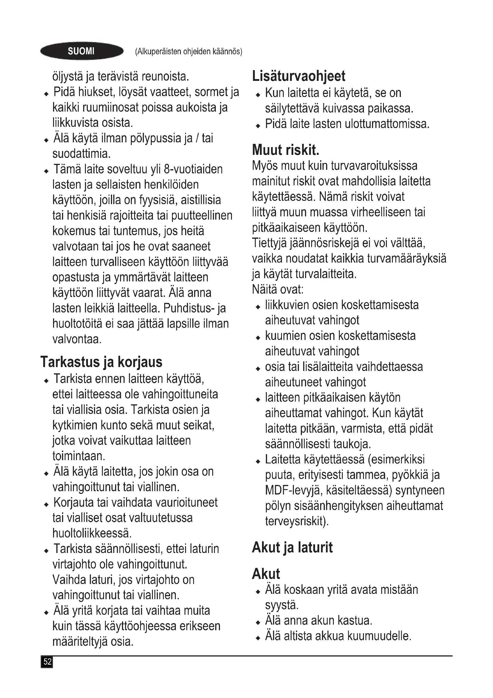 Varoitus! Lue kaikki turvalli- suusvaroitukset ja ohjeet. Alla olevien varoitusten ja ohjeiden noudattamisen laiminlyönti saattaa johtaa sähköiskuun, tulipaloon ja/tai vakavaan louk- kaantumiseen. Varoitus! Käytettäessä akkukäyttöisiä laitteita on aina noudatettava perusvarotoimenpiteitä palovaaran, vuotavien akkujen, henkilövahinkojen ja aineellisten vaurioiden välttämiseksi. Lue nämä ohjeet huolellisesti ennen laitteen käyttöä. uKäyttötarkoitus kuvataan näissä ohjeissa. Muiden kuin ohjeissa suositeltujen lisävarusteiden tai -osien käyttö sekä laitteen käyttö muuhun kuin oppaassa suositeltuun tarkoitukseen voi aiheuttaa henkilövahingon vaaran. Säilytä tämä käyttöohje tulevaa tarvetta varten. Laitteen käyttö u Älä käytä laitetta nesteiden tai syttyvien materiaalien keräämiseen. u Älä käytä laitetta veden lähellä.u Älä upota laitetta veteen.u Älä koskaan irrota laturia pistorasiasta vetämällä virtajohdosta. Pidä laturin virtajohto etäällä lämmönlähteistä, Miljøbeskyttelse