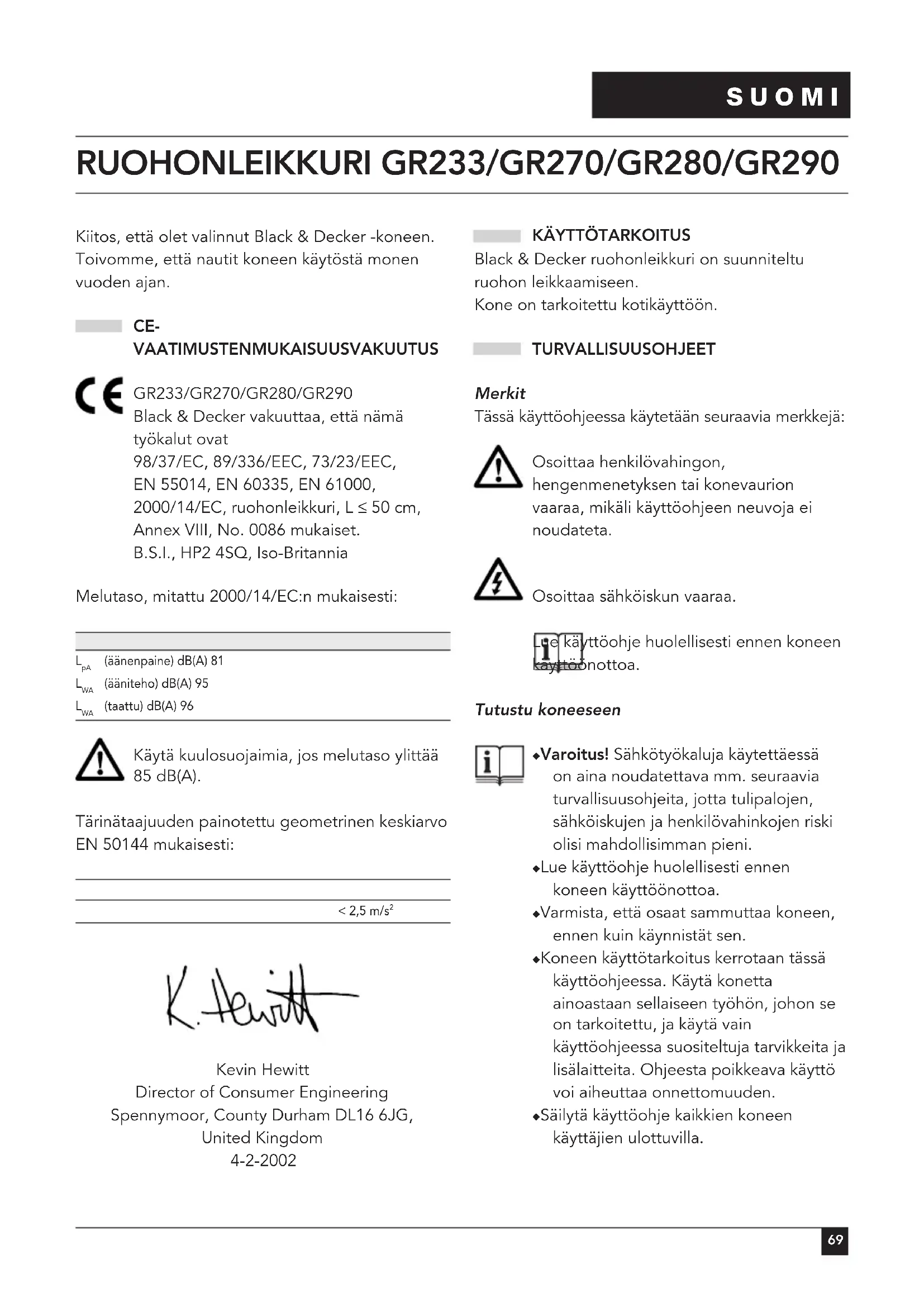Kiitos, että olet valinnut Black & Decker -koneen. Toivomme, että nautit koneen käytöstä monen vuoden ajan. CE- VAATIMUSTENMUKAISUUSVAKUUTUS GR233/GR270/GR280/GR290 Black & Decker vakuuttaa, että nämä työkalut ovat 98/37/EC, 89/336/EEC, 73/23/EEC, EN 55014, EN 60335, EN 61000, 2000/14/EC, ruohonleikkuri, L ≤ 50 cm, Annex VIII, No. 0086 mukaiset. B.S.I., HP2 4SQ, Iso-Britannia Melutaso, mitattu 2000/14/EC:n mukaisesti: