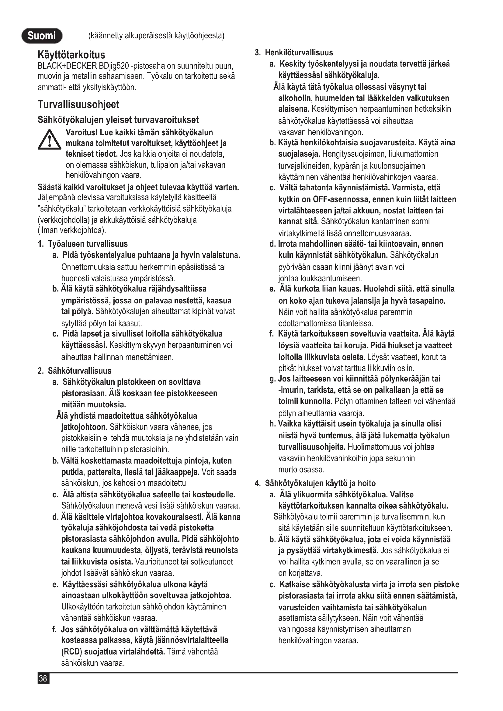 (käännetty alkuperäisestä käyttöohjeesta) Suomi (käännetty alkuperäisestä käyttöohjeesta) Käyttötarkoitus BLACK+DECKER BDjig520 -pistosaha on suunniteltu puun, muovin ja metallin sahaamiseen. Työkalu on tarkoitettu sekä ammatti- että yksityiskäyttöön. Turvallisuusohjeet Sähkötyökalujen yleiset turvavaroitukset
