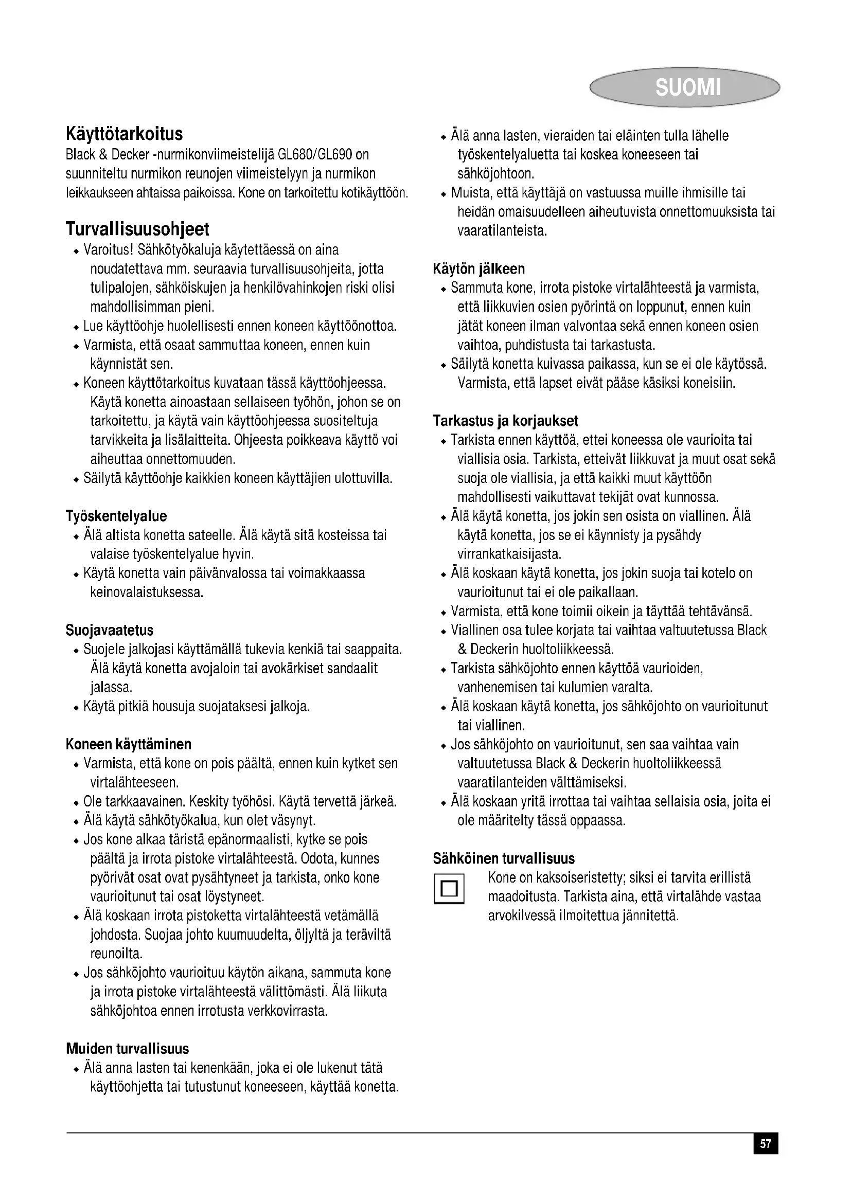 01-10-2002 Reservedele / reparationer Reservedele kan købes hos autoriserede Black & Decker serviceværksteder, som giver forslag til omkostninger og reparerer vore produkter. Oversigt over vore autoriserede værksteder findes på internettet på vor hjemmeside www.blackdecker.dk samt www.2helpU.com. Garanti Black & Decker garanterer, at produktet er fri for materielle skader og/eller fabrikationsfejl ved levering til kunden. Garantien er et tillæg til konsumentens lovlige rettigheder og påvirker ikke disse. Garantien gælder indenfor medlemsstaterne af den Europæiske Union og i det Europæiske Frihandelsområde. Hvis et Black & Decker produkt går i stykker på grund af materiel skade og/eller fabrikationsfejl eller på anden måde ikke fungerer i overensstemmelse med specifikationen, inden for 24 måneder fra købsdatoen, påtager Black & Decker sig at reparere eller ombytte produktet med mindst muligt besvær for kunden. Garantien gælder ikke for fejl og mangler, der er sket i forbindelse med: ◆ normal slitage ◆ uheldige følger efter unormal anvendelse af værktøjet ◆ overbelastning, hærværk eller overdrevent intensivt brug af værktøjet ◆ ulykkeshændelse Garantien gælder ikke hvis reparationer er udført af nogen anden end et autoriseret Black & Decker værksted. For at udnytte garantien skal produktet og købskvitteringen indleveres til forhandleren eller til et autoriseret værksted, senest 2 måneder efter at fejlen opdages. For information om nærmeste autoriserede værksted: kontakt det lokale Black & Decker kontor på den adresse som er opgivet i brugsanvisningen. Liste over alle autoriserede Black & Decker serviceværksteder samt servicevilkår er tilgængelig på internettet, på adressen www.2helpU.com.57 SUOMI Käyttötarkoitus Black & Decker -nurmikonviimeistelijä GL680/GL690 on suunniteltu nurmikon reunojen viimeistelyyn ja nurmikon leikkaukseen ahtaissa paikoissa. Kone on tarkoitettu kotikäyttöön. Turvallisuusohjeet ◆ Varoitus! Sähkötyökaluja käytettäessä on aina noudatettava mm. seuraavia turvallisuusohjeita, jotta tulipalojen, sähköiskujen ja henkilövahinkojen riski olisi mahdollisimman pieni. ◆ Lue käyttöohje huolellisesti ennen koneen käyttöönottoa. ◆ Varmista, että osaat sammuttaa koneen, ennen kuin käynnistät sen. ◆ Koneen käyttötarkoitus kuvataan tässä käyttöohjeessa. Käytä konetta ainoastaan sellaiseen työhön, johon se on tarkoitettu, ja käytä vain käyttöohjeessa suositeltuja tarvikkeita ja lisälaitteita. Ohjeesta poikkeava käyttö voi aiheuttaa onnettomuuden. ◆ Säilytä käyttöohje kaikkien koneen käyttäjien ulottuvilla. Työskentelyalue ◆ Älä altista konetta sateelle. Älä käytä sitä kosteissa tai valaise työskentelyalue hyvin. ◆ Käytä konetta vain päivänvalossa tai voimakkaassa keinovalaistuksessa. Suojavaatetus ◆ Suojele jalkojasi käyttämällä tukevia kenkiä tai saappaita. Älä käytä konetta avojaloin tai avokärkiset sandaalit jalassa. ◆ Käytä pitkiä housuja suojataksesi jalkoja. Koneen käyttäminen ◆ Varmista, että kone on pois päältä, ennen kuin kytket sen virtalähteeseen. ◆ Ole tarkkaavainen. Keskity työhösi. Käytä tervettä järkeä. ◆ Älä käytä sähkötyökalua, kun olet väsynyt. ◆ Jos kone alkaa täristä epänormaalisti, kytke se pois päältä ja irrota pistoke virtalähteestä. Odota, kunnes pyörivät osat ovat pysähtyneet ja tarkista, onko kone vaurioitunut tai osat löystyneet. ◆ Älä koskaan irrota pistoketta virtalähteestä vetämällä johdosta. Suojaa johto kuumuudelta, öljyltä ja teräviltä reunoilta. ◆ Jos sähköjohto vaurioituu käytön aikana, sammuta kone ja irrota pistoke virtalähteestä välittömästi. Älä liikuta sähköjohtoa ennen irrotusta verkkovirrasta. Muiden turvallisuus ◆ Älä anna lasten tai kenenkään, joka ei ole lukenut tätä käyttöohjetta tai tutustunut koneeseen, käyttää konetta. ◆ Älä anna lasten, vieraiden tai eläinten tulla lähelle työskentelyaluetta tai koskea koneeseen tai sähköjohtoon. ◆ Muista, että käyttäjä on vastuussa muille ihmisille tai heidän omaisuudelleen aiheutuvista onnettomuuksista tai vaaratilanteista. Käytön jälkeen ◆ Sammuta kone, irrota pistoke virtalähteestä ja varmista, että liikkuvien osien pyörintä on loppunut, ennen kuin jätät koneen ilman valvontaa sekä ennen koneen osien vaihtoa, puhdistusta tai tarkastusta. ◆ Säilytä konetta kuivassa paikassa, kun se ei ole käytössä. Varmista, että lapset eivät pääse käsiksi koneisiin. Tarkastus ja korjaukset ◆ Tarkista ennen käyttöä, ettei koneessa ole vaurioita tai viallisia osia. Tarkista, etteivät liikkuvat ja muut osat sekä suoja ole viallisia, ja että kaikki muut käyttöön mahdollisesti vaikuttavat tekijät ovat kunnossa. ◆ Älä käytä konetta, jos jokin sen osista on viallinen. Älä käytä konetta, jos se ei käynnisty ja pysähdy virrankatkaisijasta. ◆ Älä koskaan käytä konetta, jos jokin suoja tai kotelo on vaurioitunut tai ei ole paikallaan. ◆ Varmista, että kone toimii oikein ja täyttää tehtävänsä. ◆ Viallinen osa tulee korjata tai vaihtaa valtuutetussa Black & Deckerin huoltoliikkeessä. ◆ Tarkista sähköjohto ennen käyttöä vaurioiden, vanhenemisen tai kulumien varalta. ◆ Älä koskaan käytä konetta, jos sähköjohto on vaurioitunut tai viallinen. ◆ Jos sähköjohto on vaurioitunut, sen saa vaihtaa vain valtuutetussa Black & Deckerin huoltoliikkeessä vaaratilanteiden välttämiseksi. ◆ Älä koskaan yritä irrottaa tai vaihtaa sellaisia osia, joita ei ole määritelty tässä oppaassa. Sähköinen turvallisuus Kone on kaksoiseristetty; siksi ei tarvita erillistä maadoitusta. Tarkista aina, että virtalähde vastaa arvokilvessä ilmoitettua jännitettä.58 SUOMI Lisäturvallisuusohjeet nurmikonviimeistelijälle Koneessa on seuraavat varoitusmerkit: Lue käyttöohje huolellisesti ennen koneen käyttöönottoa. Käy